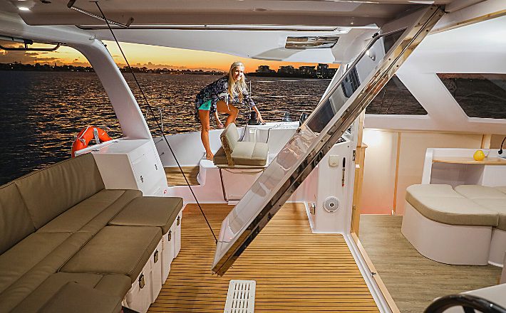 Step aboard Serendipity and immerse yourself in the seamless indoor/outdoor design, offering an unparalleled indoor area with comfortable lounge seating, a protected cockpit lounge, and a stylish daybed for relaxation in the saloon area. The boat boasts a vast deck space with two trampolines for sunbathing, a bathroom with a shower, and ample cover to cater to all weather conditions. Whether you’re celebrating a milestone or simply enjoying a day out, the captain can guide you to Sydney’s secluded coves for a refreshing swim, enhancing the boat hire experience.