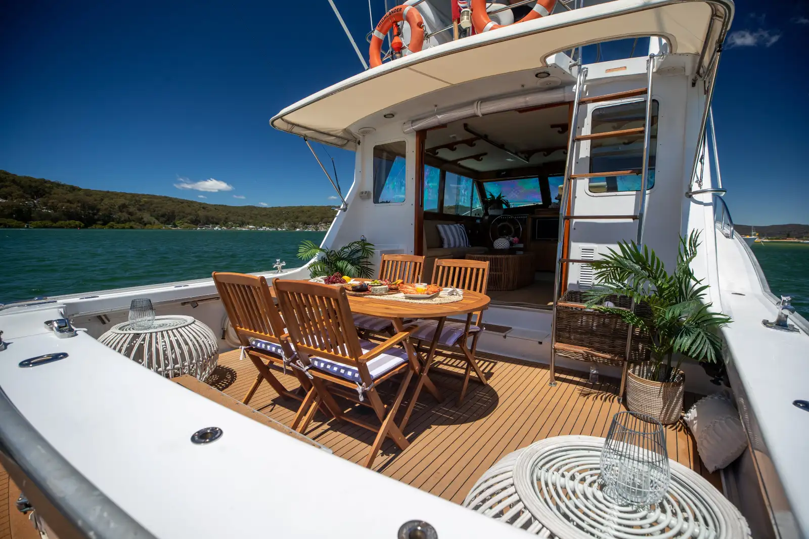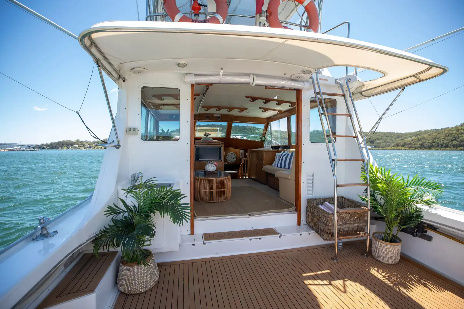 With a capacity to accommodate up to 18 guests, the Highlander ensures everyone can relish the beauty of Sydney Harbour. The vessel’s spacious aft deck, covered by a retractable shade cloth, provides a relaxed vibe and ample room for guests to unwind and enjoy the picturesque surroundings. Whether you prefer a formal dining setup or space for activities, the boat’s versatility allows for a customised experience tailored to your needs. Step inside to the generously sized lounge area adorned with classic wooden paneling and modern coastal touches, offering a comfortable retreat from the sun or a cozy spot to revel in the cool sea breeze.
