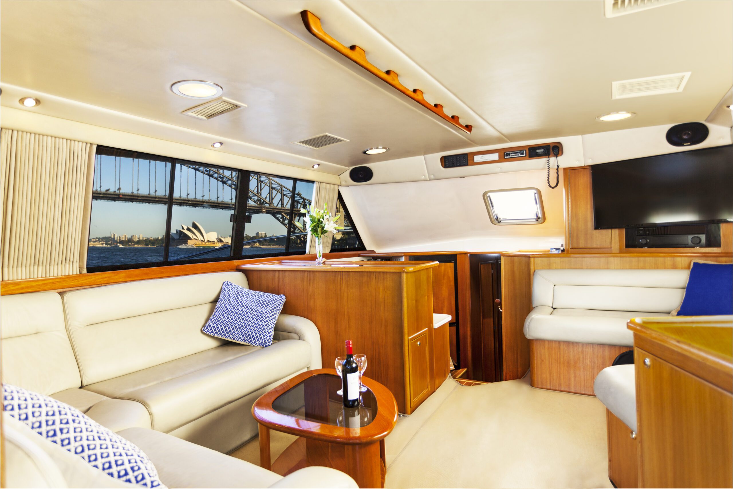 Platinum offers a bespoke experience on Sydney Harbour, designed with three open-plan areas to maximize space and comfort for up to 22 guests. The interior is expansive and luxurious, featuring oversized leather lounges, a fully equipped galley with dishwasher and ice maker, and a climate-controlled environment that ensures year-round comfort. Three private rooms provide secure storage and convenient changing areas, while the front deck offers an expansive sun-soaked retreat with comfortable sunbeds perfect for relaxation.