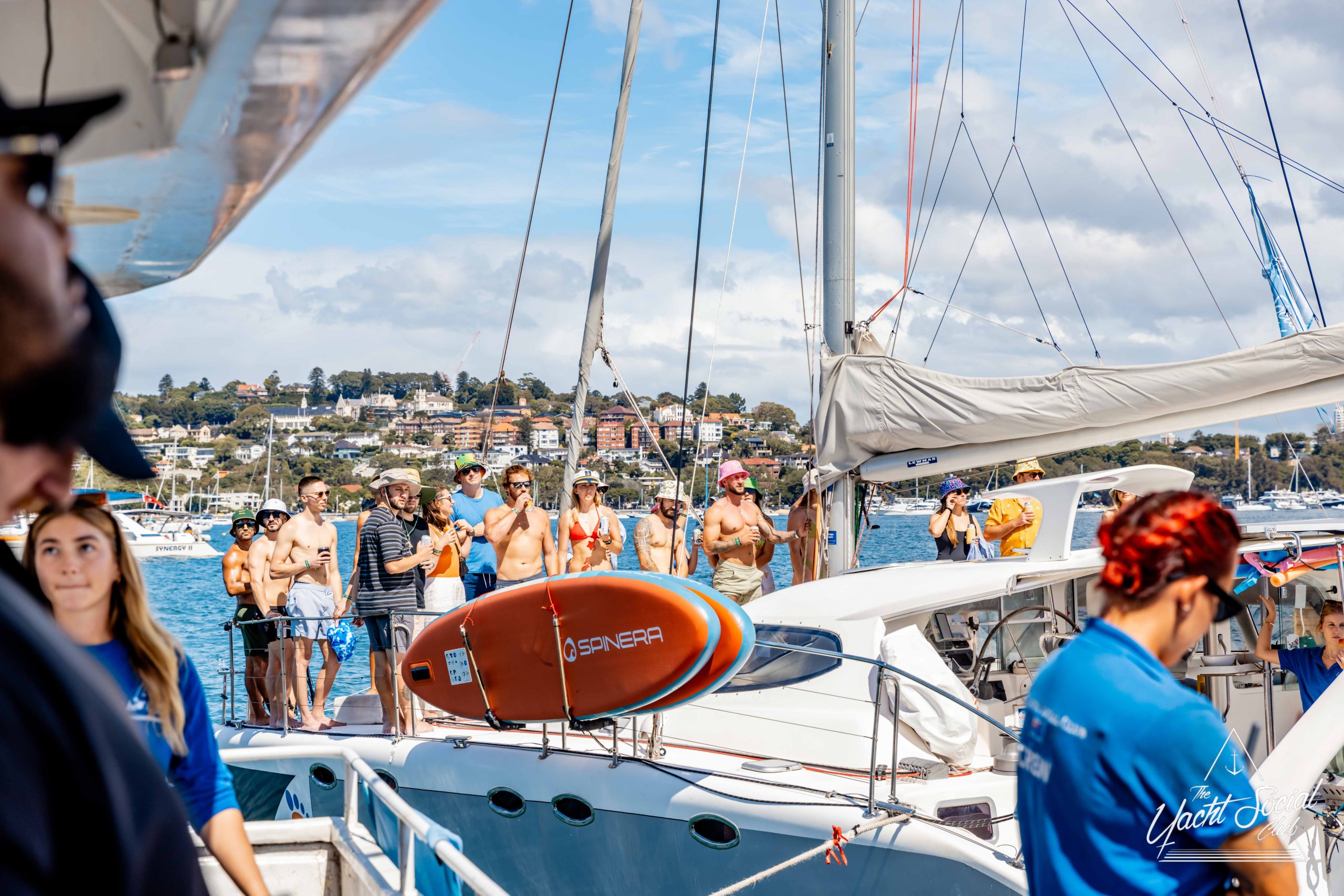 A man flips off an inflatable slide on a boat filled with people, while others watch from the deck. The boat is on a calm body of water under a clear blue sky. A sailboat mast is visible to the right, and several people are enjoying a sunny day at The Yacht Social Club Sydney Boat Hire.