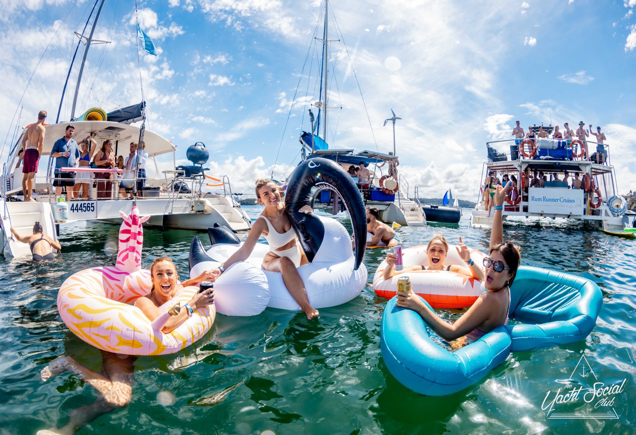 People are enjoying a sunny day on the water, floating on colorful inflatable rings near a docked boat. They are smiling, holding drinks, and having fun under a bright, clear sky. The boat in the background has a visible name along with the logo "Boat Parties Sydney The Yacht Social Club.