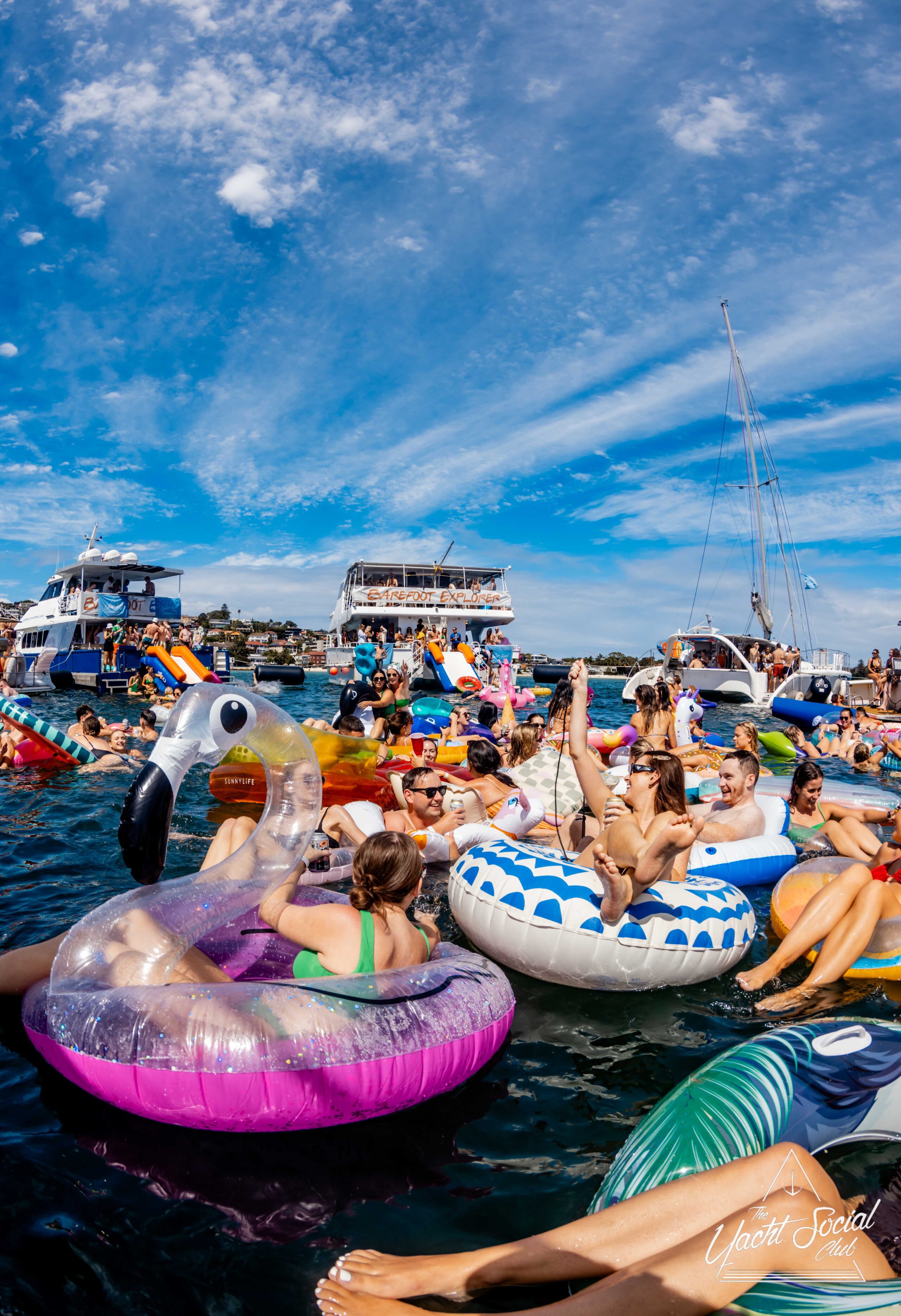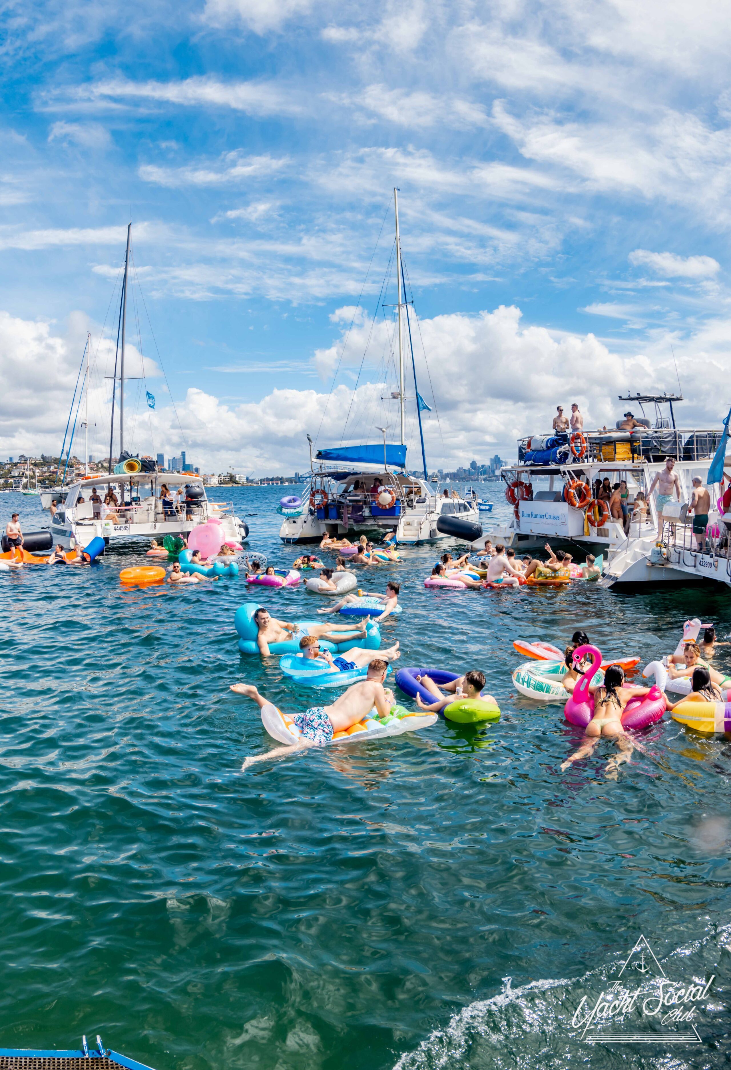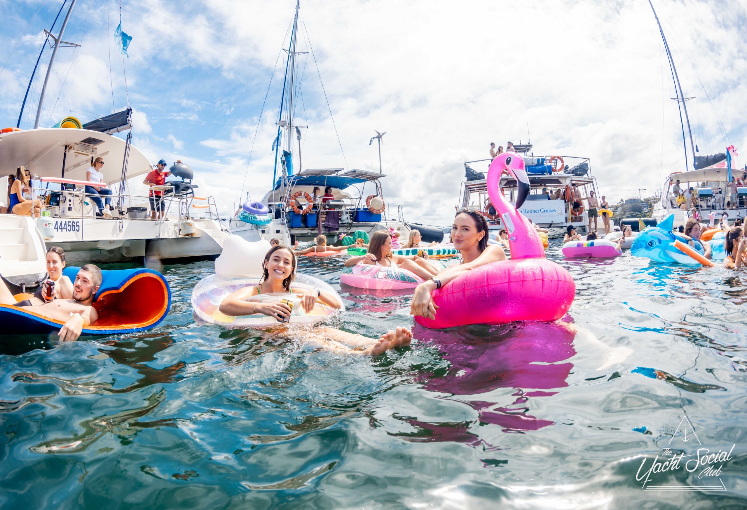 People enjoying a sunny day in the water, with some floating on inflatable pool toys and others swimming. Several boats from The Yacht Social Club Sydney Boat Hire are in the background, and the atmosphere appears lively and festive.
