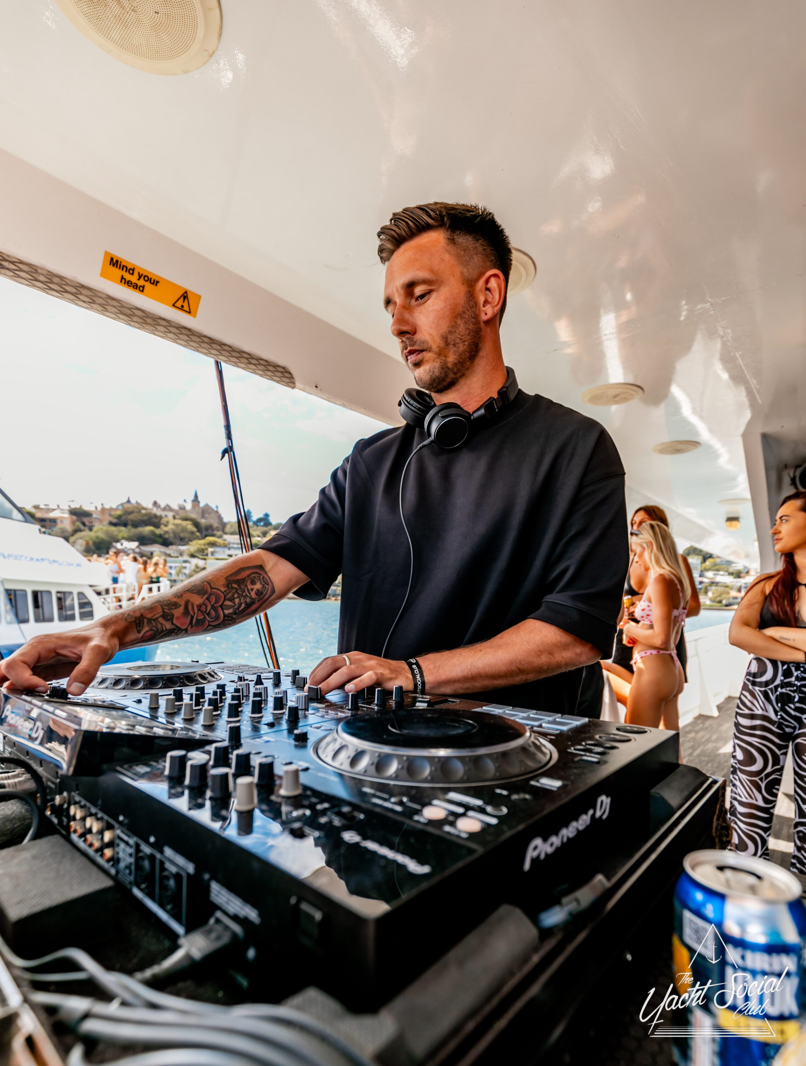 A lively scene unfolds as a group of people in colorful swimwear dance and socialize on a luxury yacht. One person holds an inflatable unicorn while a DJ plays music on a deck with the "Yacht Social Club" logo. The boat is surrounded by water and other vessels, capturing the essence of Sydney Harbour Boat Hire.
