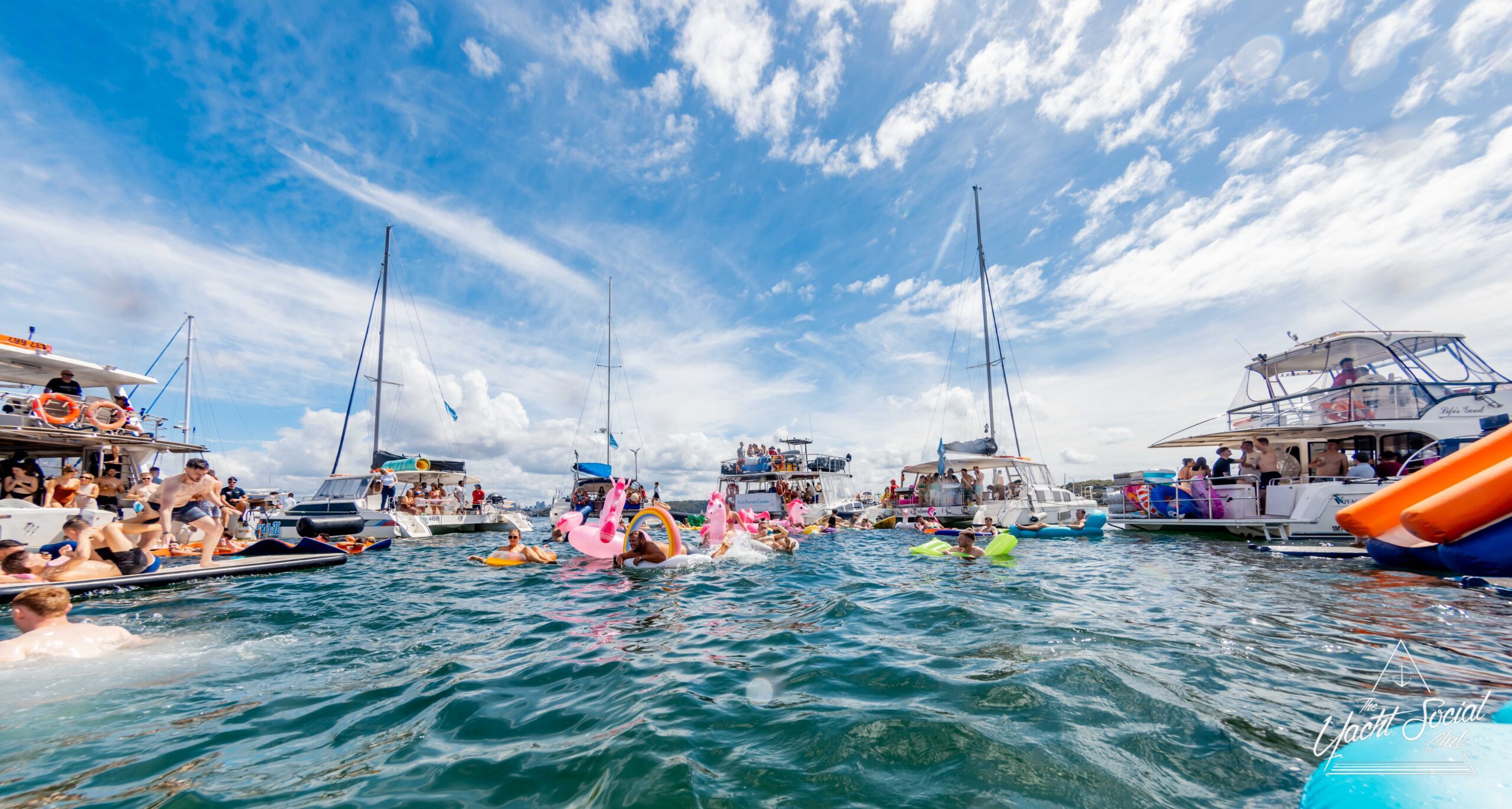 A lively boat party is in full swing with many people enjoying themselves on and around several yachts. Some are in the water on inflatables, while others dance and socialize on the boats. The Yacht Social Club Event Boat Charters adds a touch of elegance to the festive atmosphere under a bright sky with scattered clouds.