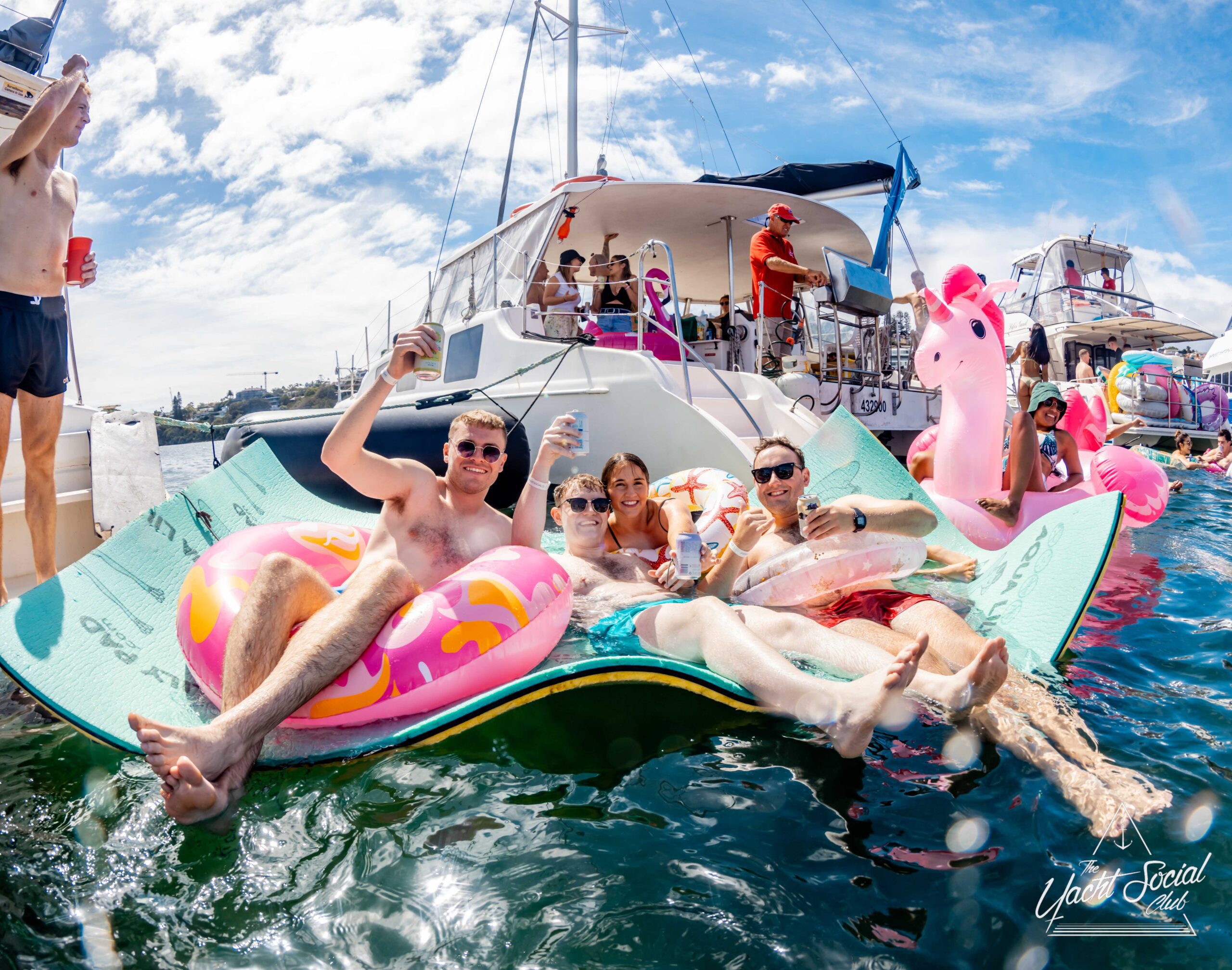 A group of people enjoying a sunny day on the water, surrounded by boats. Some are on pool floats, including a unicorn and donut float. They are laughing and engaging in a lively, fun atmosphere. The sky is clear with some clouds. The logo "The Yacht Social Club Sydney Boat Hire" is visible.