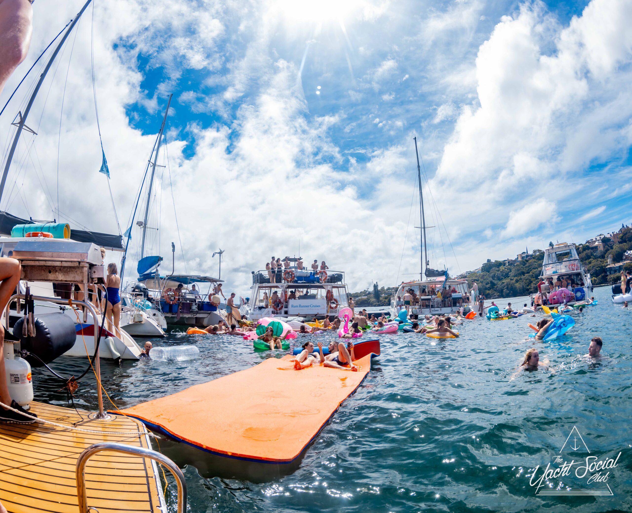 A group of people enjoying a sunny day on the water, lounging on an orange inflatable mat, and socializing on various boats and floating toys around them. The background features clear blue skies and more watercraft. Logo text reads "The Yacht Social Club: Sydney Harbour Boat Hire.