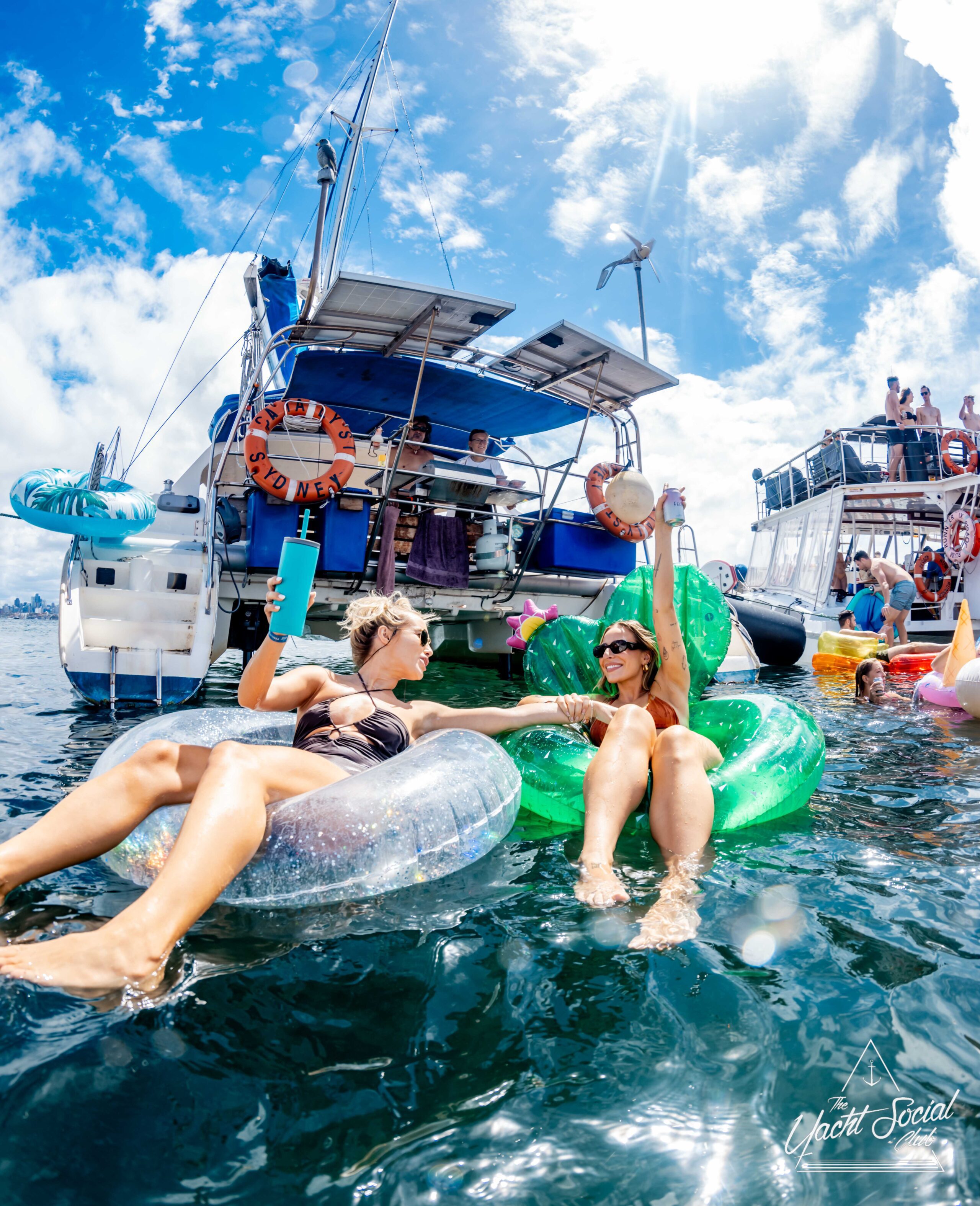 Two women enjoying a sunny day on a boat, one holding a drink and the other raising her arm. They are surrounded by other boats and people in the water on inflatables. The scene is lively with bright blue skies. "Yacht Social Club" text is in the bottom right corner. Experience it with Luxury Yacht Rentals Sydney!
