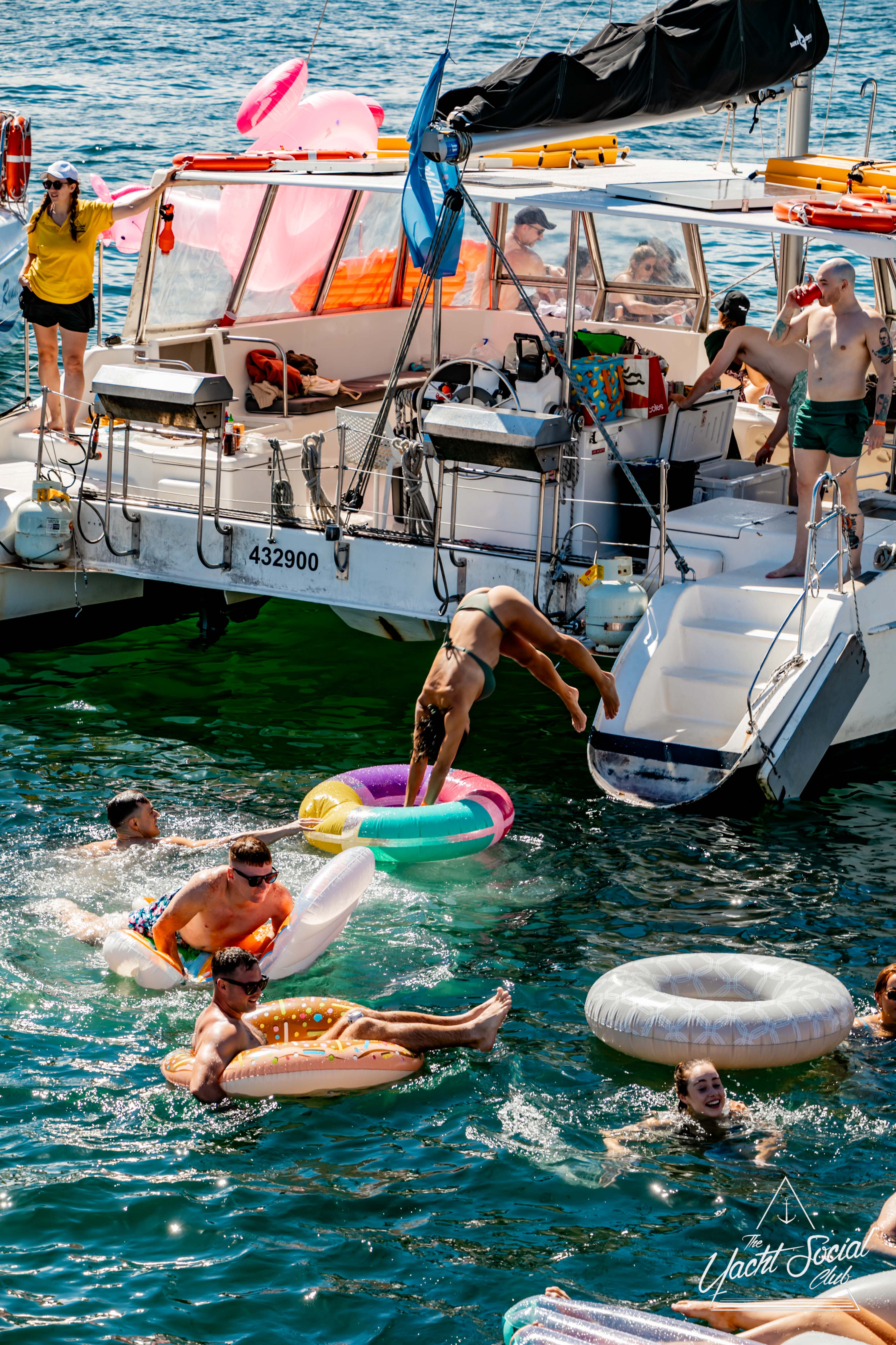 A lively group of people are enjoying a sunny day with The Yacht Social Club Event Boat Charters. Some are dancing and socializing on the boat's deck, while others are playing and splashing in the water near a floating platform. Everyone appears to be in swimsuits, having fun.