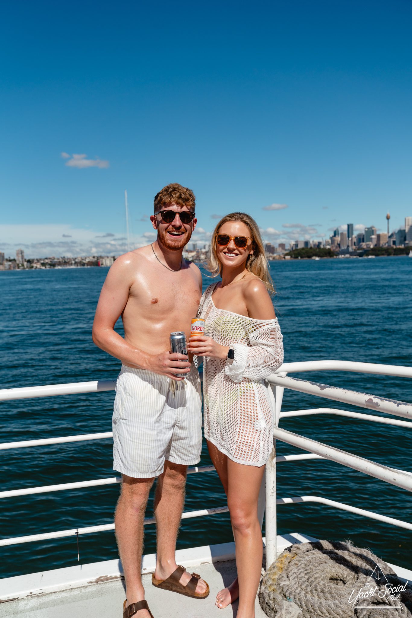 A man and woman, both wearing sunglasses, smile and hold drinks while standing on a boat with a body of water and city skyline in the background. The man is shirtless and in shorts, while the woman is wearing a swimsuit and a white cover-up. It appears to be a sunny day, perfect for The Yacht Social Club Sydney Boat Hire.