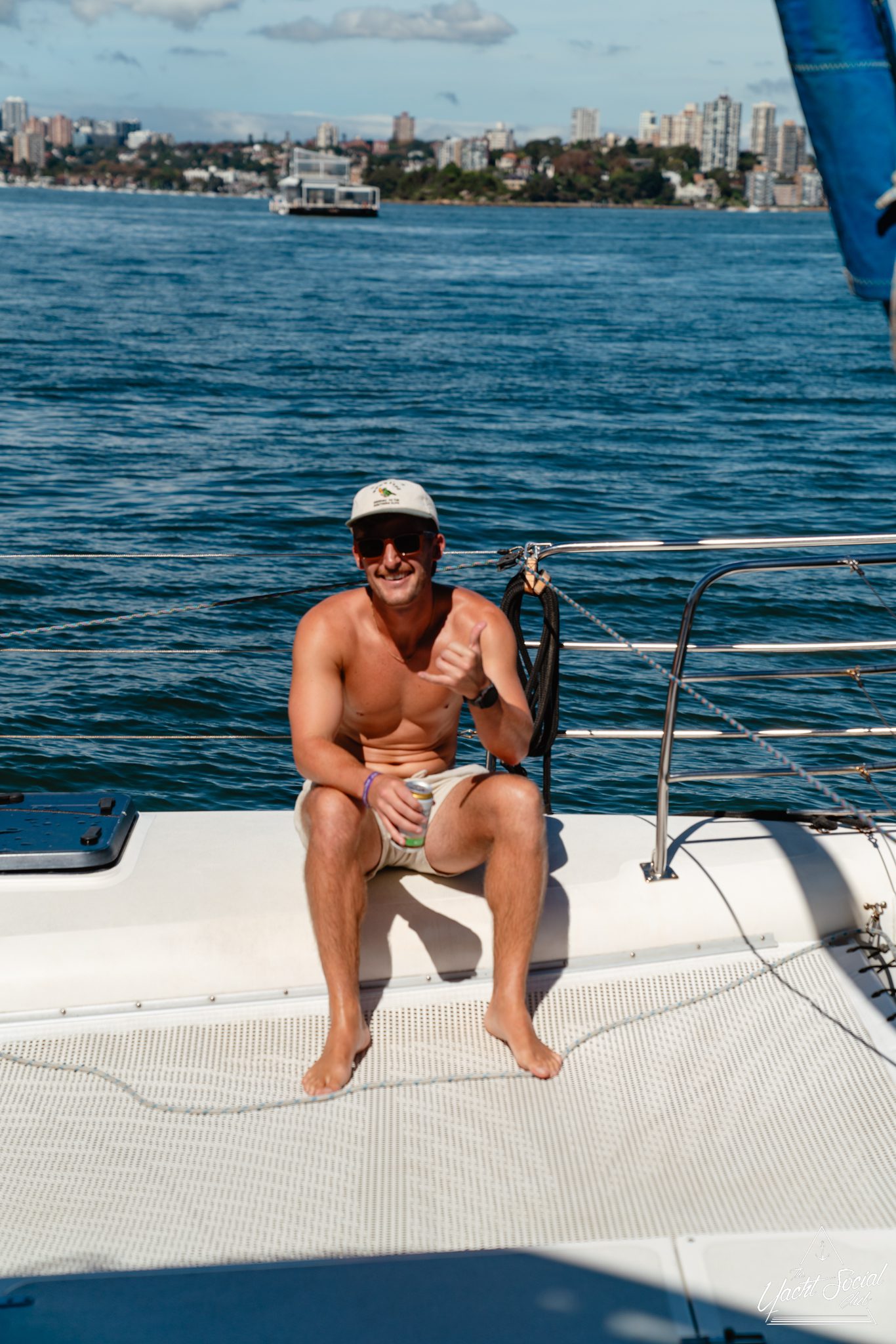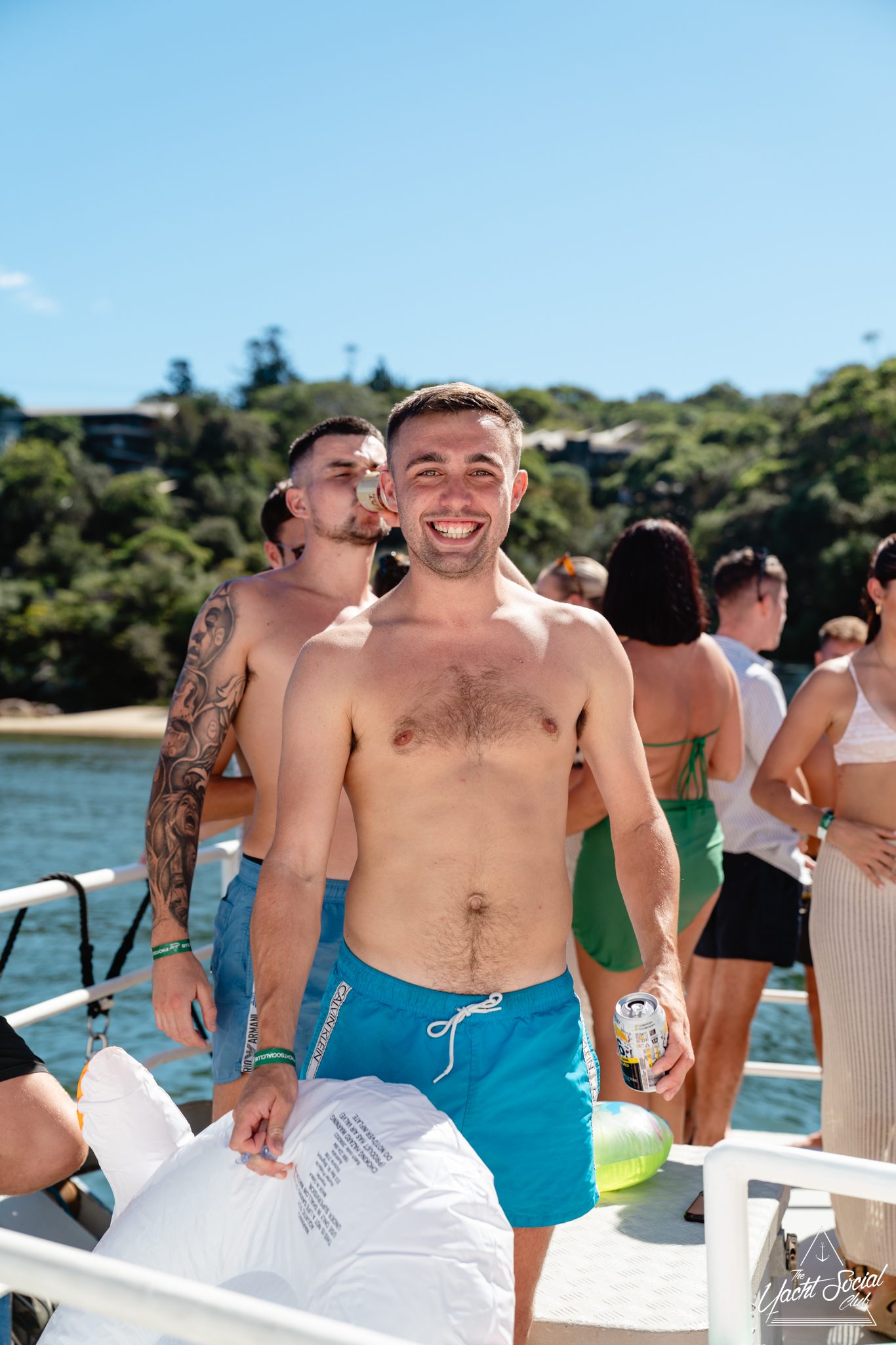 A shirtless man in blue swim trunks stands on a boat, smiling and holding a drink can. Other casually dressed individuals are around him, some in swimwear. The background features water and a tree-covered shoreline under a clear blue sky, perfect for Luxury Yacht Rentals Sydney's spectacular escapes.