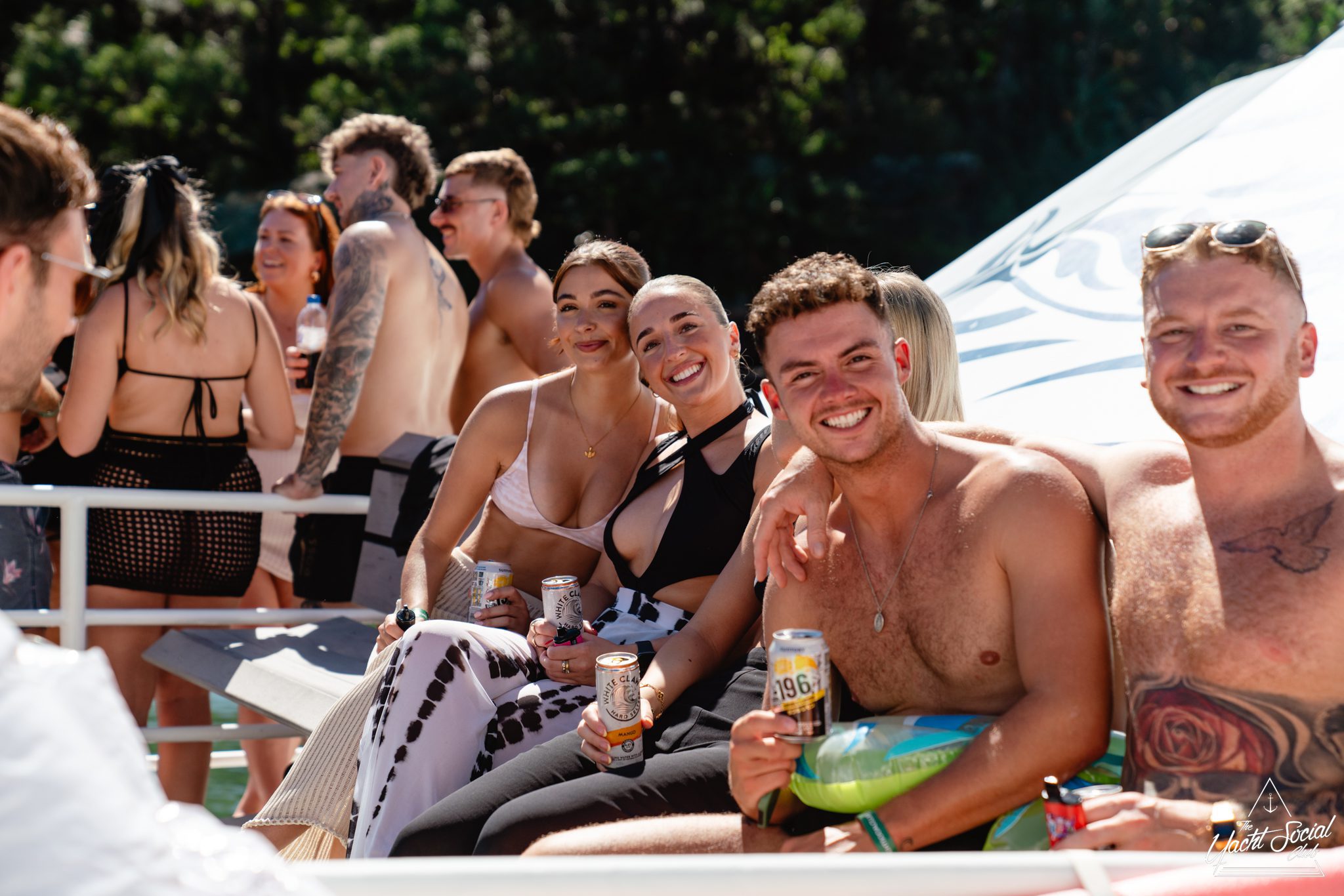 A group of people in swimwear are smiling and holding canned drinks while sitting on a boat under the sun. Trees are visible in the background. Everyone looks happy and relaxed, enjoying The Yacht Social Club Event Boat Charters outdoor setting.