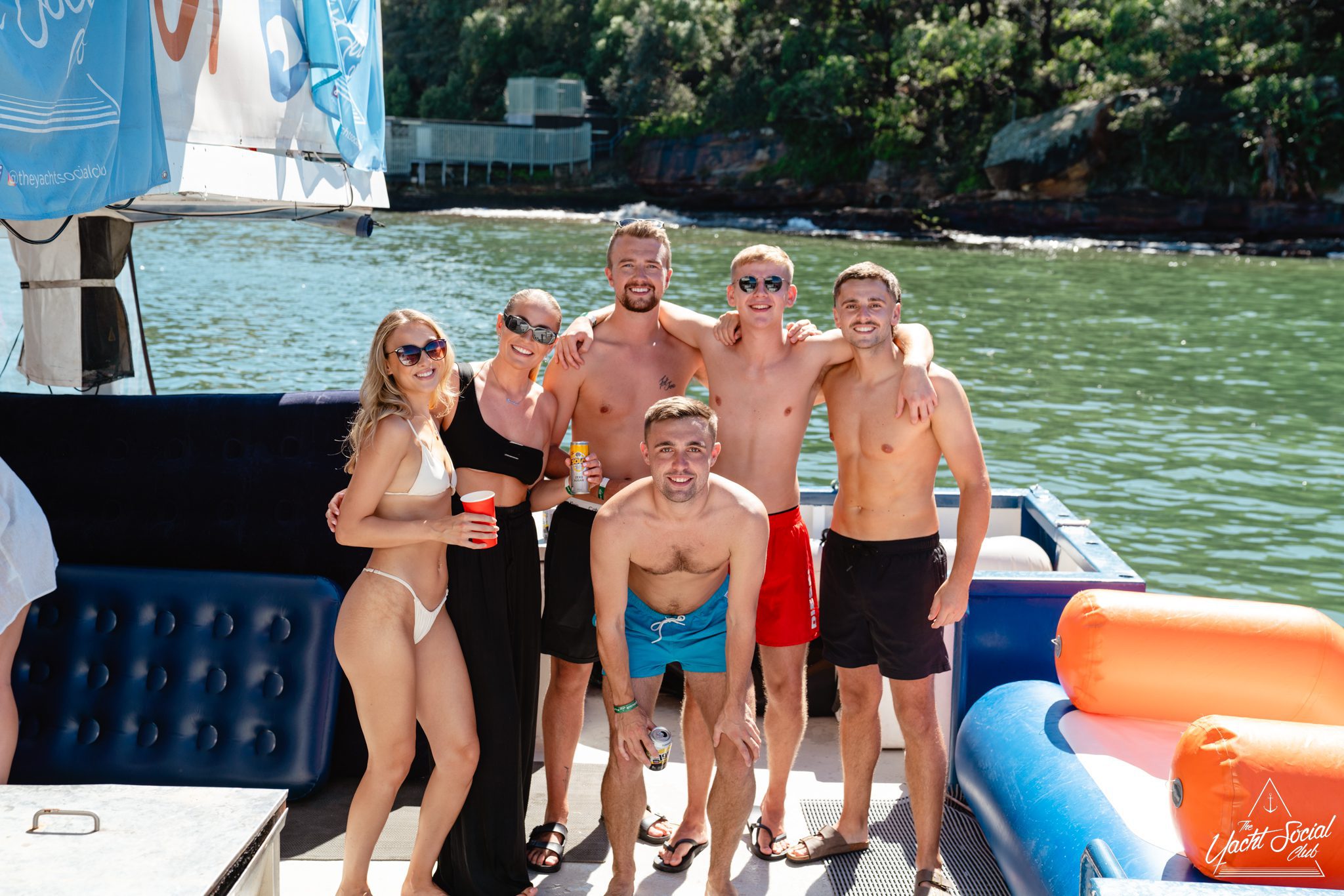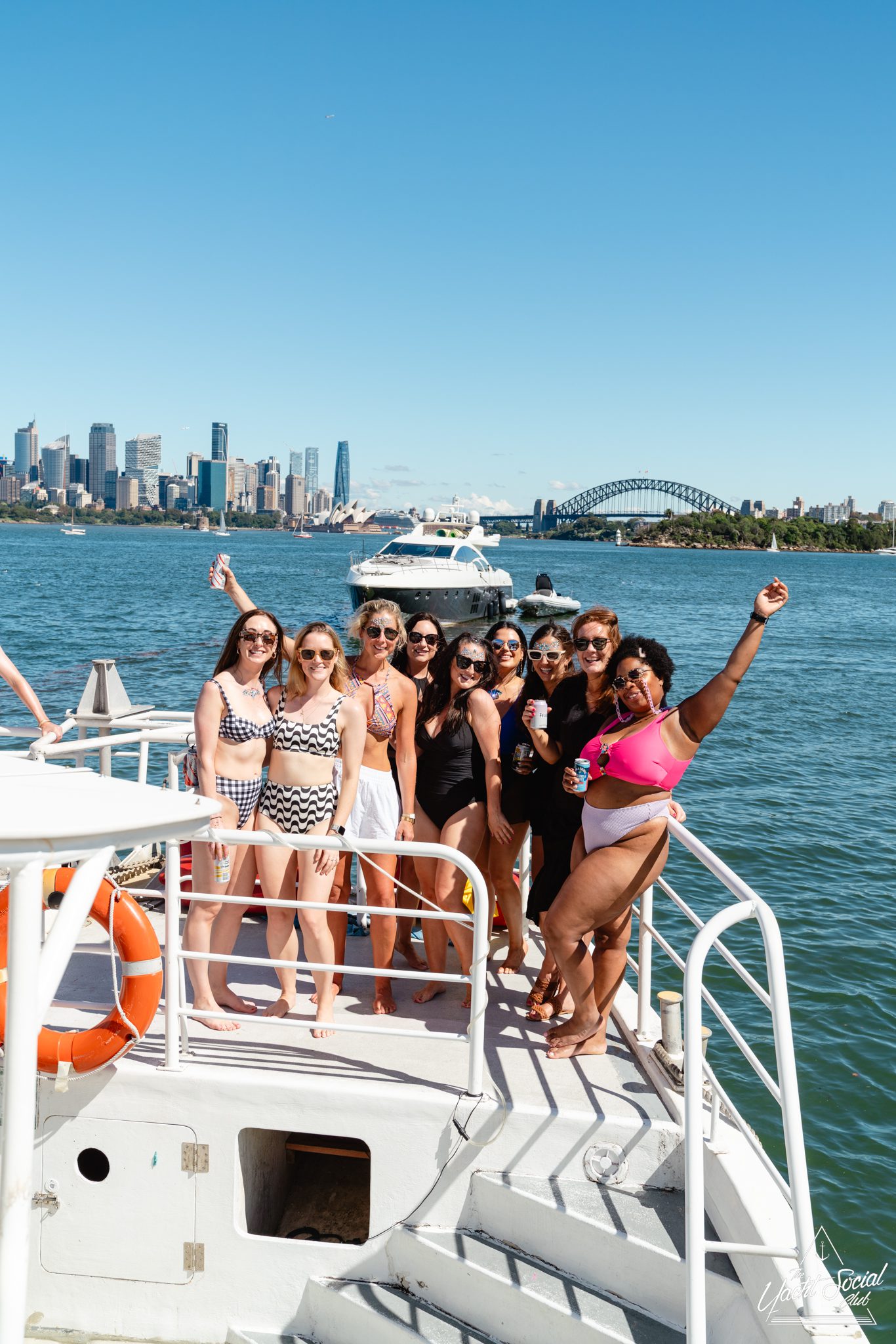 A group of people on a boat, smiling and enjoying themselves. Three women in swimsuits are holding drinks and posing for the photo, while others around them are also engaged in the festivities. The background displays lush, green trees. Experience this with Sydney Harbour Boat Hire The Yacht Social Club.