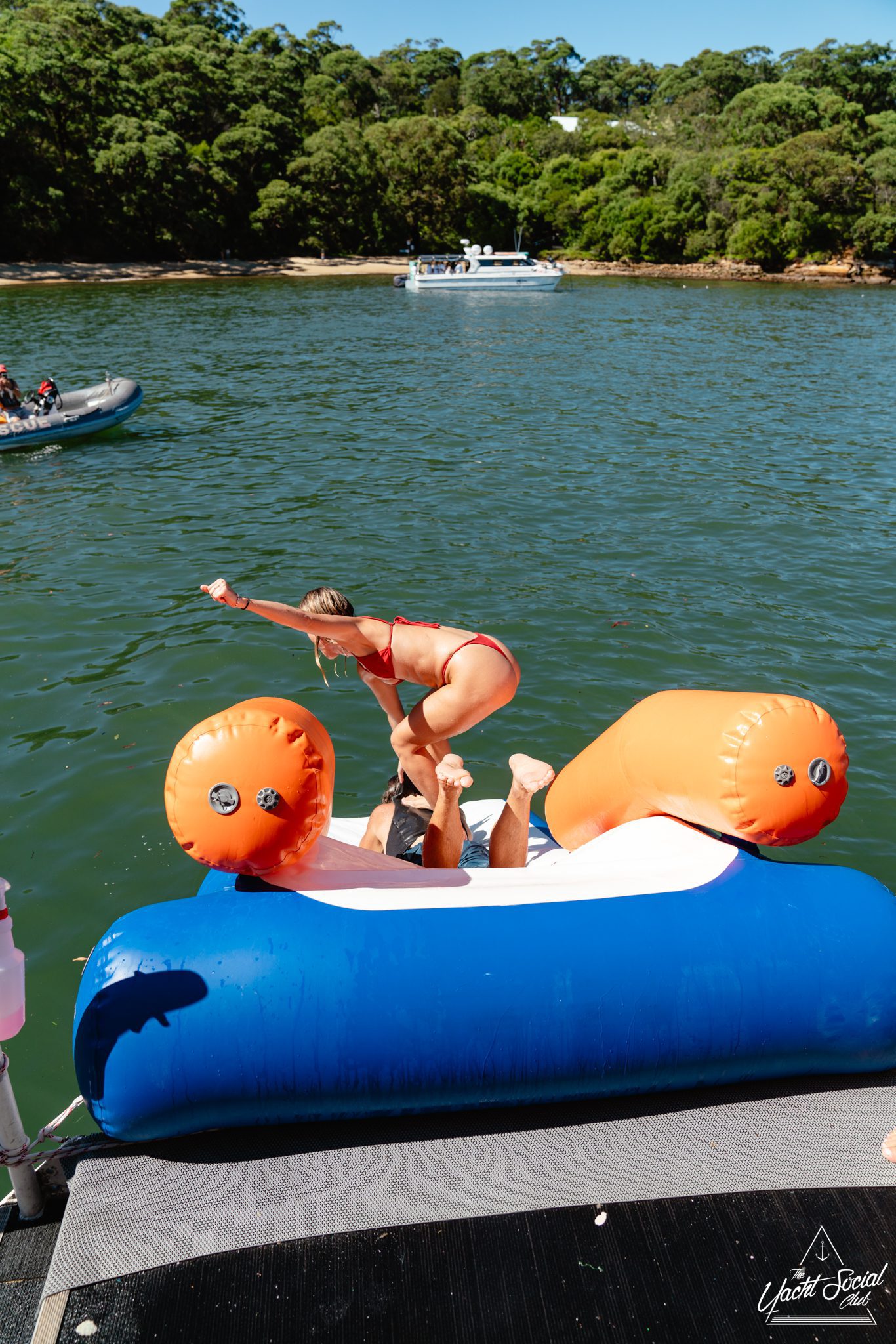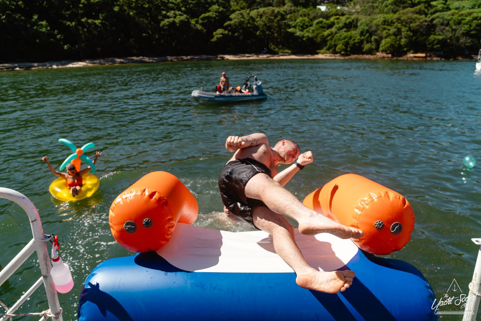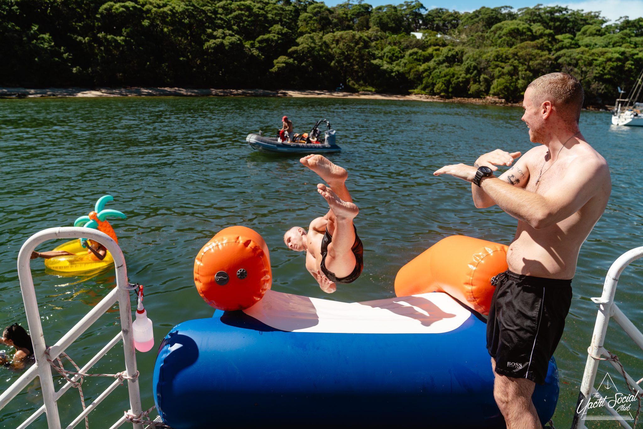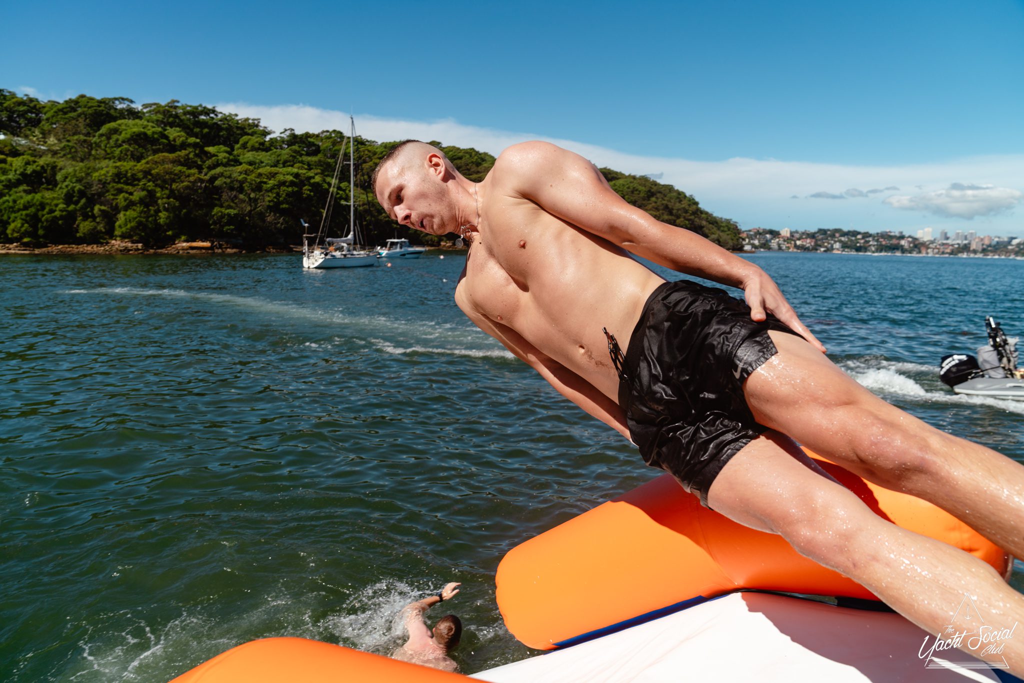 A shirtless man in black shorts is captured mid-air above the water, appearing to jump or fall from an orange and white inflatable object during a Sydney Harbour Boat Hire The Yacht Social Club event. In the background, there’s a scenic view of a bay with boats, trees, and a clear blue sky.