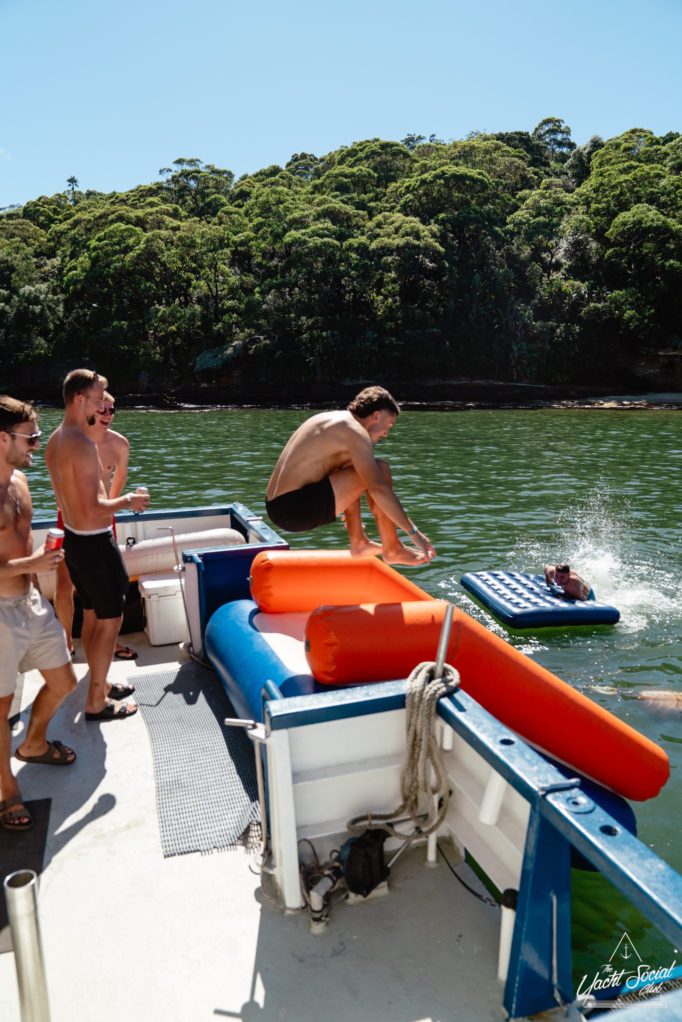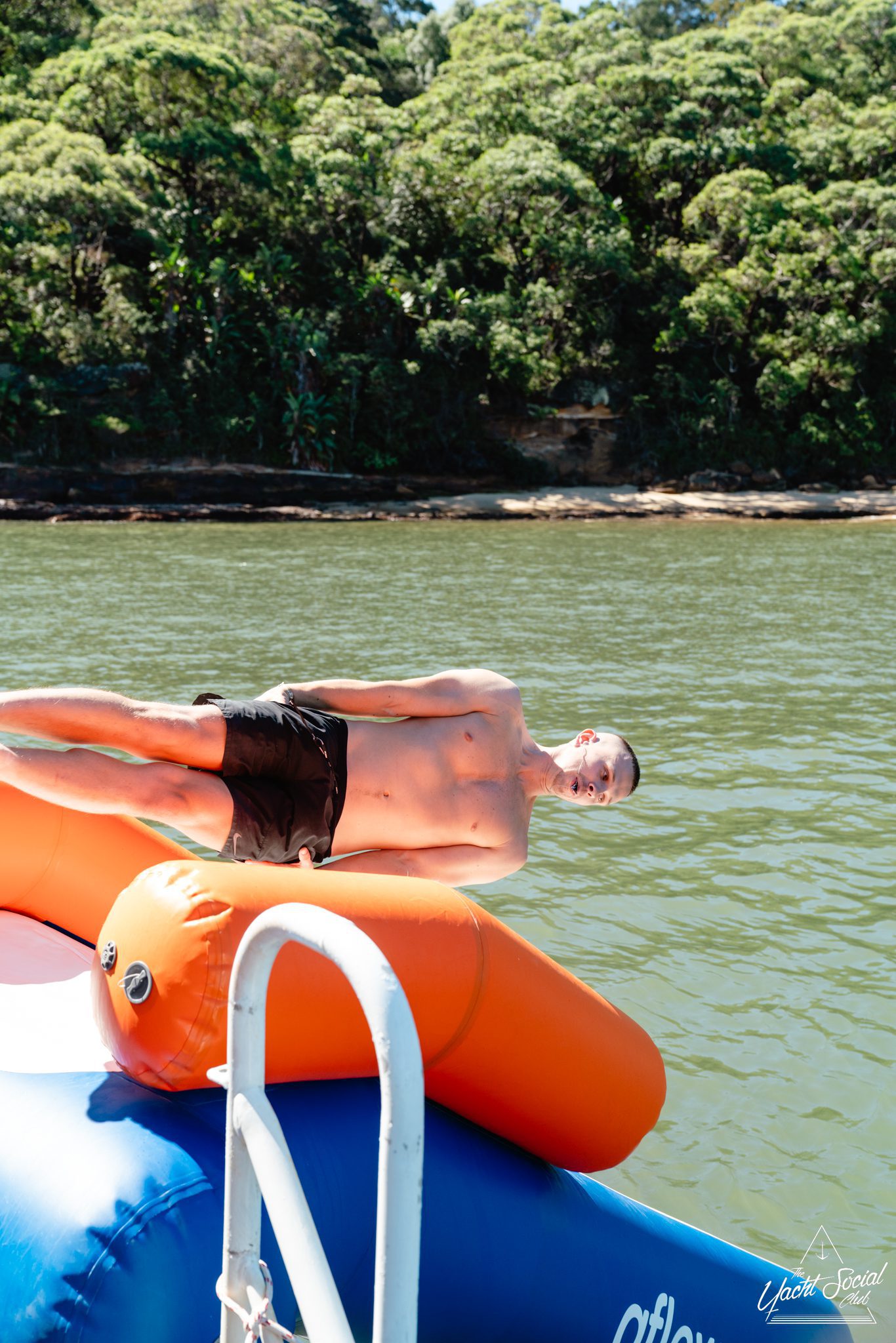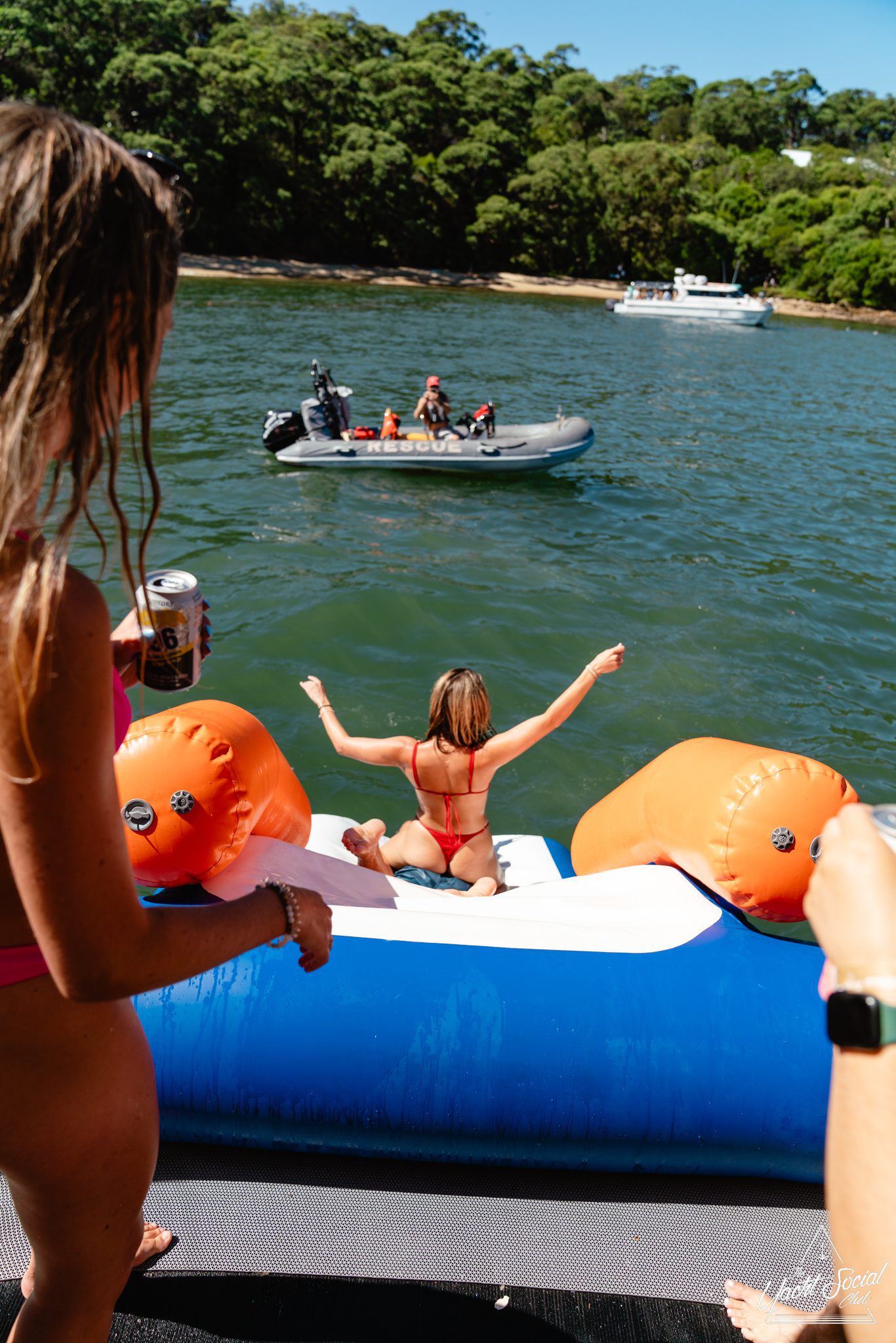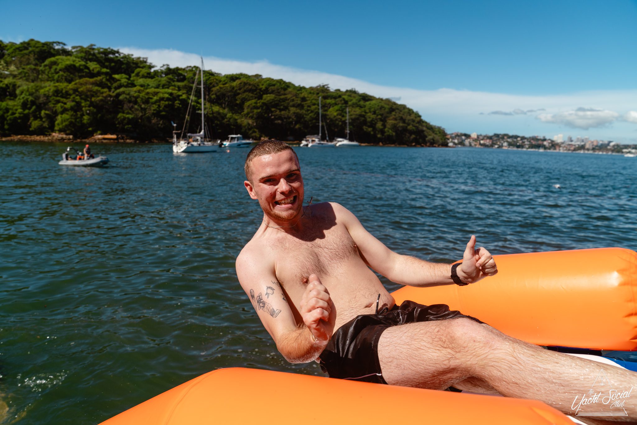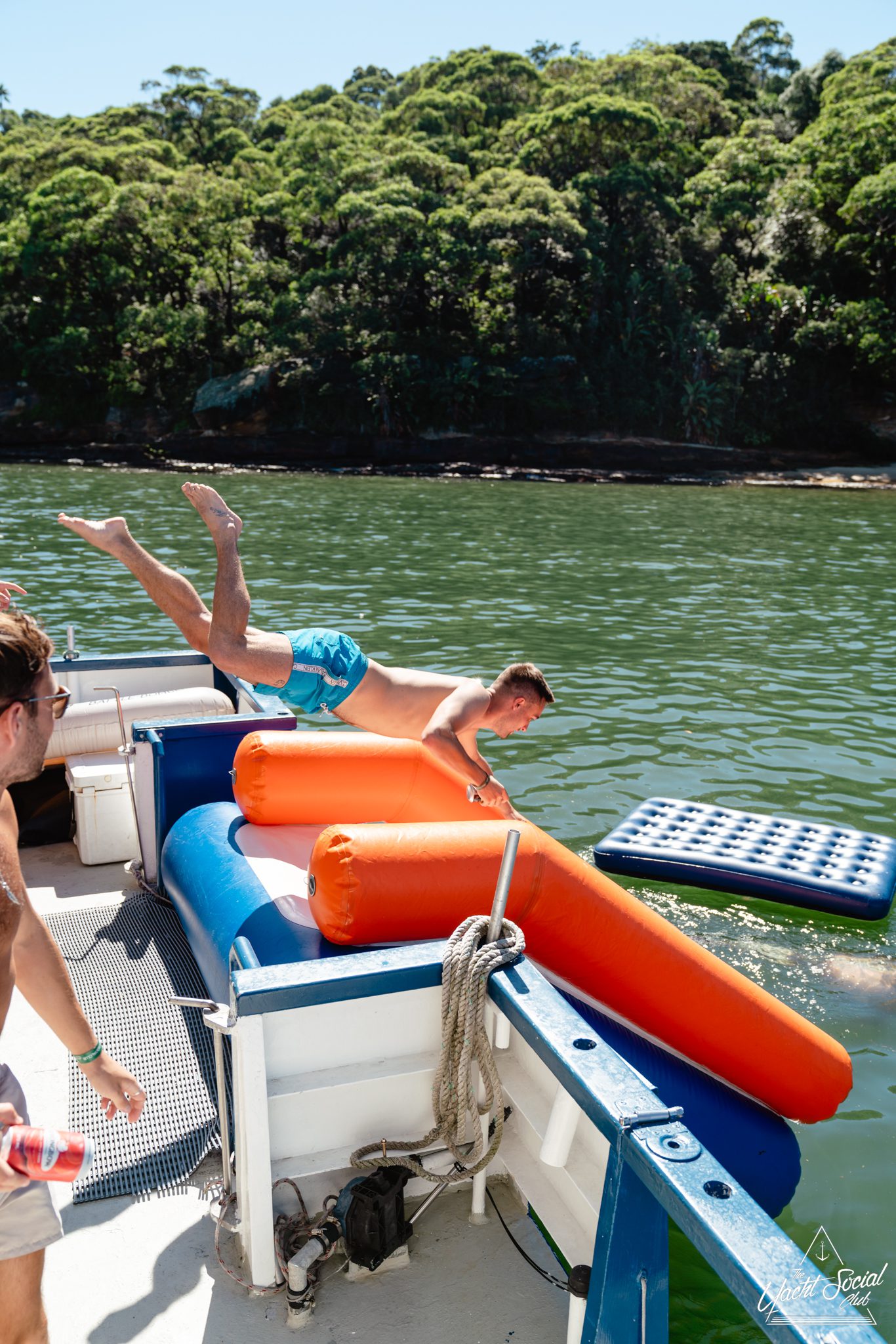 A shirtless man in black shorts is captured mid-air above the water, appearing to jump or fall from an orange and white inflatable object during a Sydney Harbour Boat Hire The Yacht Social Club event. In the background, there’s a scenic view of a bay with boats, trees, and a clear blue sky.