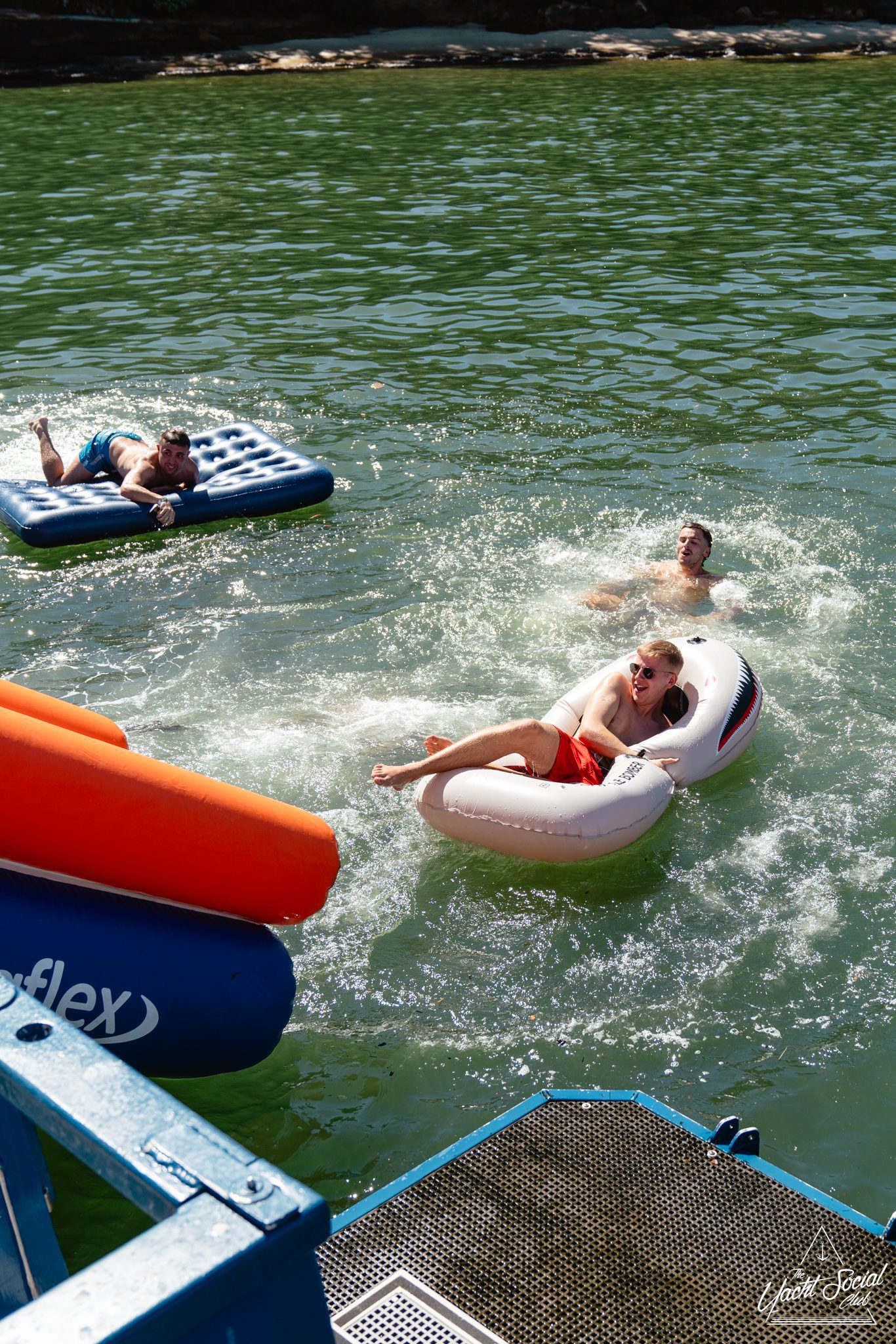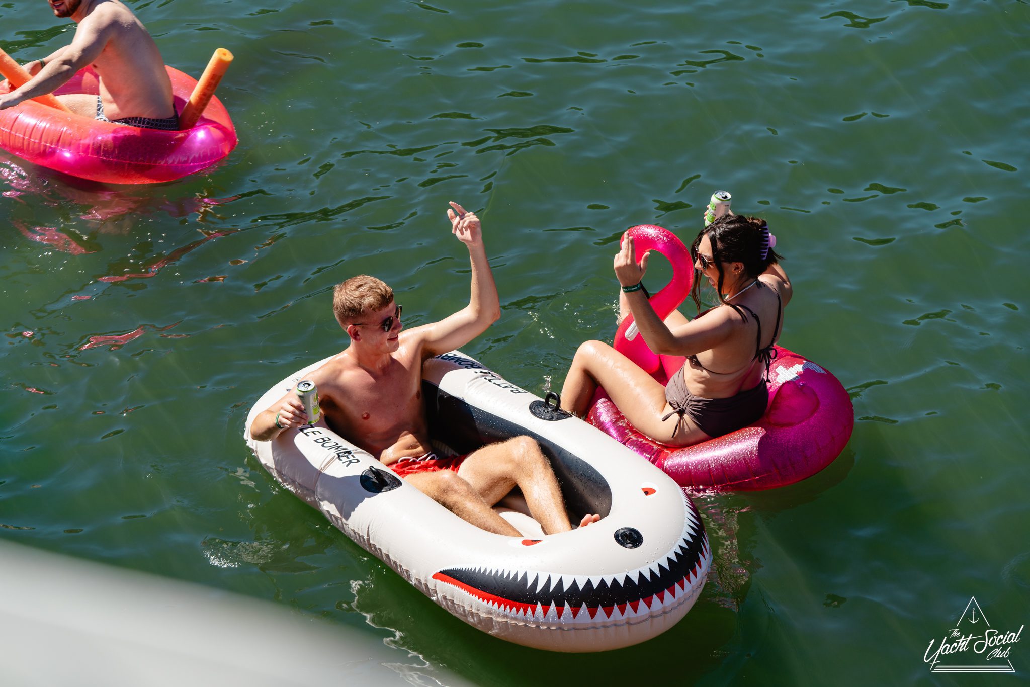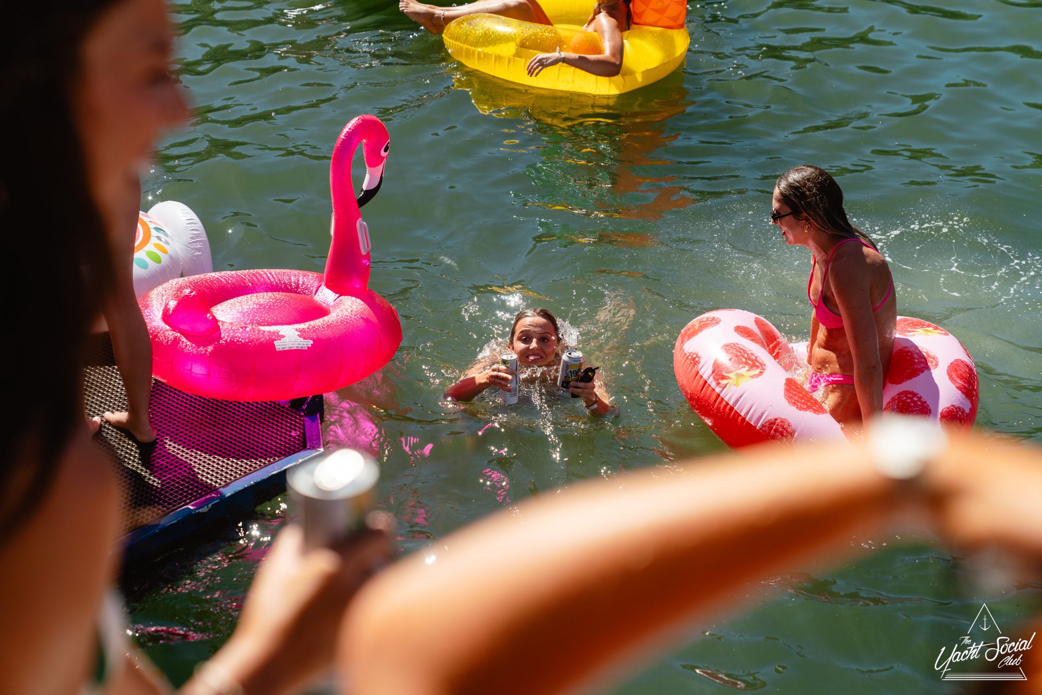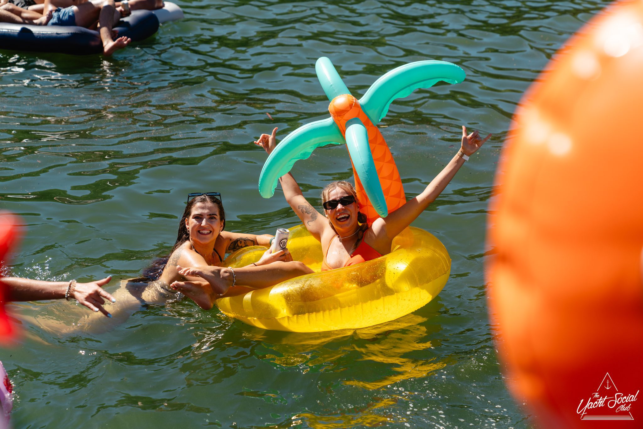 Two women in swimwear sit on an inflatable float in a lake, holding up drinks and smiling at the camera. Surrounding them are people swimming and relaxing on various inflatables. In the background, a boat from The Yacht Social Club Event Boat Charters is visible against a green, forested shoreline.