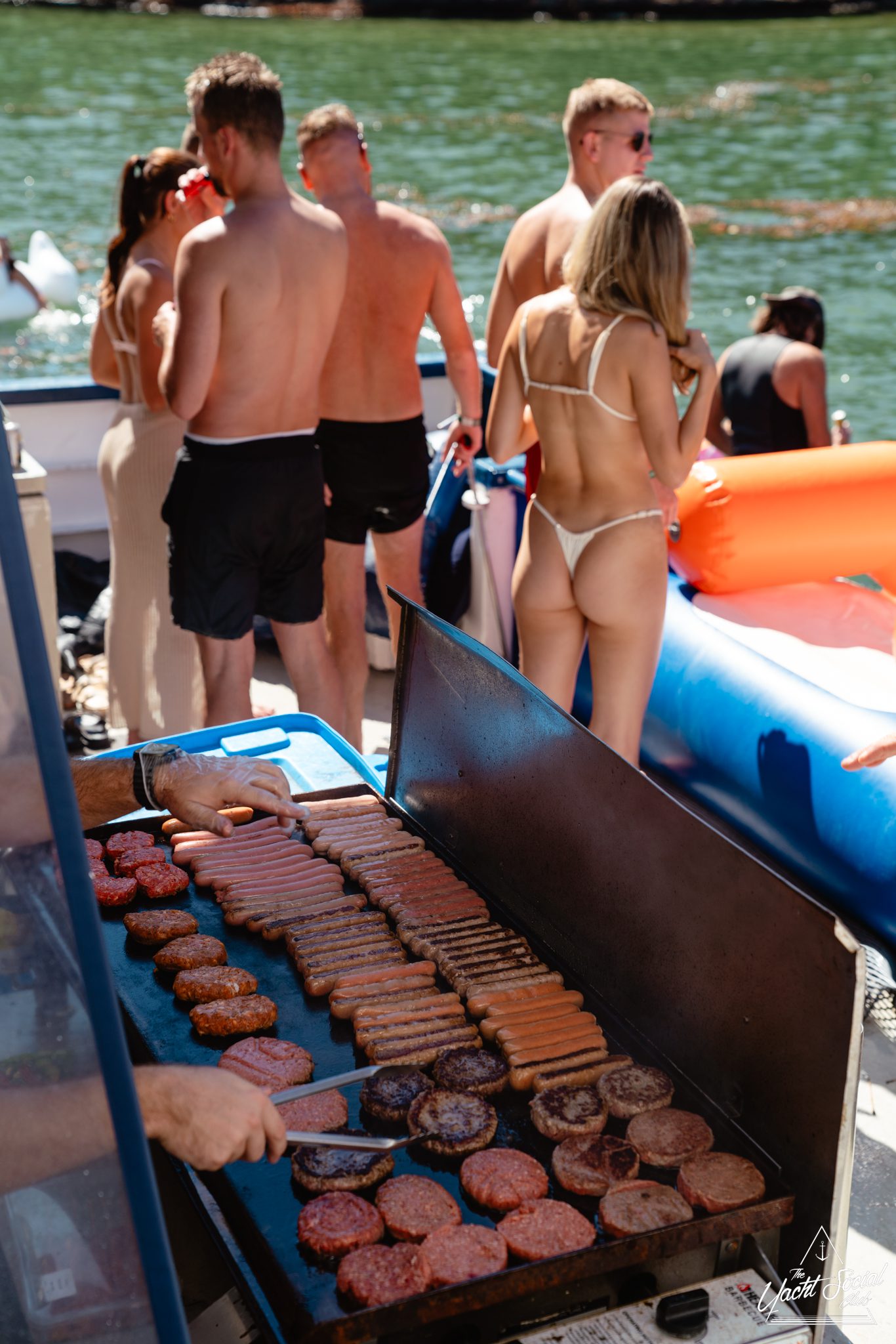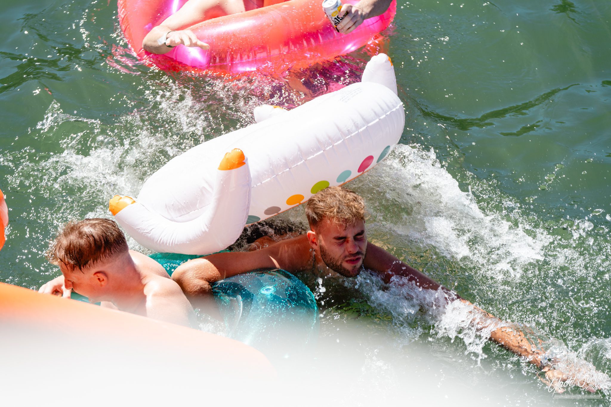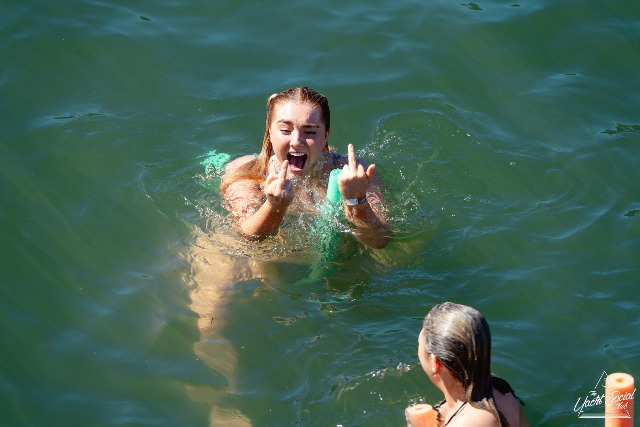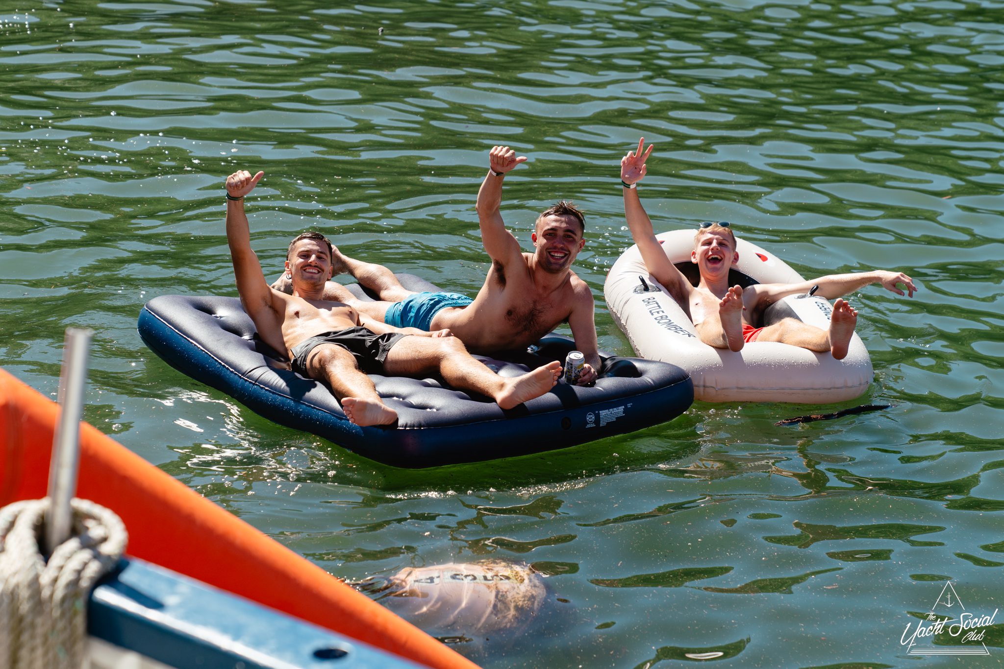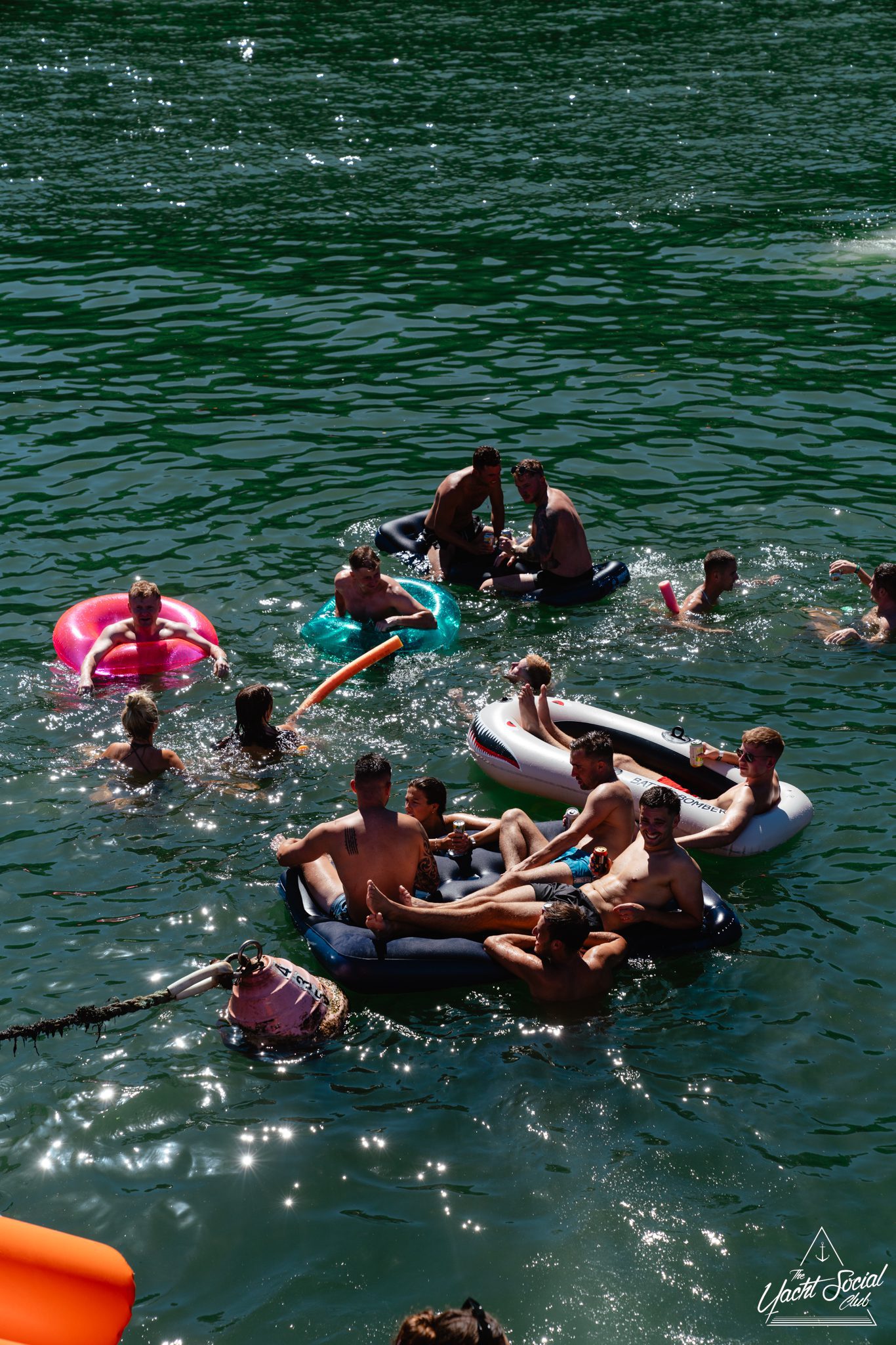 Two women in swimwear sit on an inflatable float in a lake, holding up drinks and smiling at the camera. Surrounding them are people swimming and relaxing on various inflatables. In the background, a boat from The Yacht Social Club Event Boat Charters is visible against a green, forested shoreline.