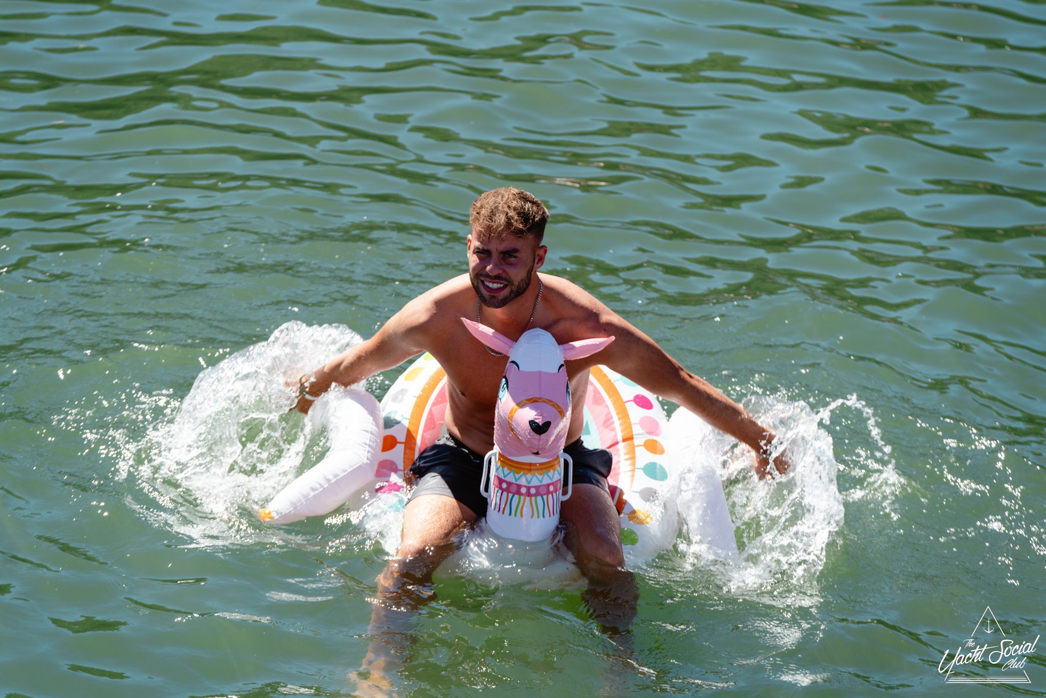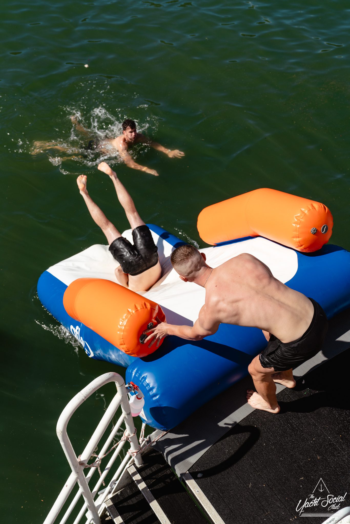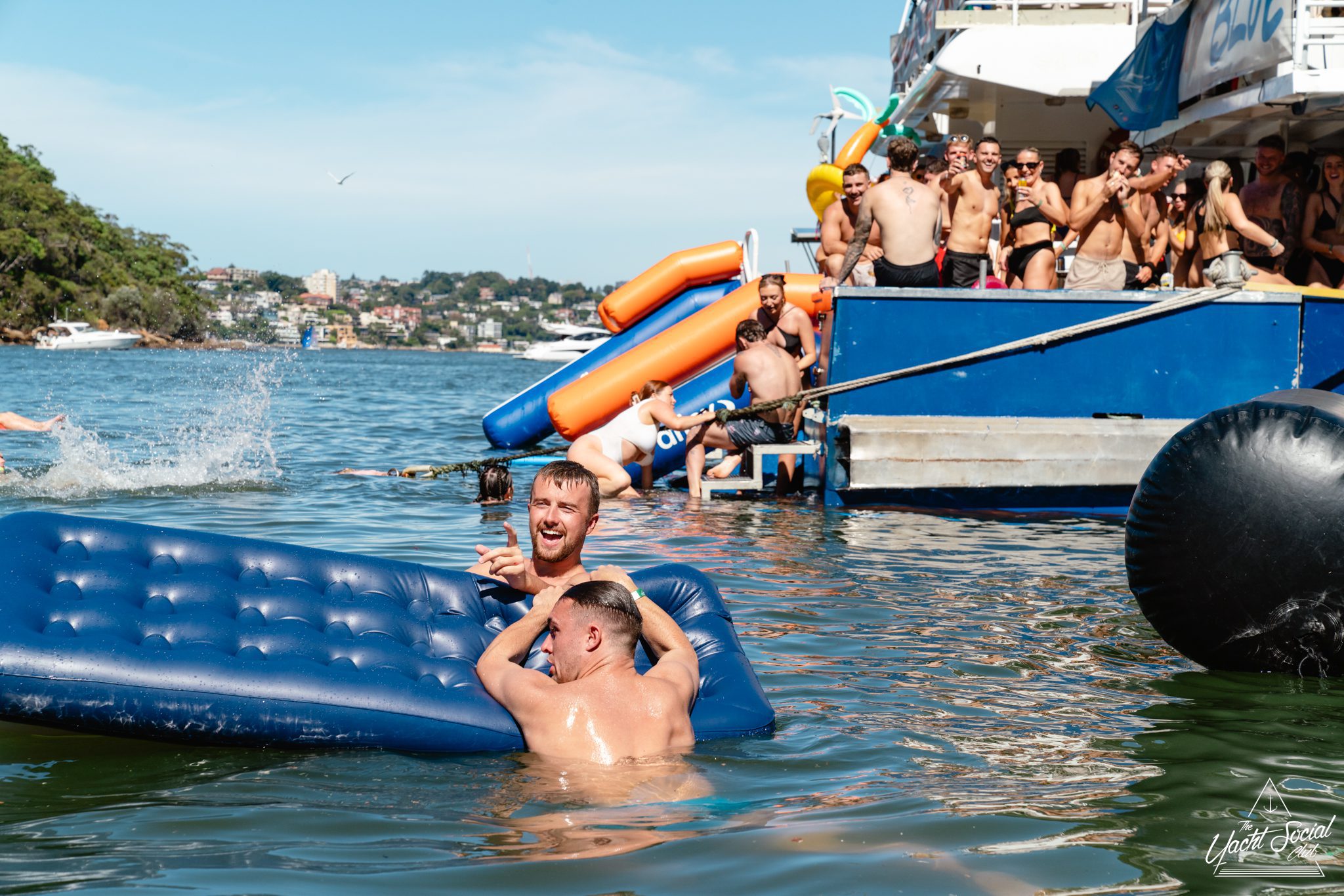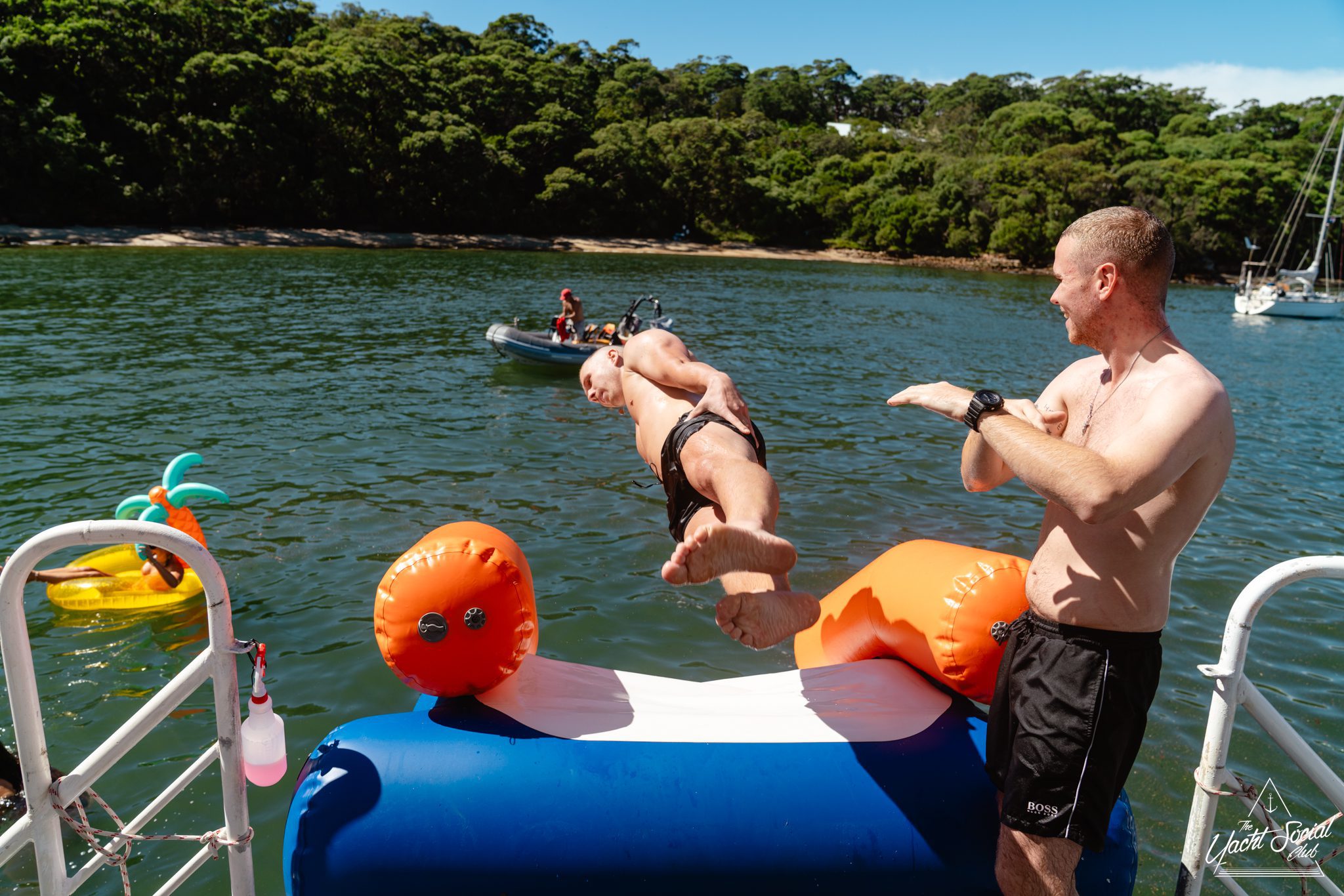 Two shirtless men are by the water. One is on an orange and blue inflatable float, while the other, standing on a dock, attempts to pull him off. Another person is swimming close by. The scene suggests playful interaction during a sunny day at a Luxury Yacht Rentals Sydney event by The Yacht Social Club.