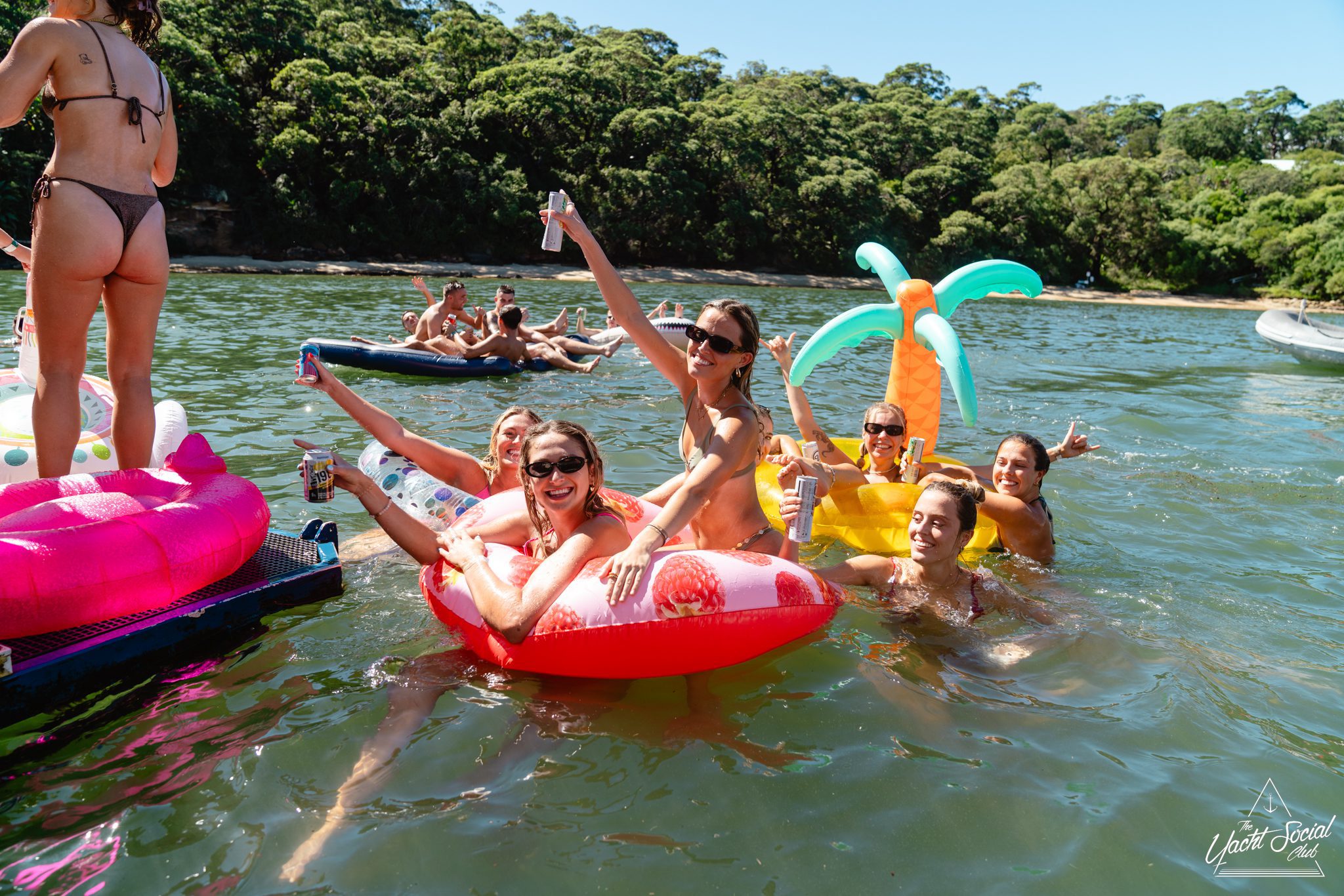 A group of people enjoying a sunny day on a lake. Some are lounging on inflatable floats, including a pink donut and a clear ring. Everyone appears relaxed and happy, with a woman in a pink bikini smiling and raising a can, splashing her feet in the water – reminiscent of the fun at Boat Parties Sydney The Yacht Social Club.