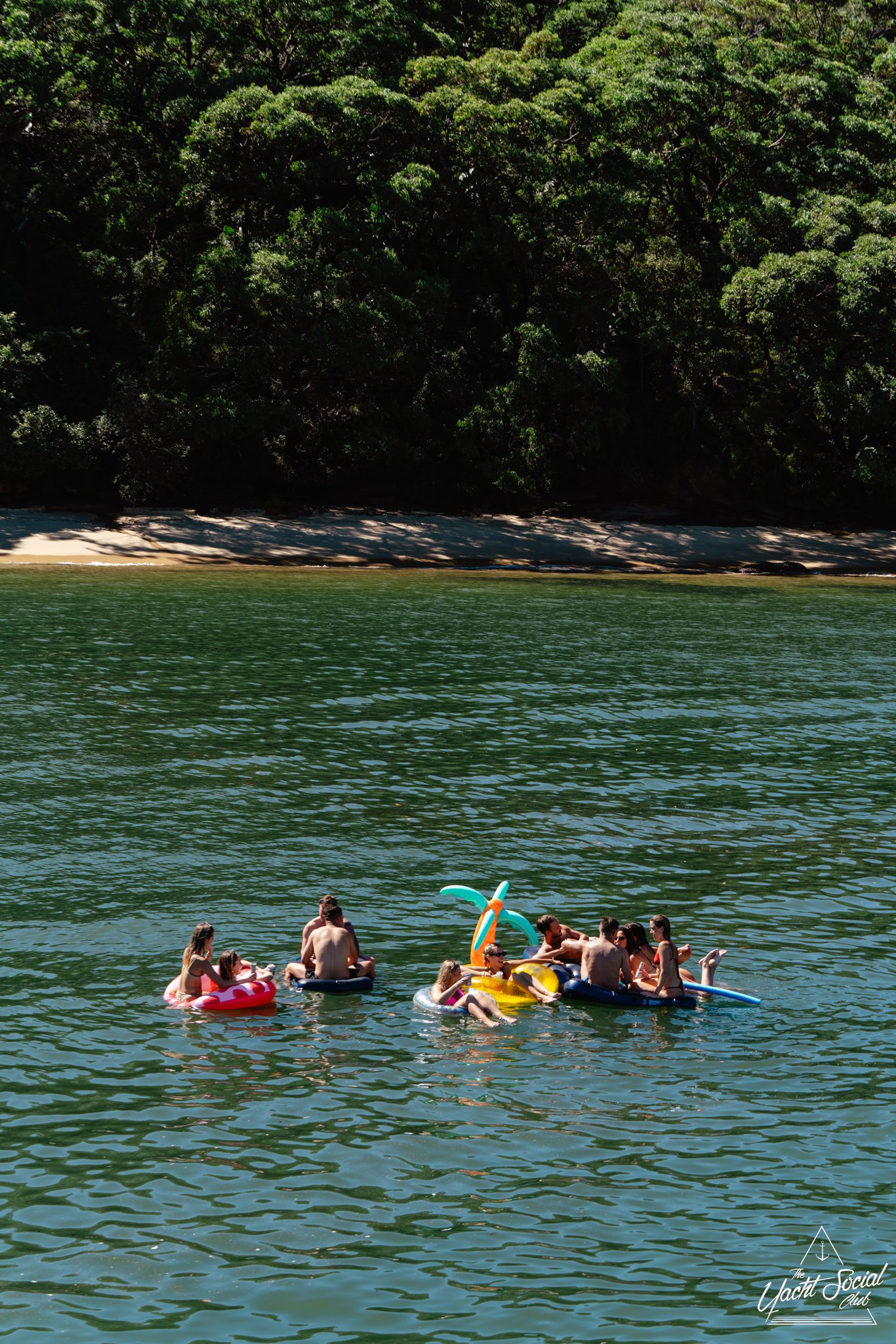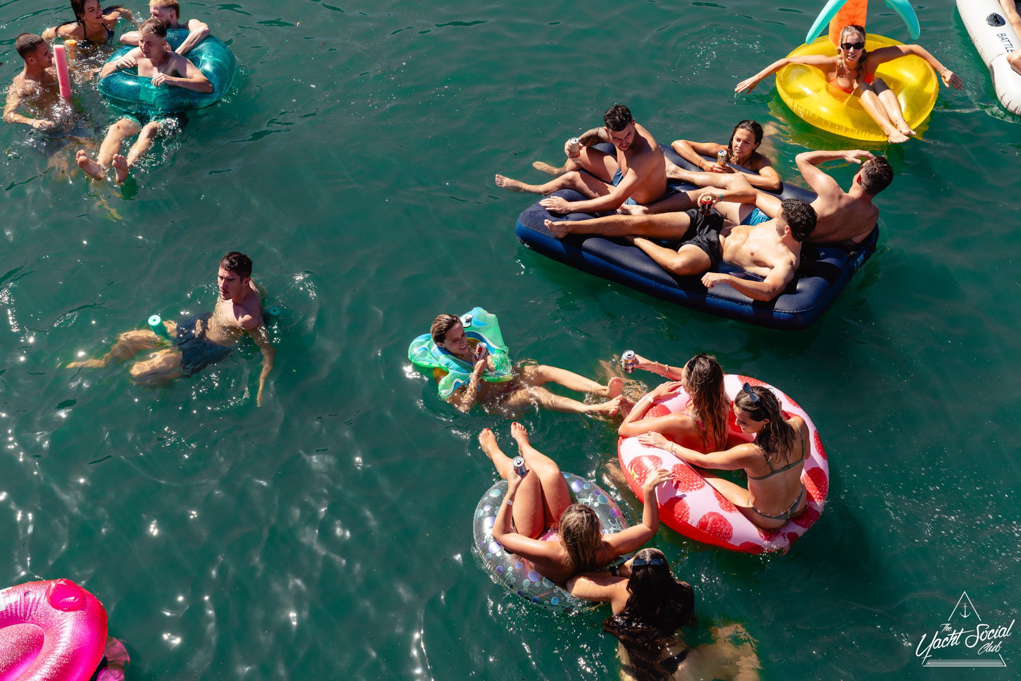Aerial view of a group of people in a body of water, floating on different inflatable items, such as rings and loungers. They are enjoying a sunny day, relaxing and interacting with each other at The Yacht Social Club Event Boat Charters. The water appears to be calm and clear.