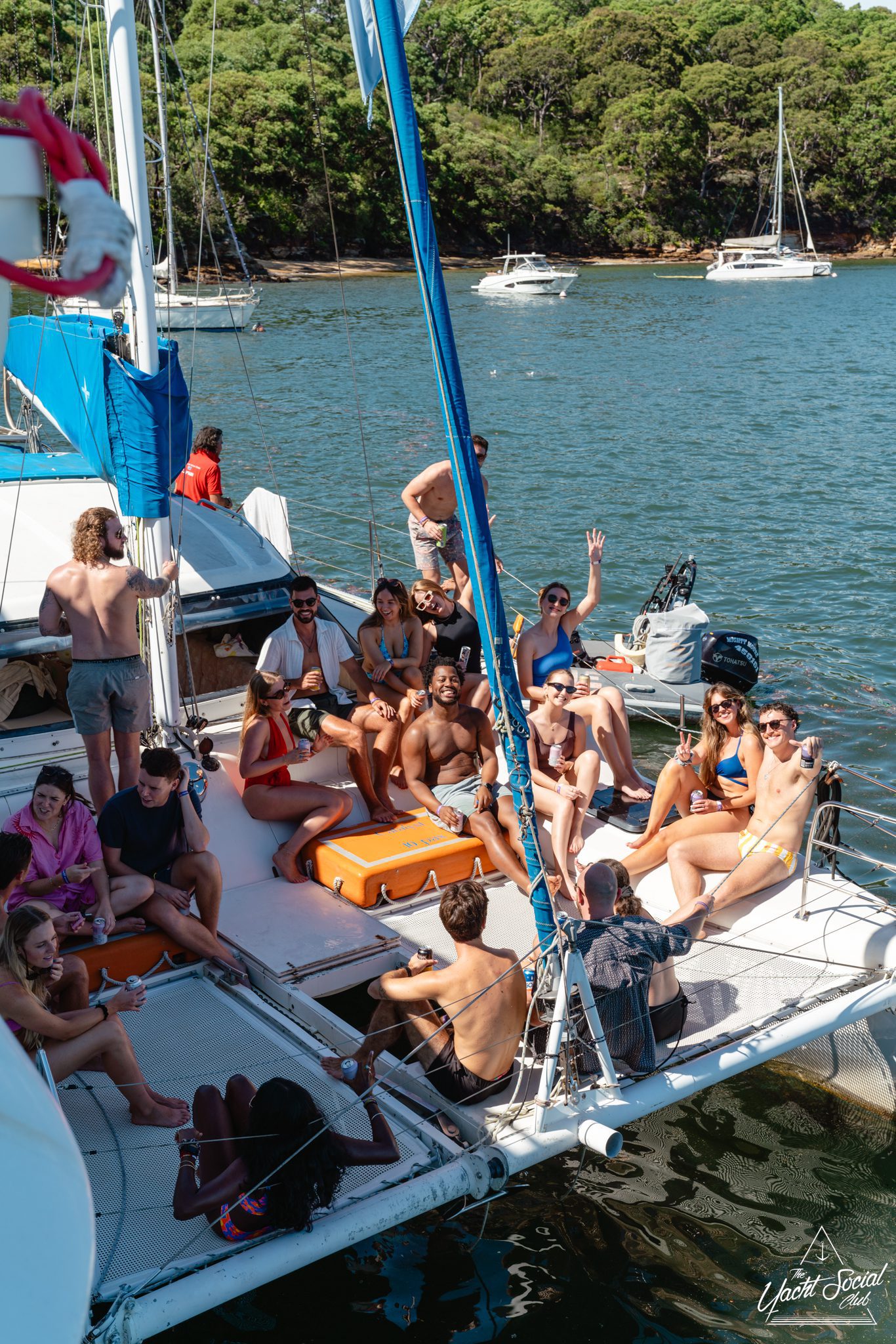 A group of people stands on the deck of a catamaran under a clear blue sky. They are smiling, with some posing and others cheering with their hands raised. The water and distant shoreline are visible in the background. The boat has "Yacht Social Club" branding.