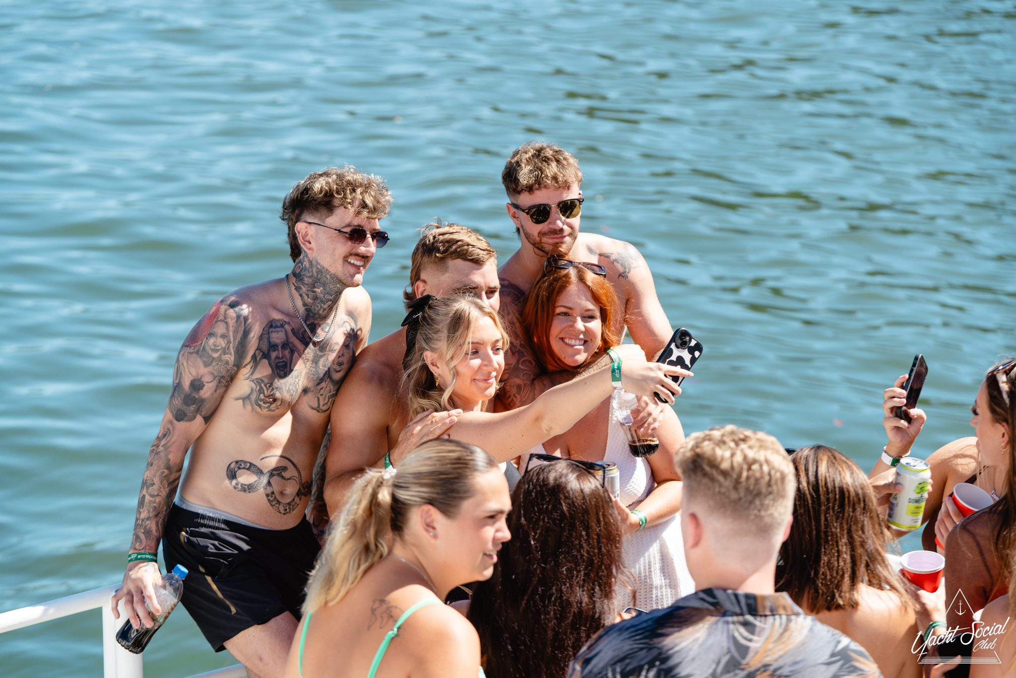 A group of people, some with tattoos and sunglasses, are gathered closely together on a boat, smiling and posing for a selfie. They are dressed in summer attire with a scenic background of blue water. The sunny weather suggests a fun and lively outdoor gathering.
