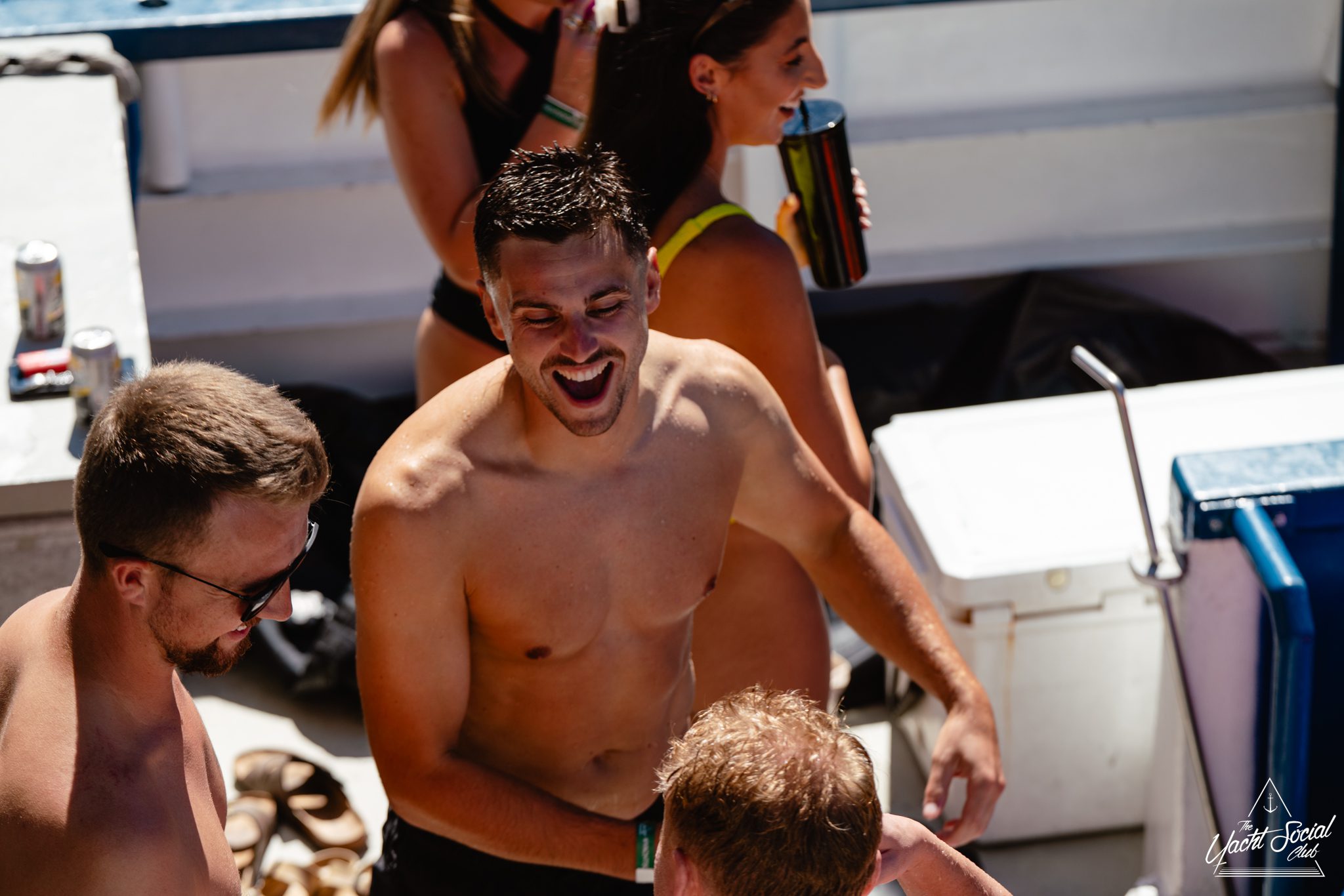 A group of six people, four men and two women, in swimwear are posing and smiling on a boat from The Yacht Social Club with a scenic forested shoreline in the background. Some hold drinks, and a few floatation devices are visible on the boat. It is a sunny day.