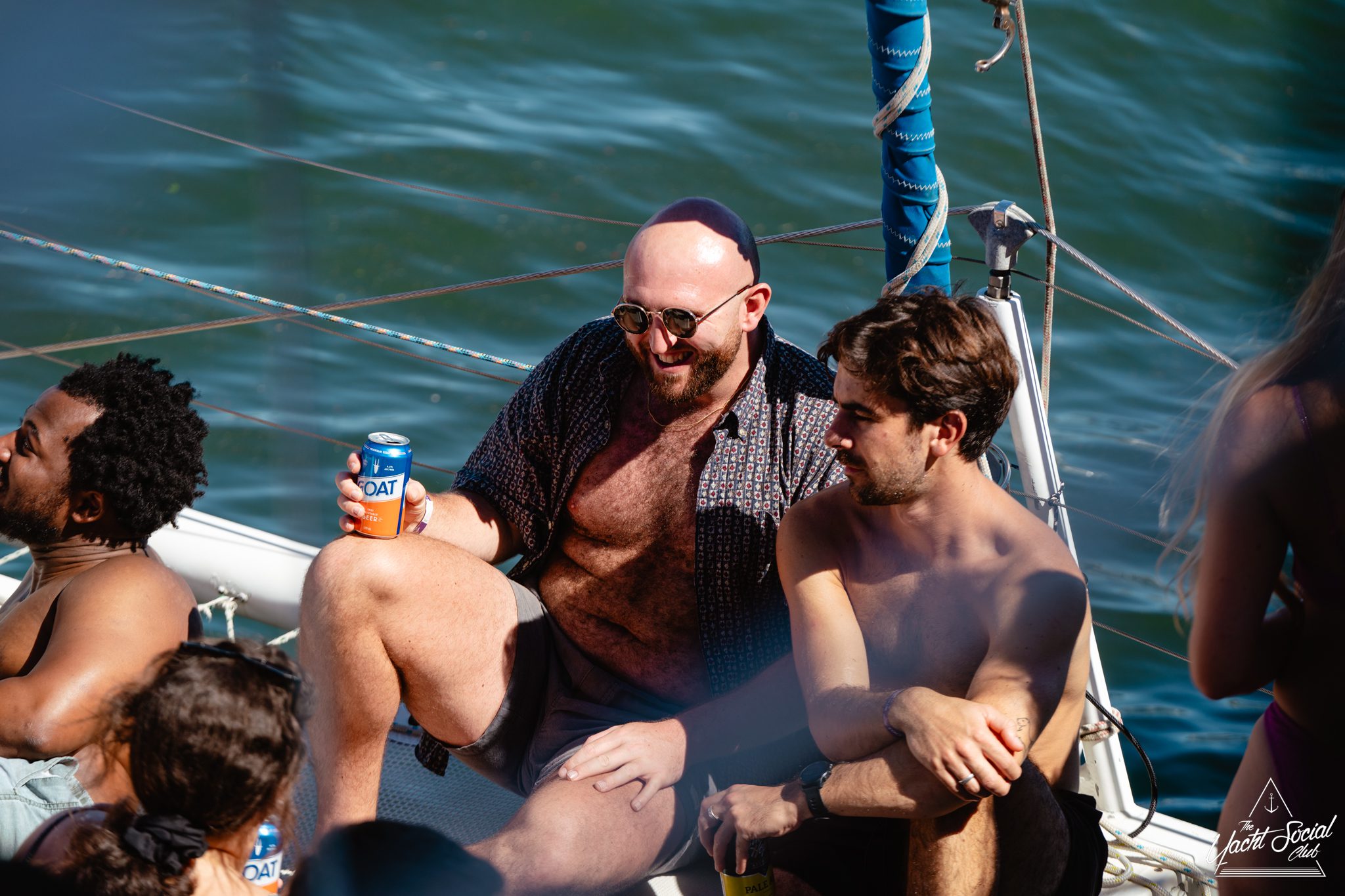 A group of people enjoy a sunny day on a sailing boat. A bald man wearing sunglasses and holding a can sits next to another man with wavy hair. Several others are seated around, soaking up the sun and socializing. The sea is visible in the background.