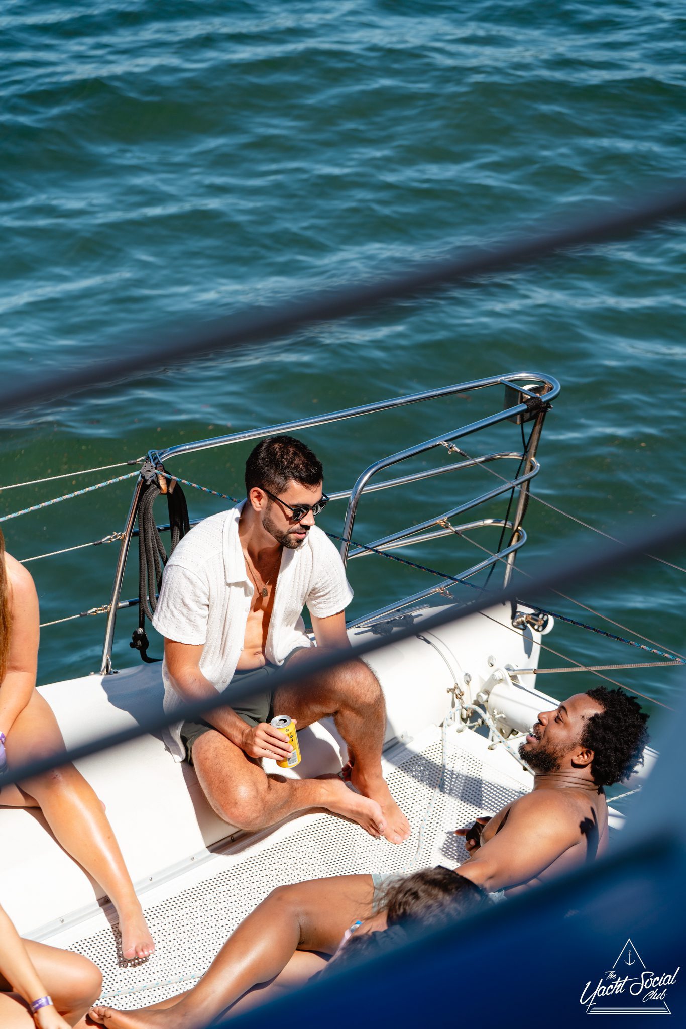 A group of people relax on a boat under the sun, with two men seated at the front. One man holds a drink while chatting, wearing sunglasses and casual attire. The water behind the boat is calm and clear, and a logo in the bottom right corner reads "Yacht Social.