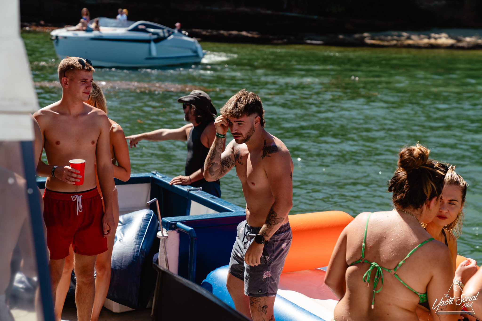 A group of people enjoying a boat party hosted by The Yacht Social Club Sydney Boat Hire. Some are wearing swimsuits and summer attire. One person is playfully wearing an inflatable ring on his arms, while others are socializing and laughing. The background shows water and part of the boat decorated with blue patterns.