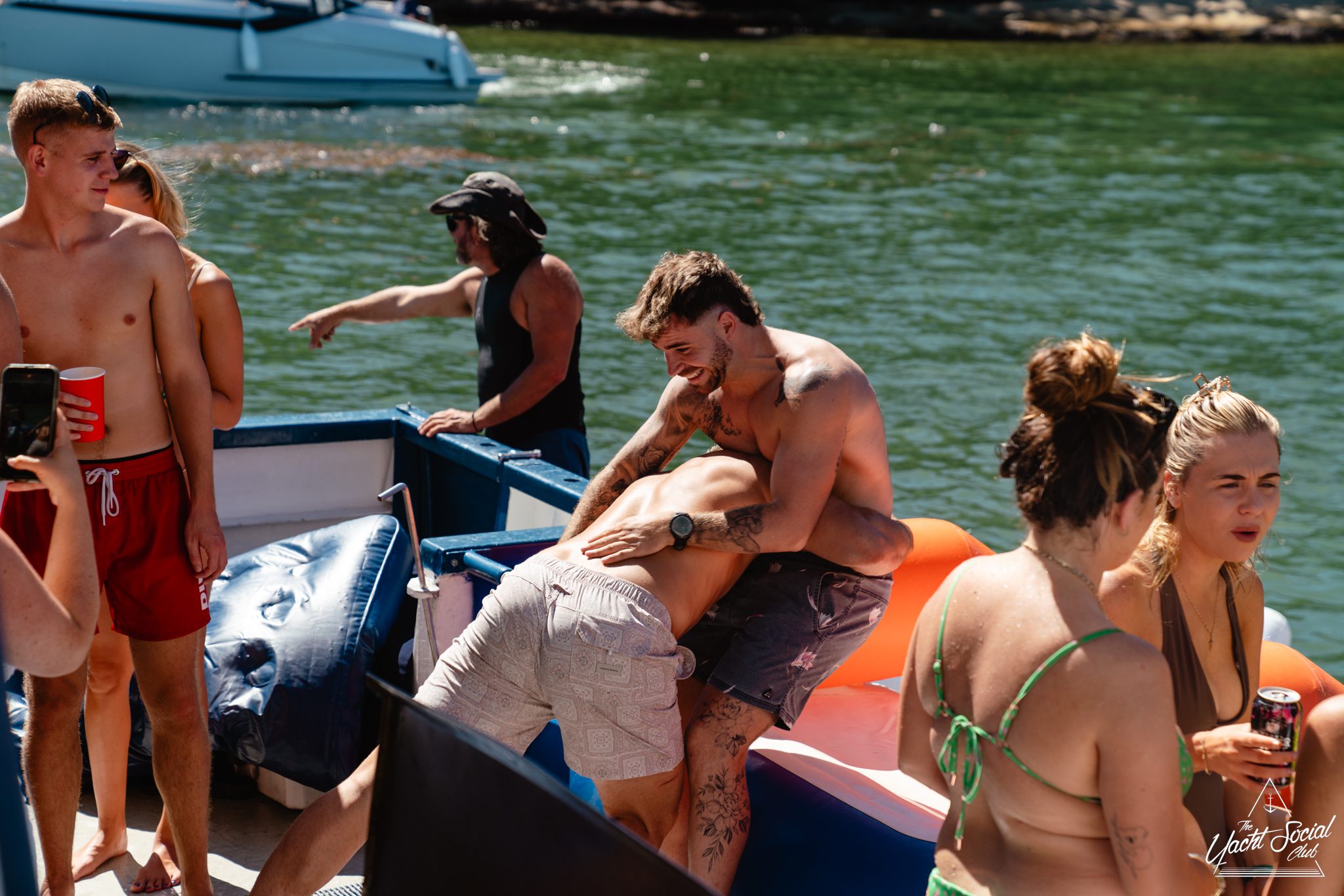 A group of people enjoying a sunny day on a boat, some standing and others sitting. Two shirtless men are dancing, while others are chatting and holding drinks. The boat is near a dock, and trees and water are visible in the background.
