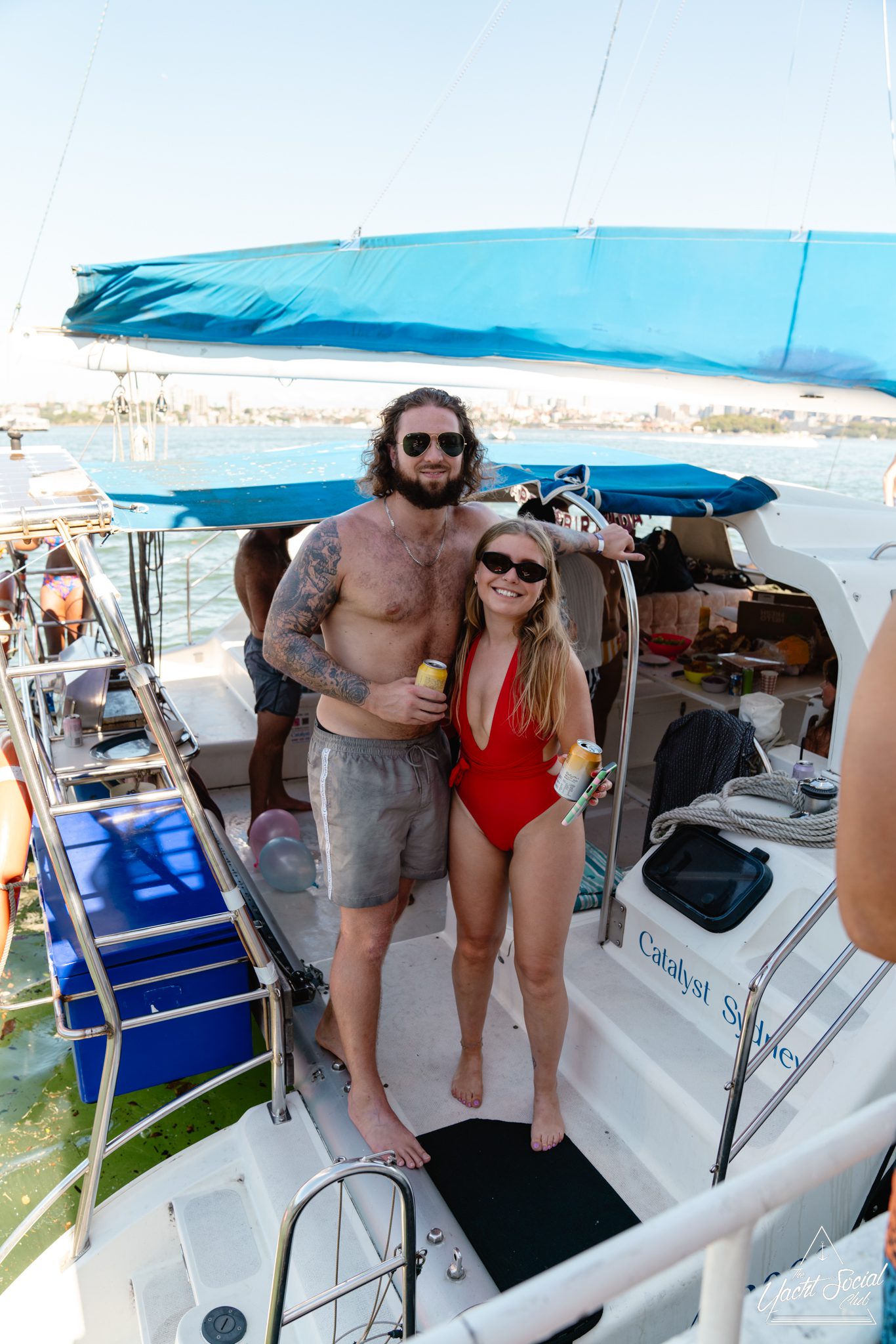 A shirtless man with sunglasses and tattoos poses alongside a woman in a red swimsuit and sunglasses on a boat. Both are holding drinks and smiling. The boat, named Catalyst Survey, is docked near a body of water with a background of distant buildings.