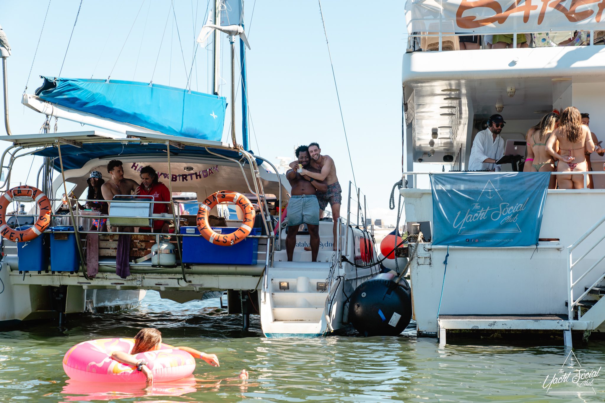 People are enjoying a sunny day on two docked boats. One person is floating in an inflatable pink tube in the water. A couple hugs on the boat walkway while others are relaxing and socializing on the boats. A banner reads "Yacht Social.