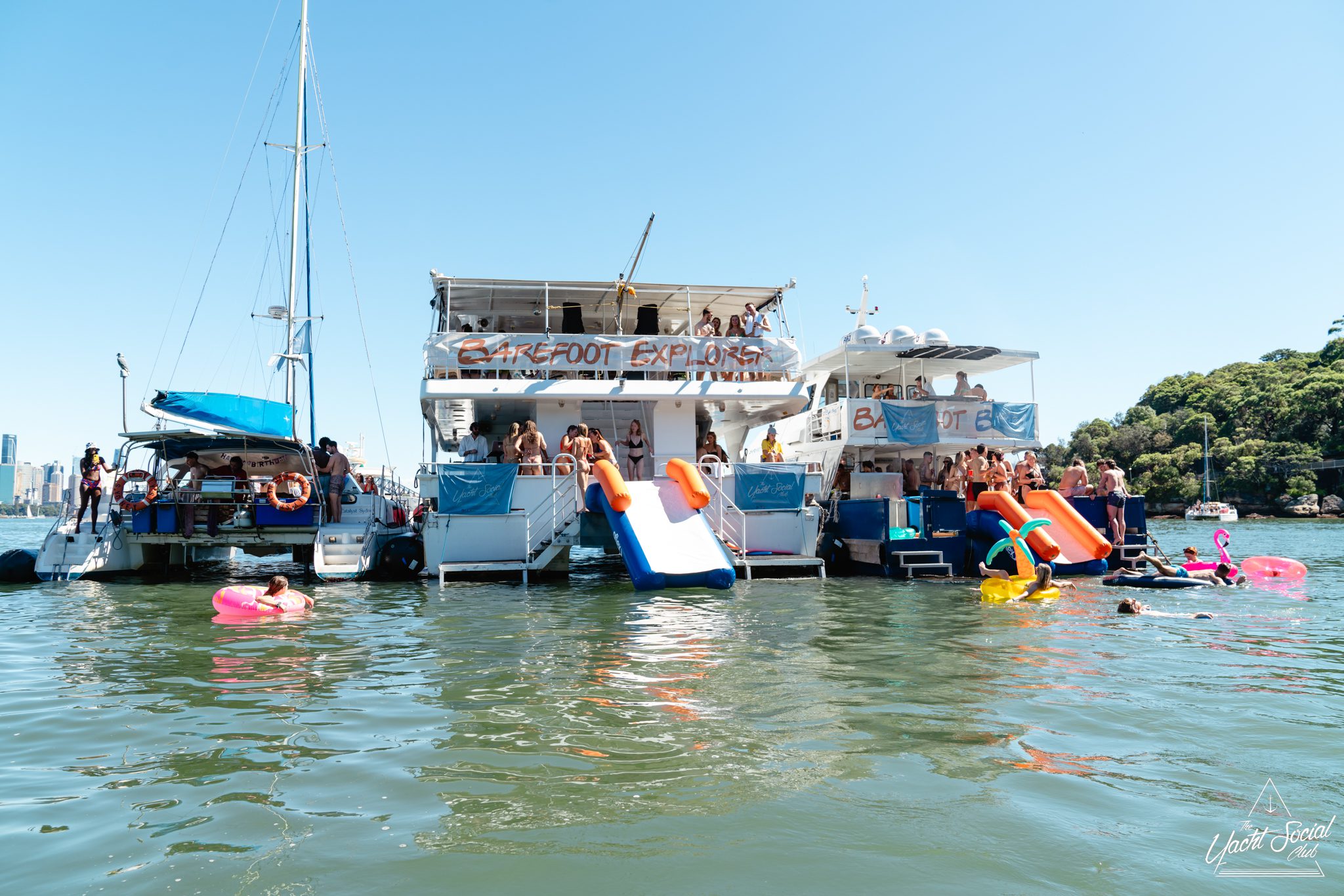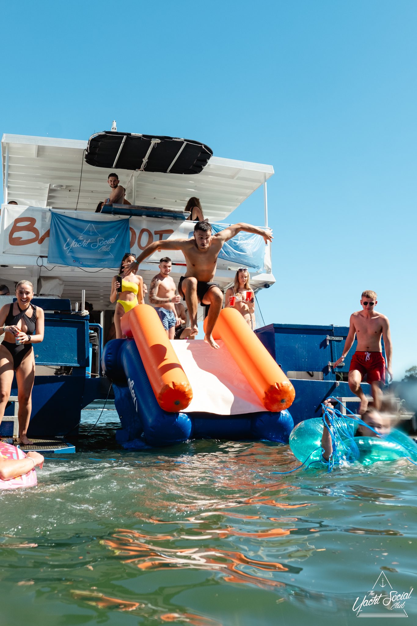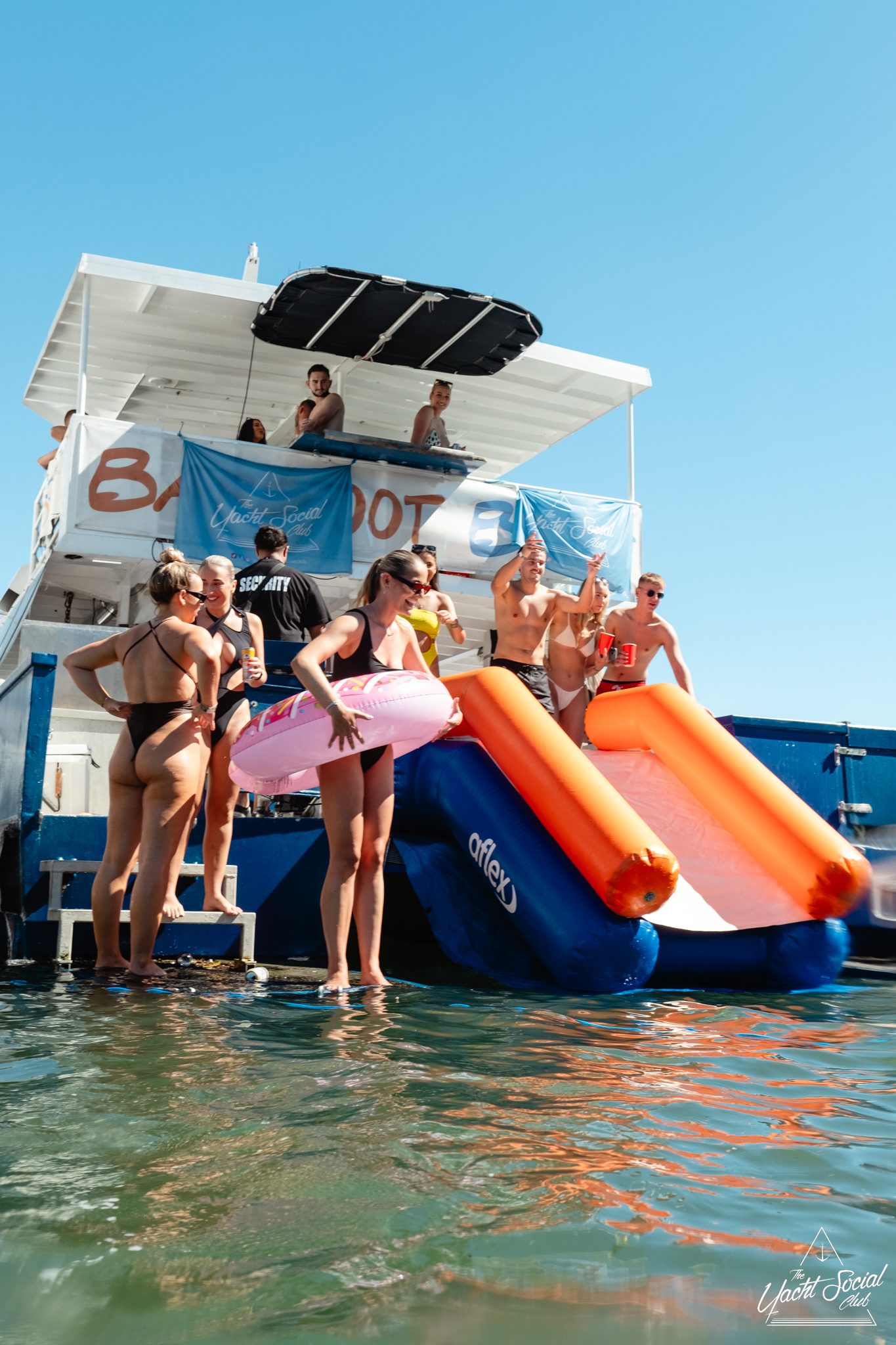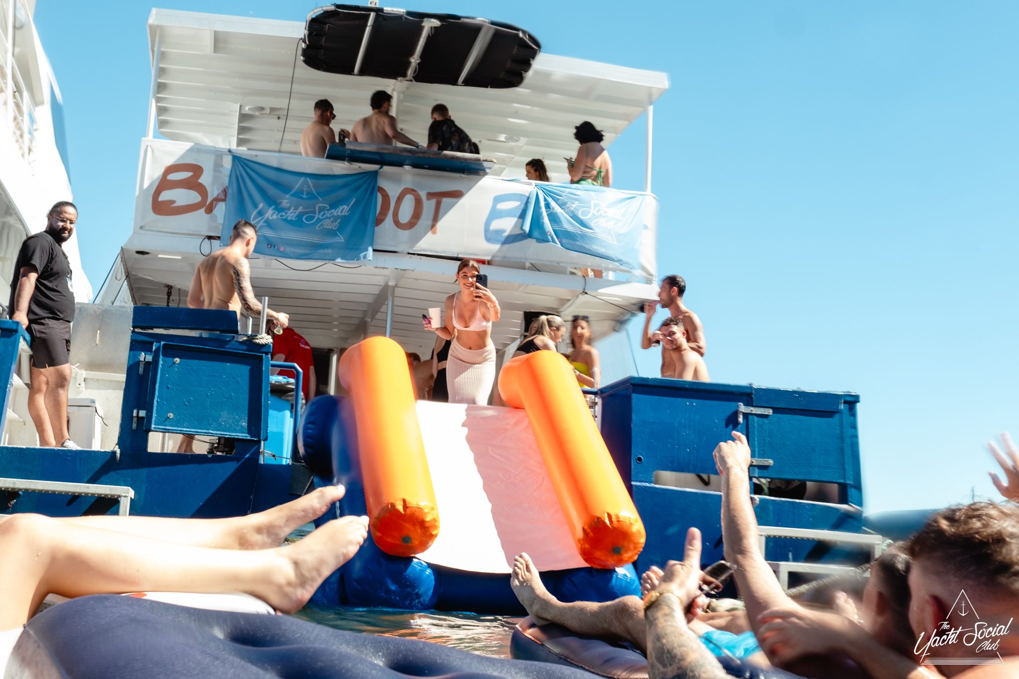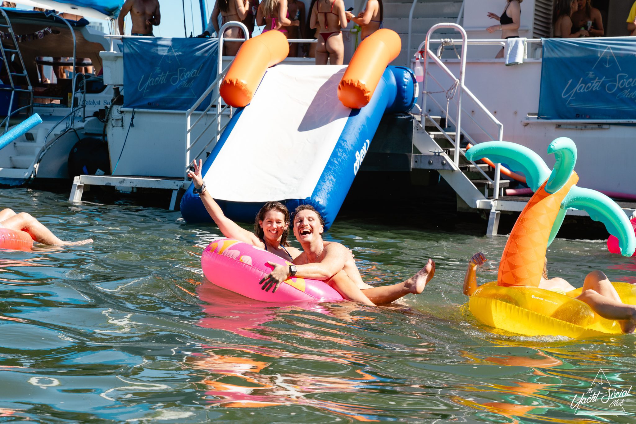 A group of people enjoys a sunny day on a boat with a slide. One person is mid-air after sliding into the water, while others watch and swim nearby. The boat features banners reading "Yacht Social." The water is clear, and everyone seems to be having fun.