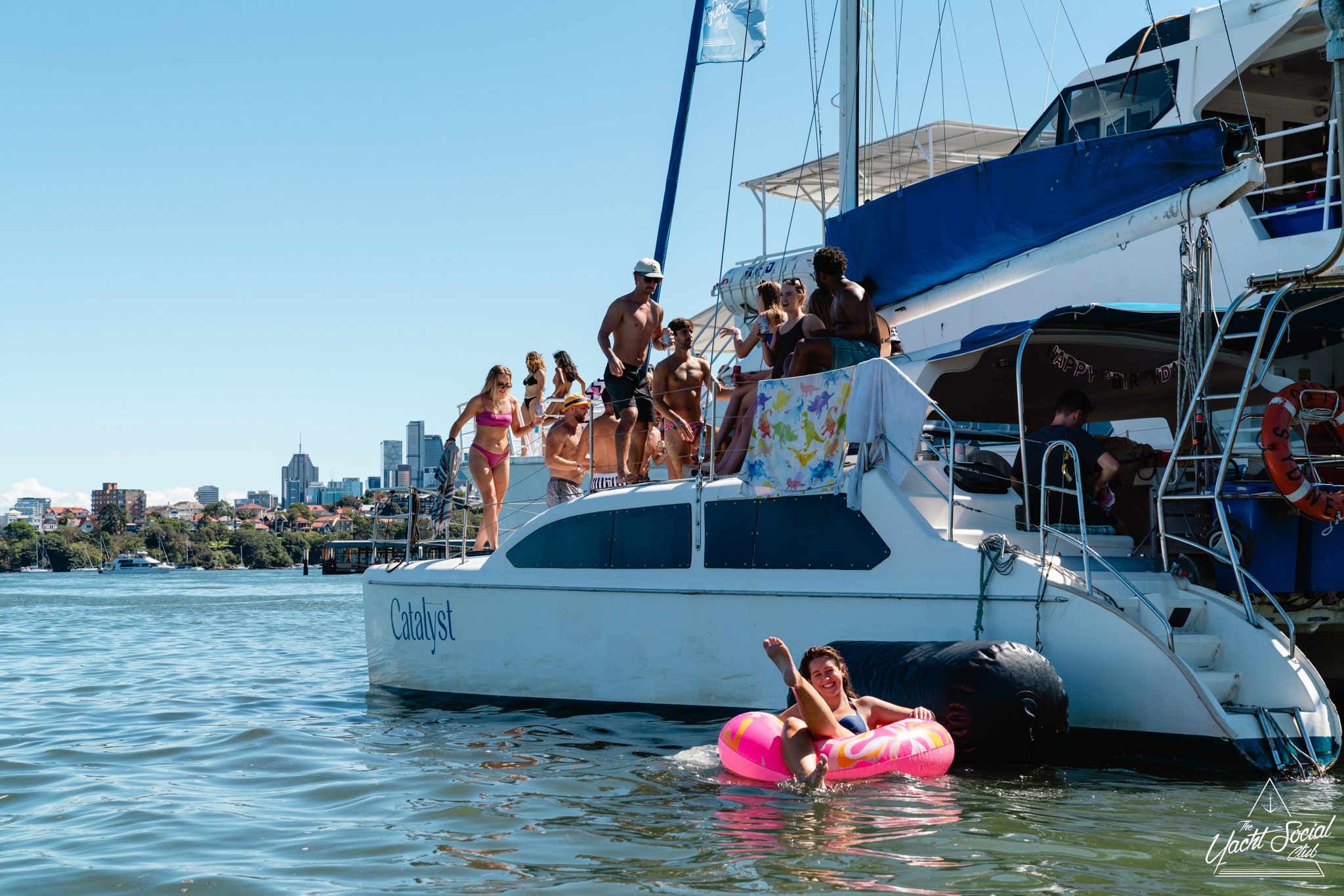 A group of people enjoy a sunny day on a catamaran named "Catalyst." Some participants are standing on the deck, while a woman floats in the water on an inflatable ring. The city skyline is visible in the background, and the water is calm.