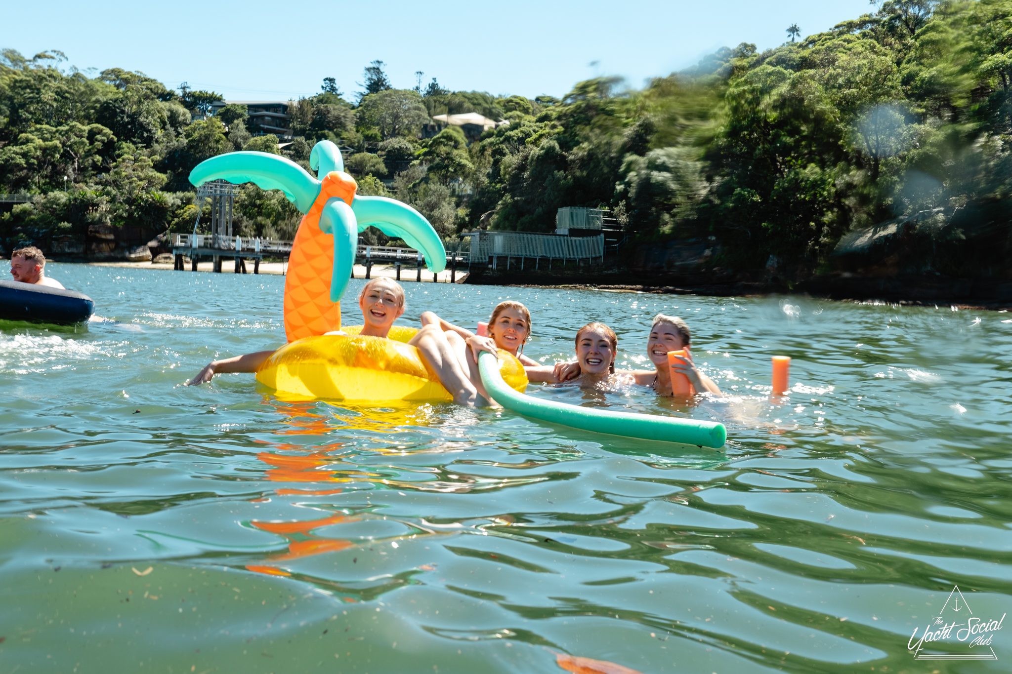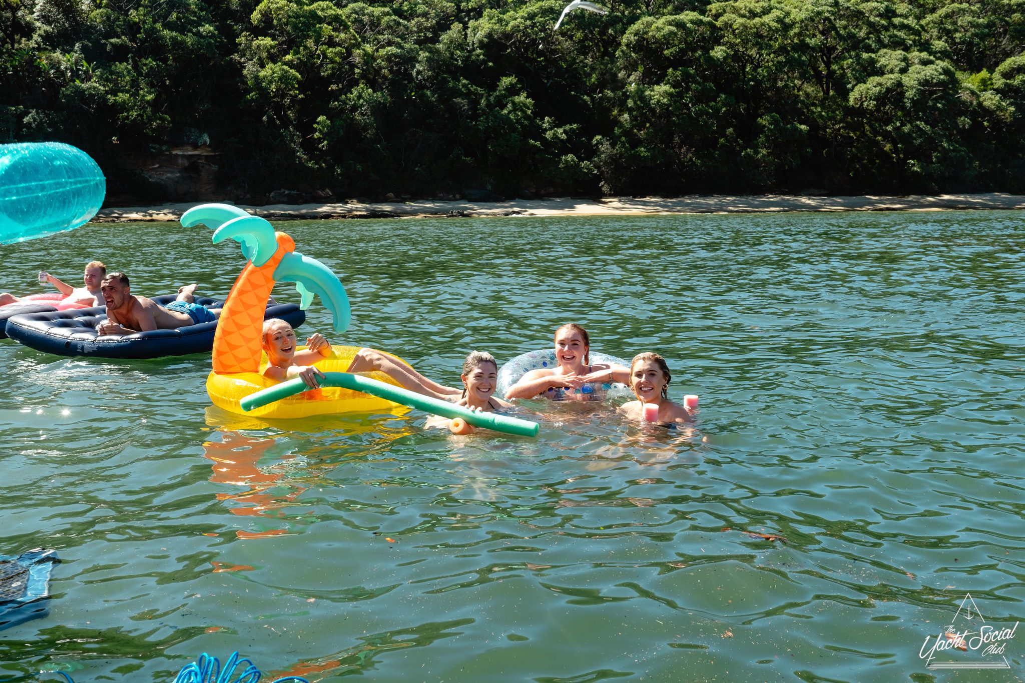 Two women in swimsuits enjoy a sunny day on the water, holding vibrant pool floats, including a pink flamingo-shaped one. They smile and gesture enthusiastically amidst a festive atmosphere. Others swim and relax in the background, showcasing fun outdoor activities enjoyed at Sydney Harbour Boat Hire The Yacht Social Club.
