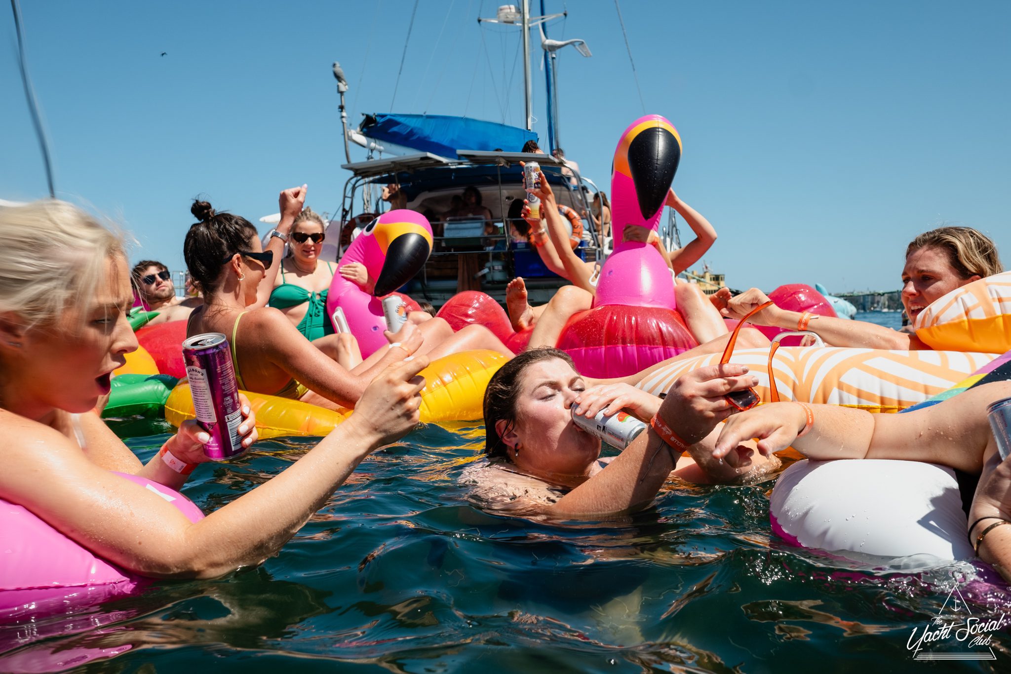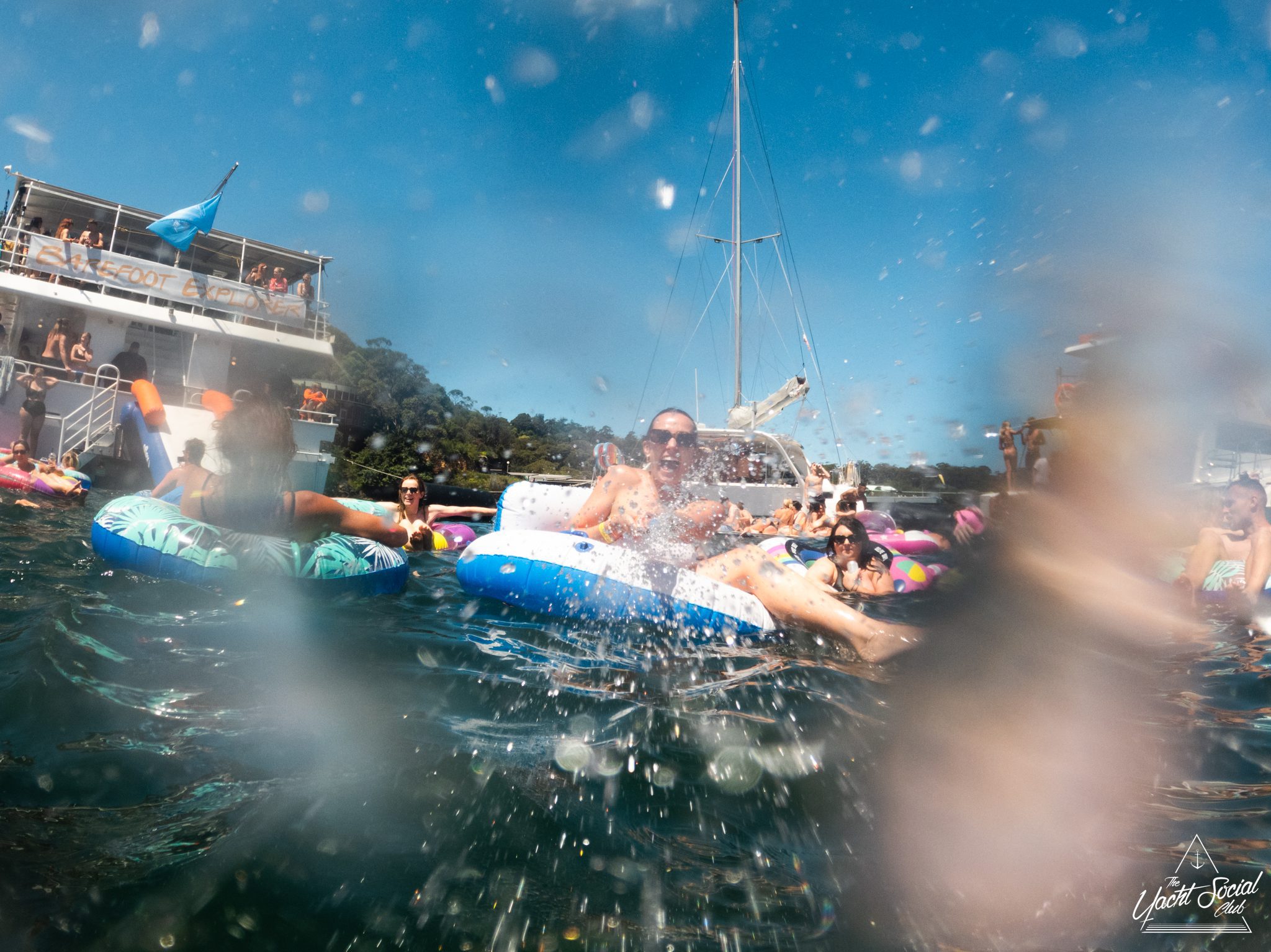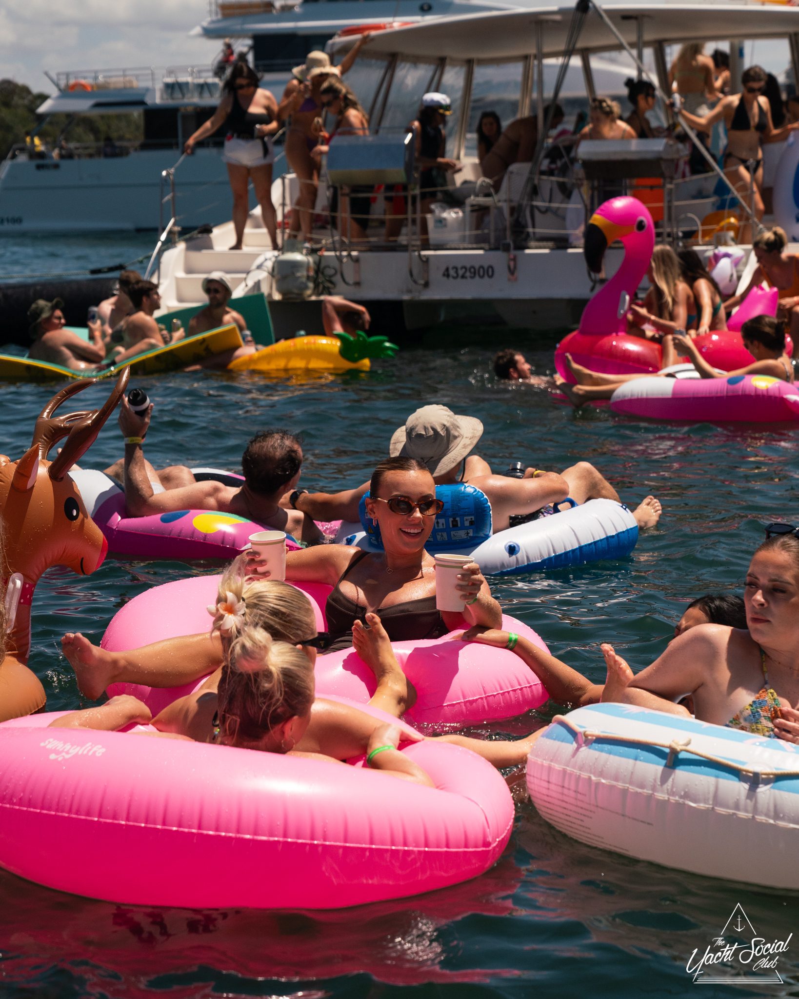People on inflatable pool floats enjoy drinks in the water near a catamaran party Sydney on a sunny day.