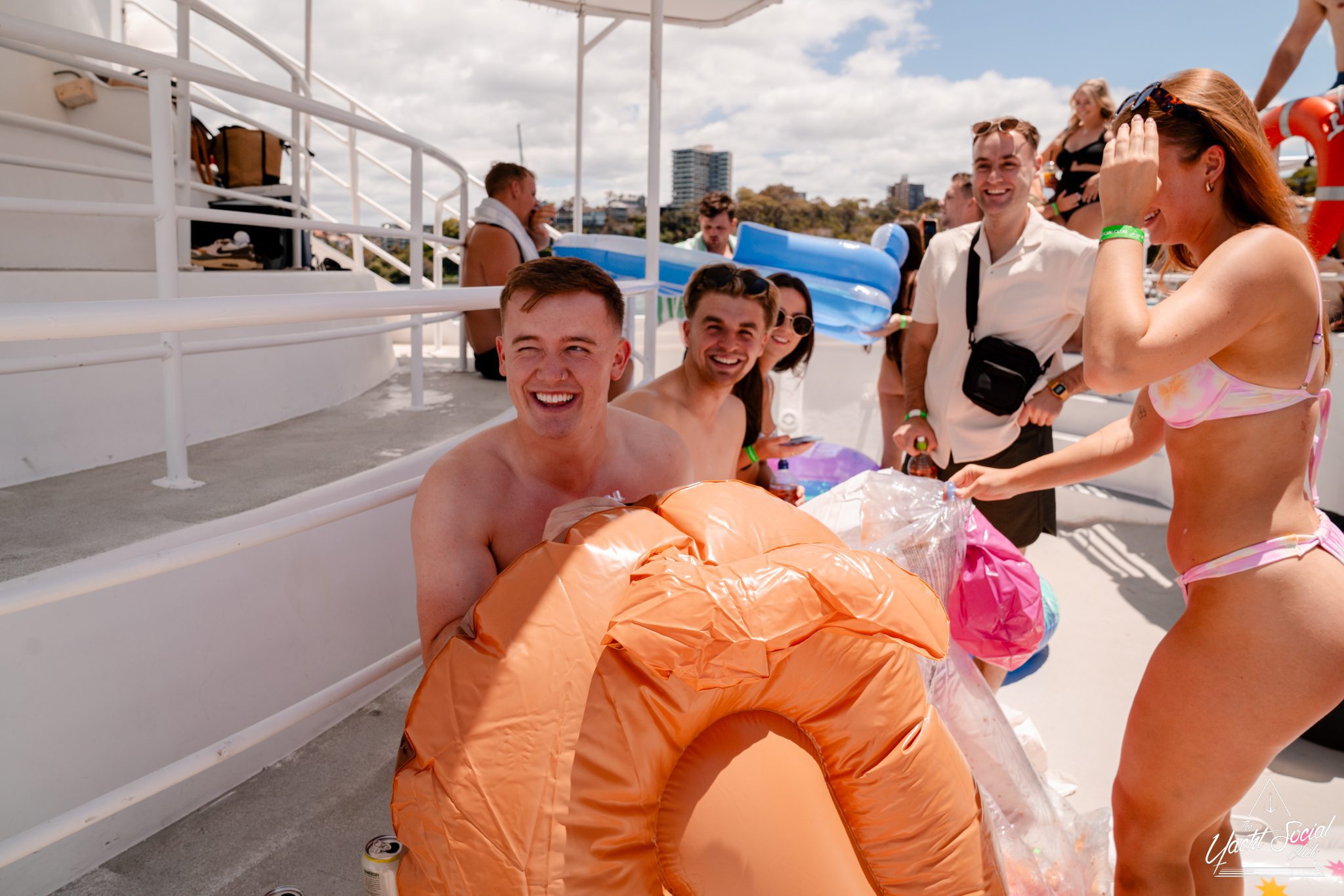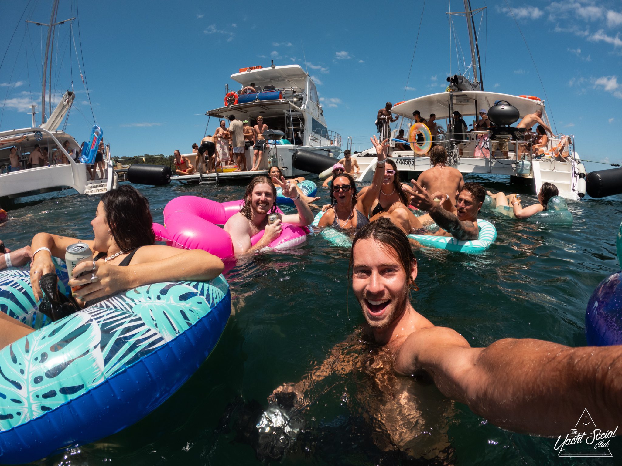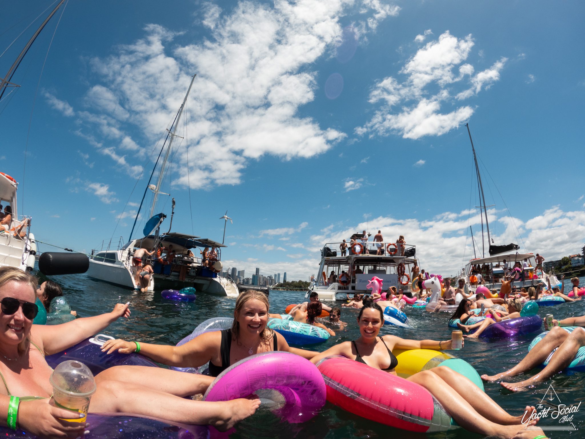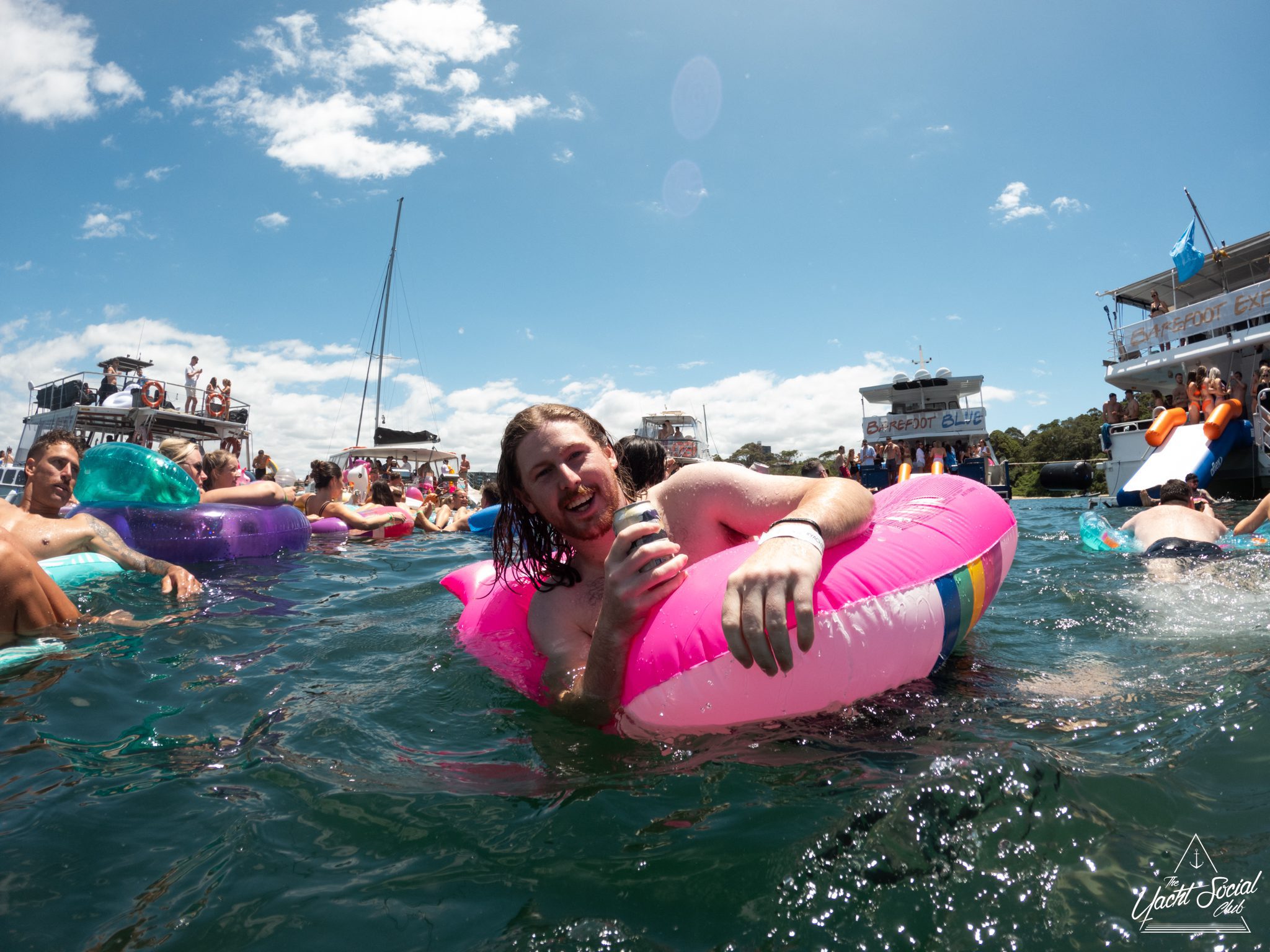 People on inflatable pool floats enjoy drinks in the water near a catamaran party Sydney on a sunny day.