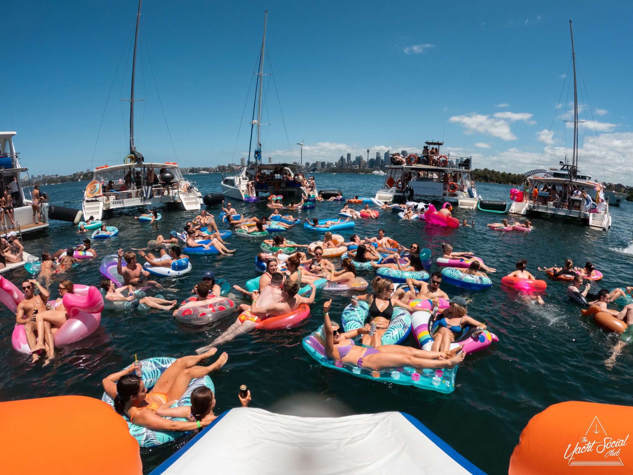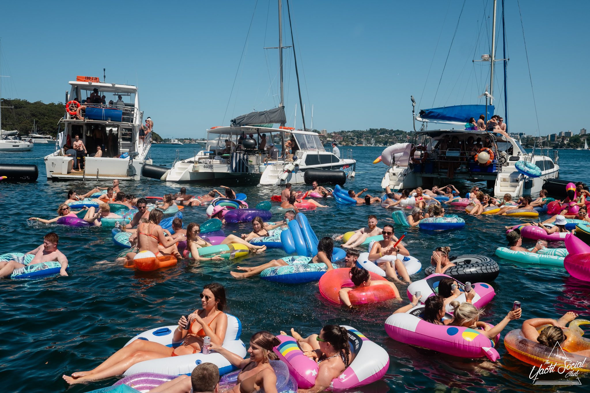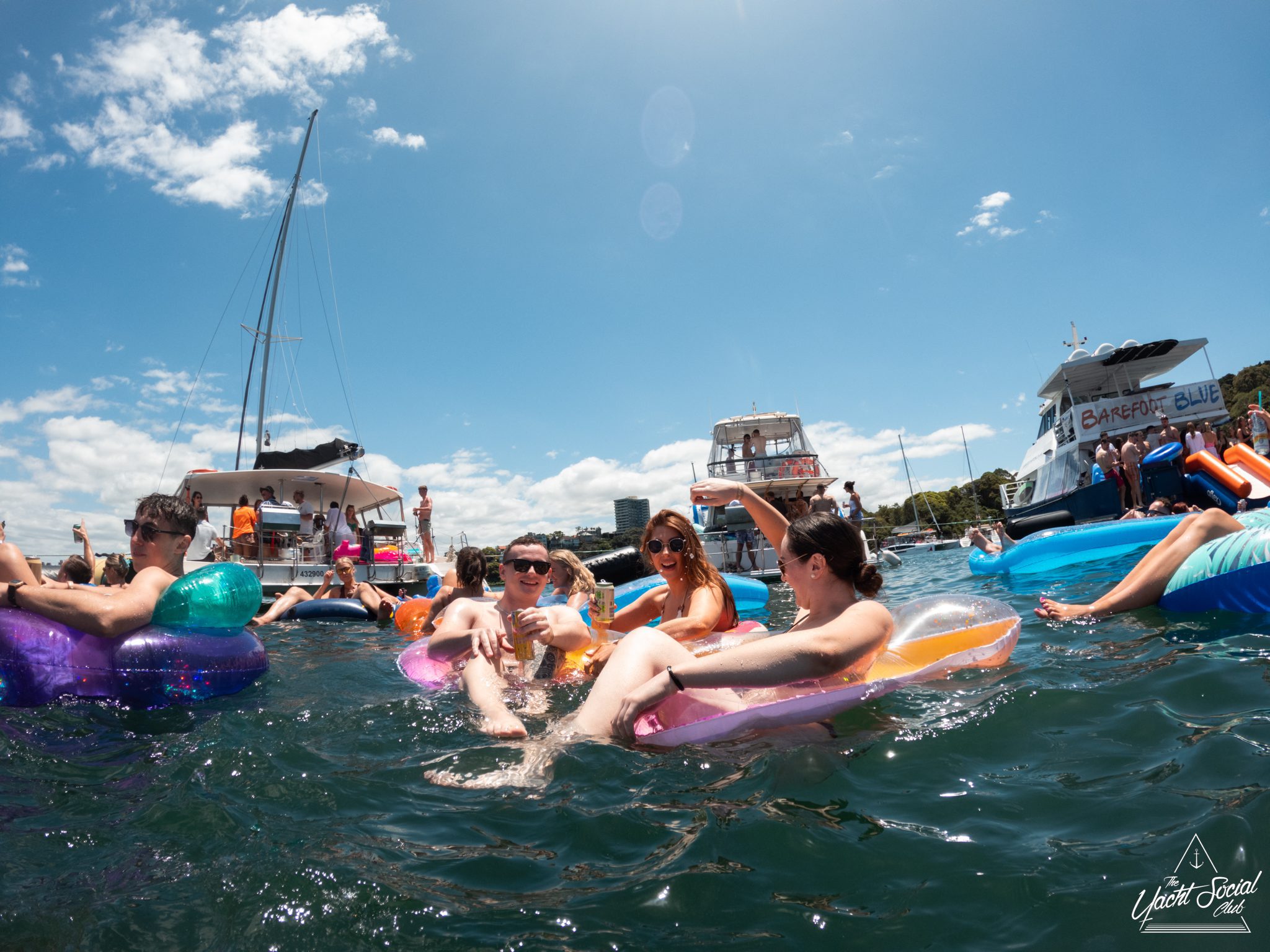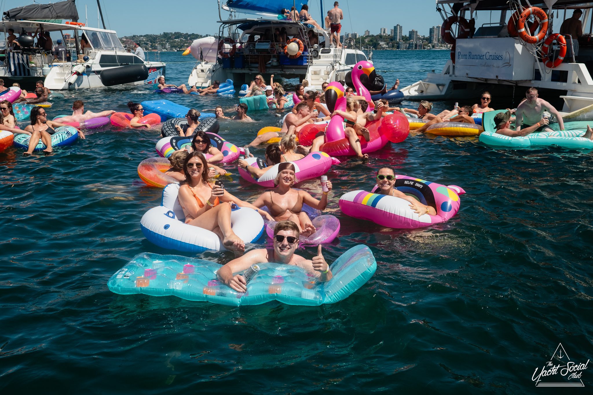 A group of people floats on inflatable rafts and toys on a body of water near several docked boats on a sunny day, creating the perfect backdrop for a Sydney boat party hire.