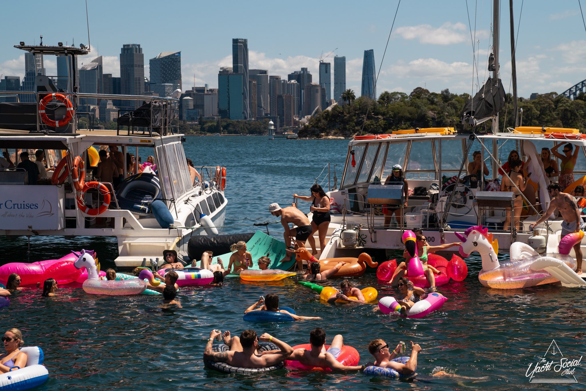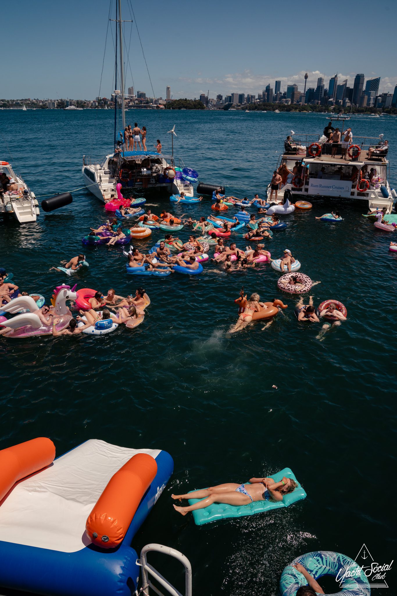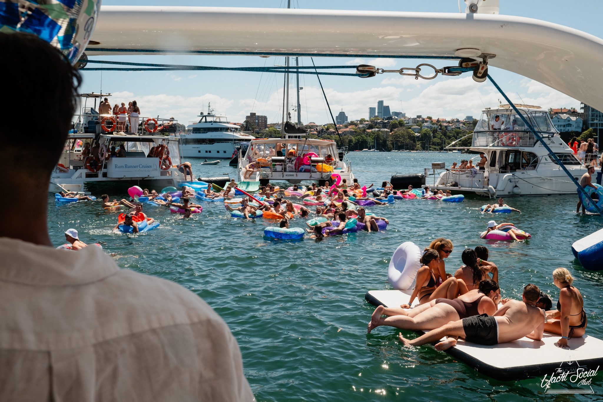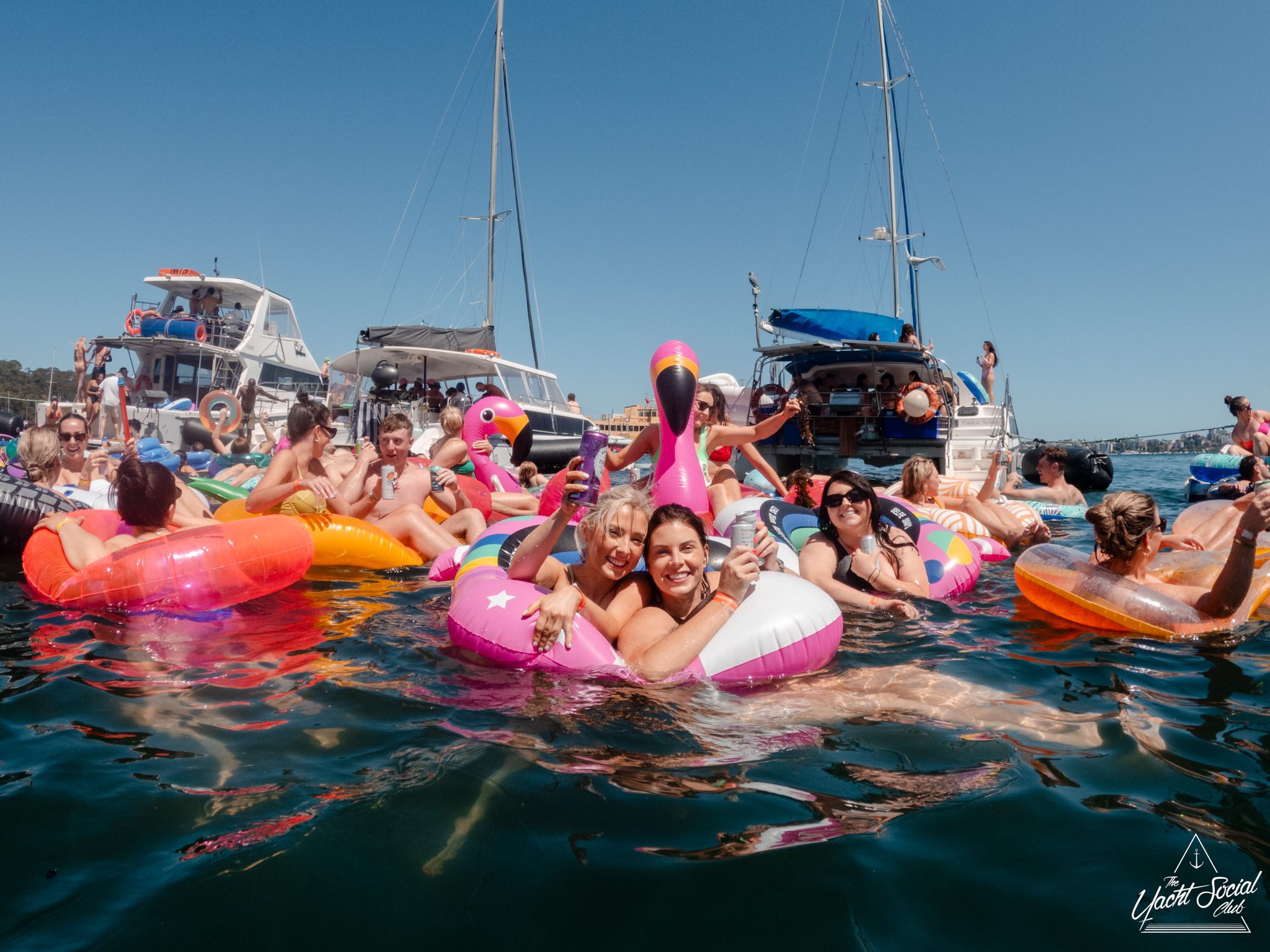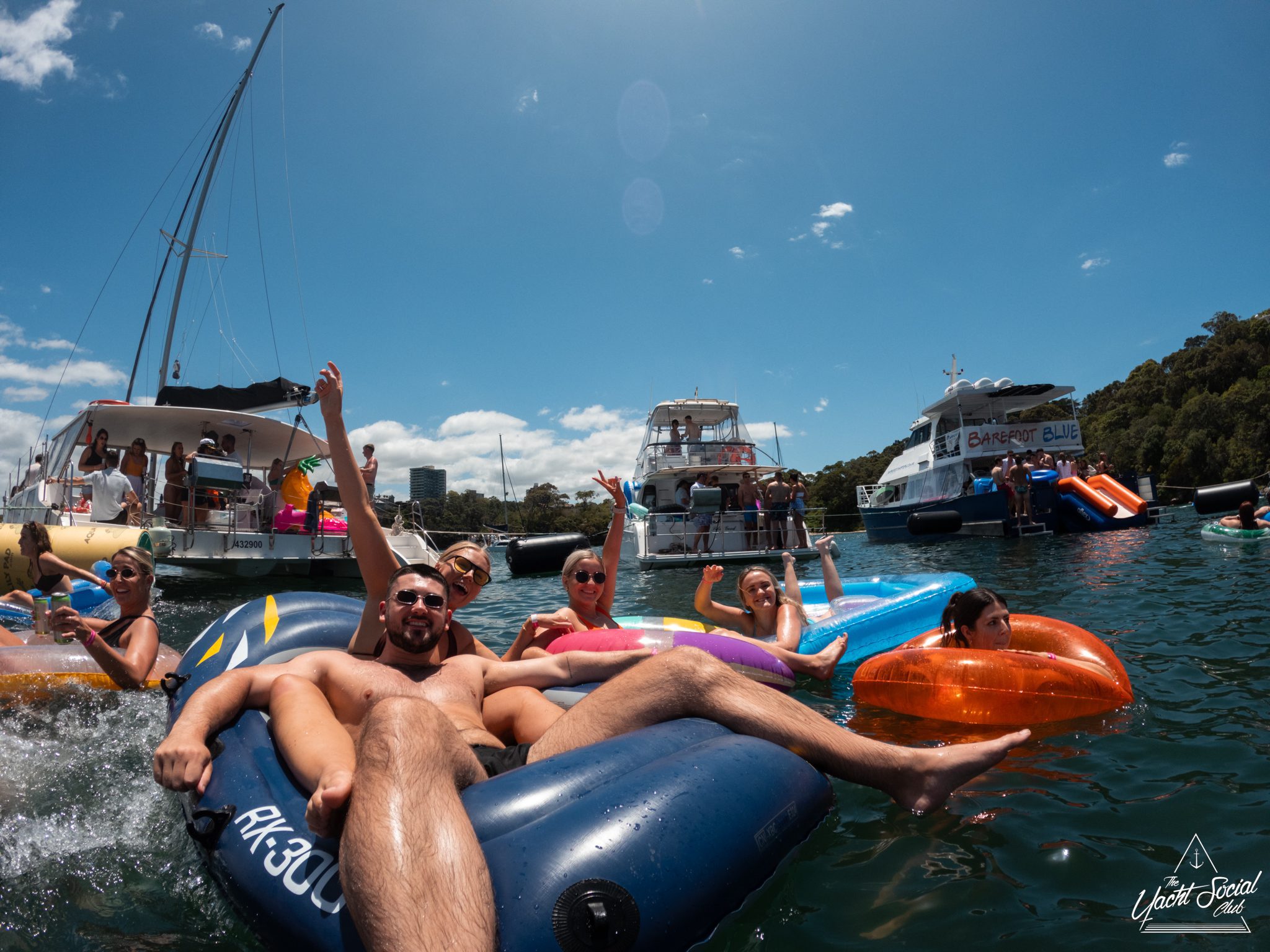 A group of people floats on inflatable rafts and toys on a body of water near several docked boats on a sunny day, creating the perfect backdrop for a Sydney boat party hire.