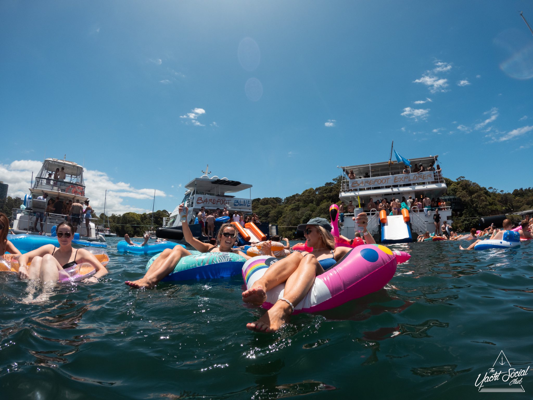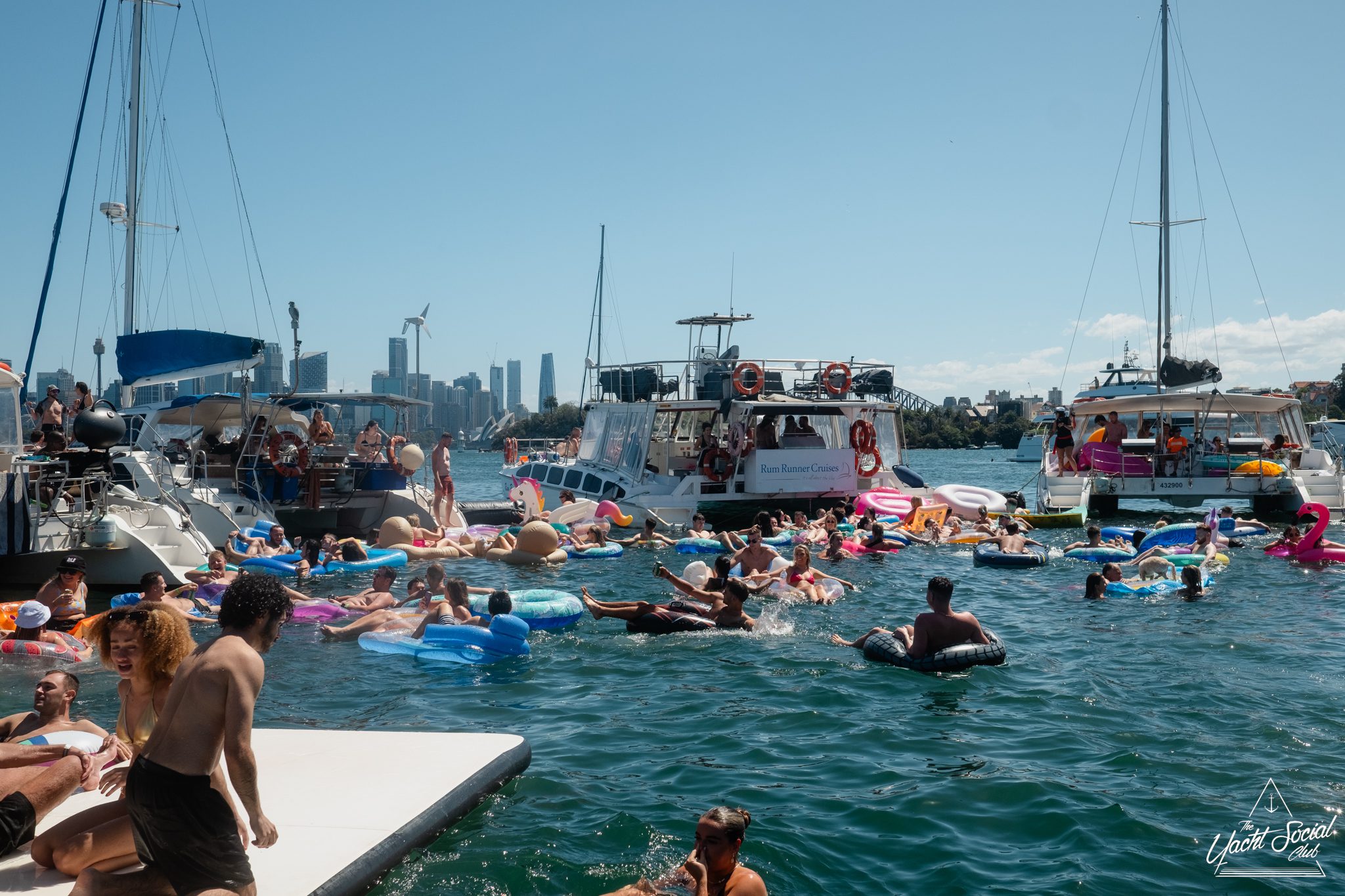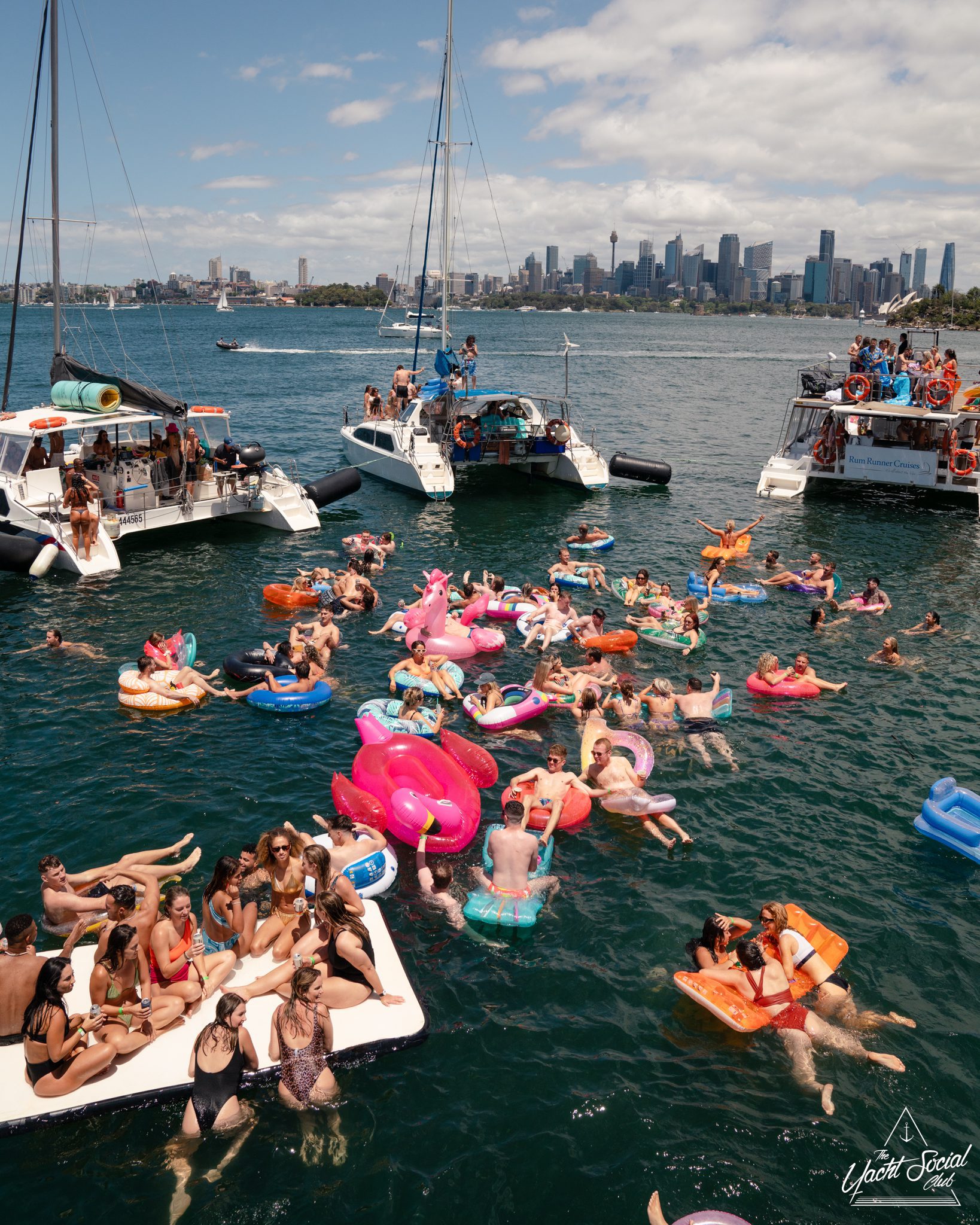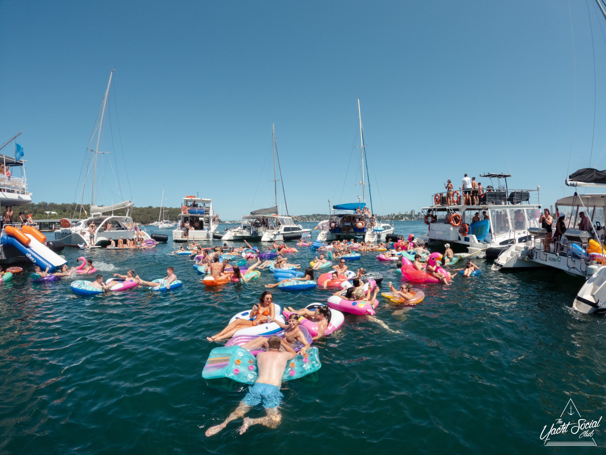 A group of people floats on inflatable rafts and toys on a body of water near several docked boats on a sunny day, creating the perfect backdrop for a Sydney boat party hire.