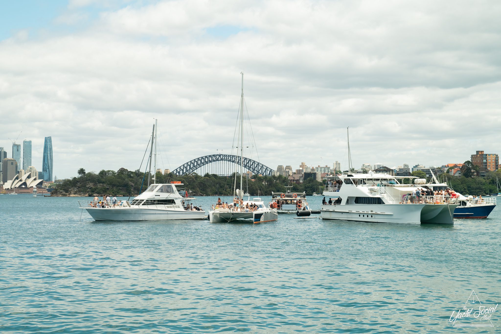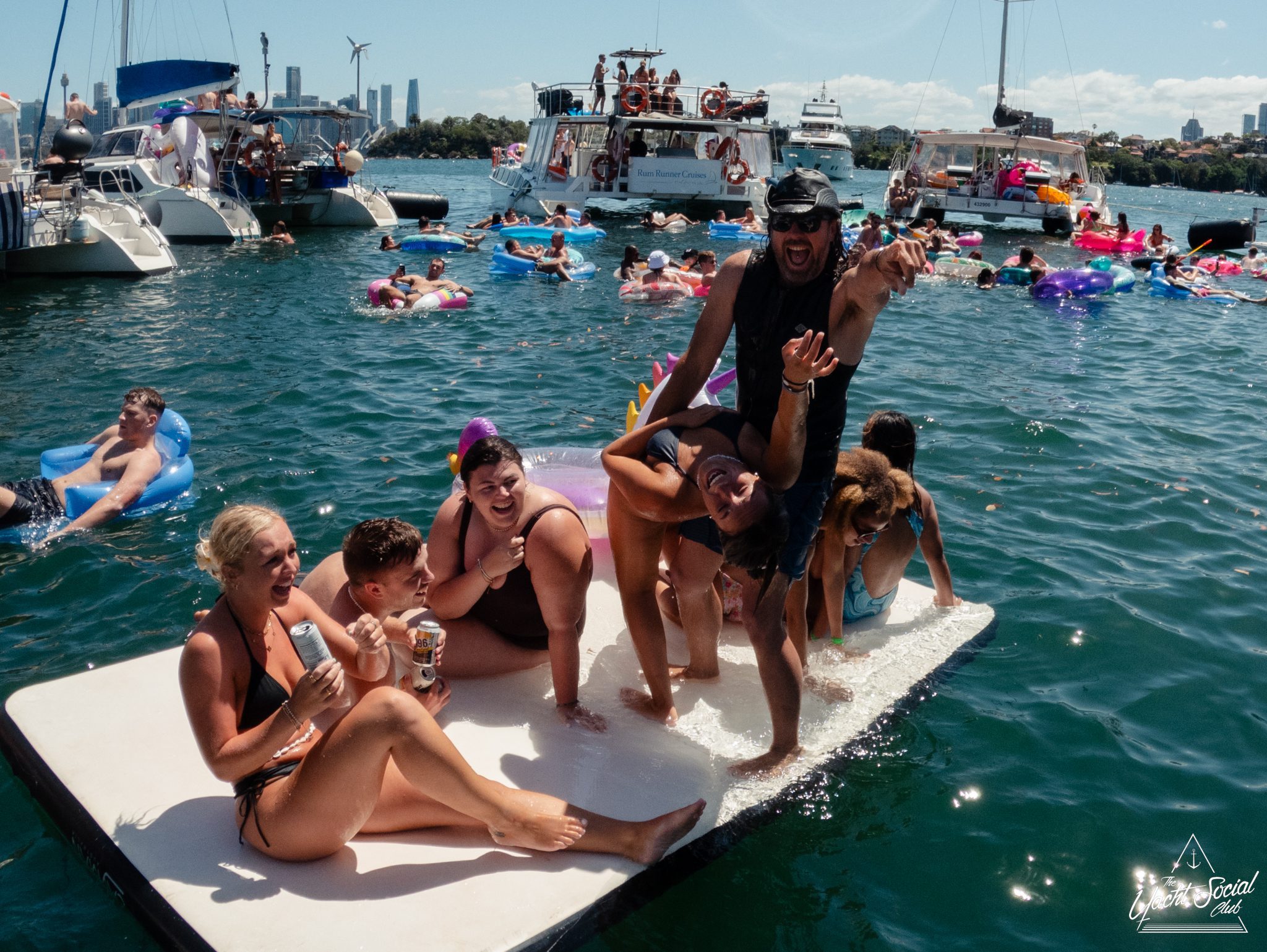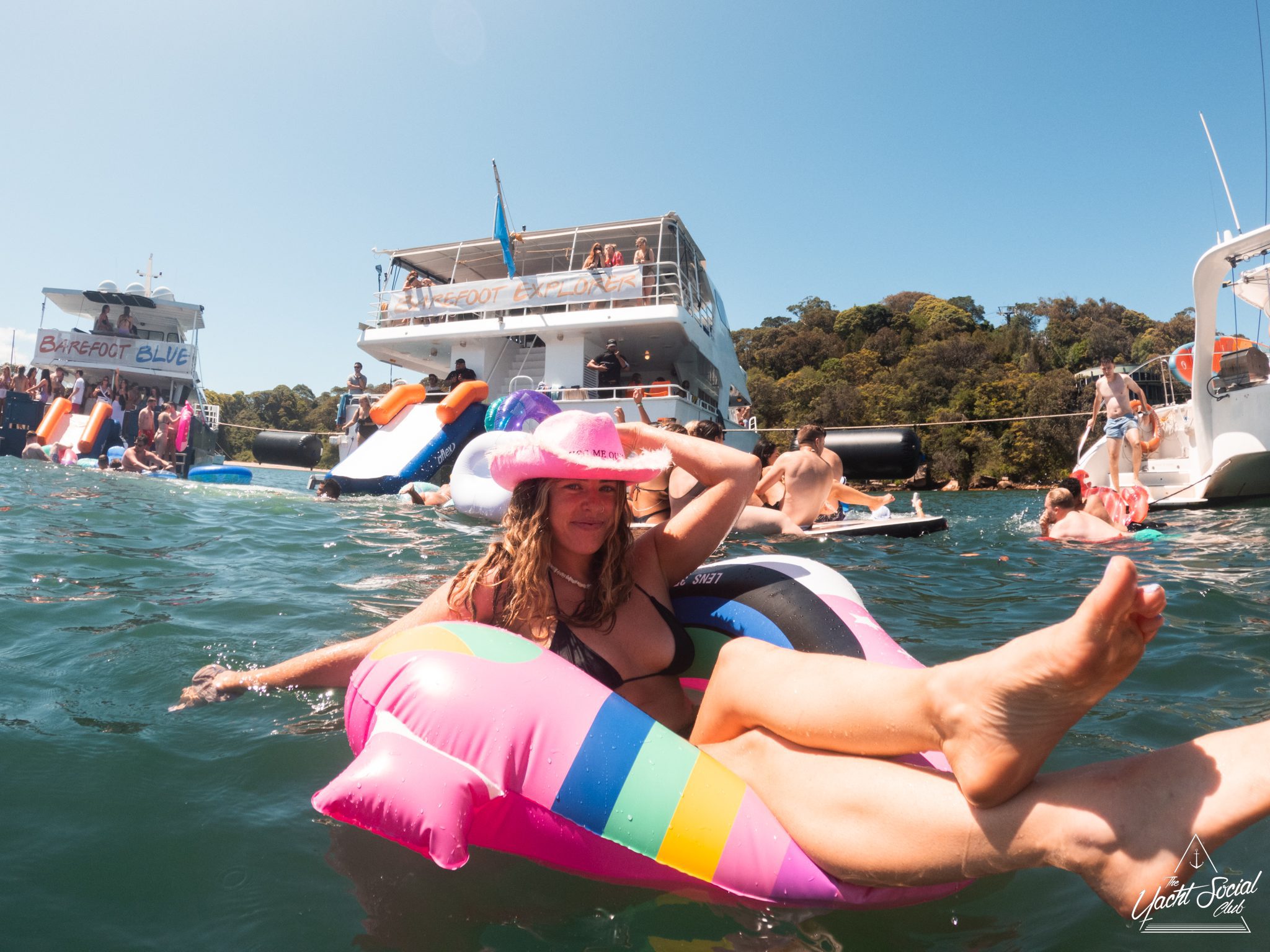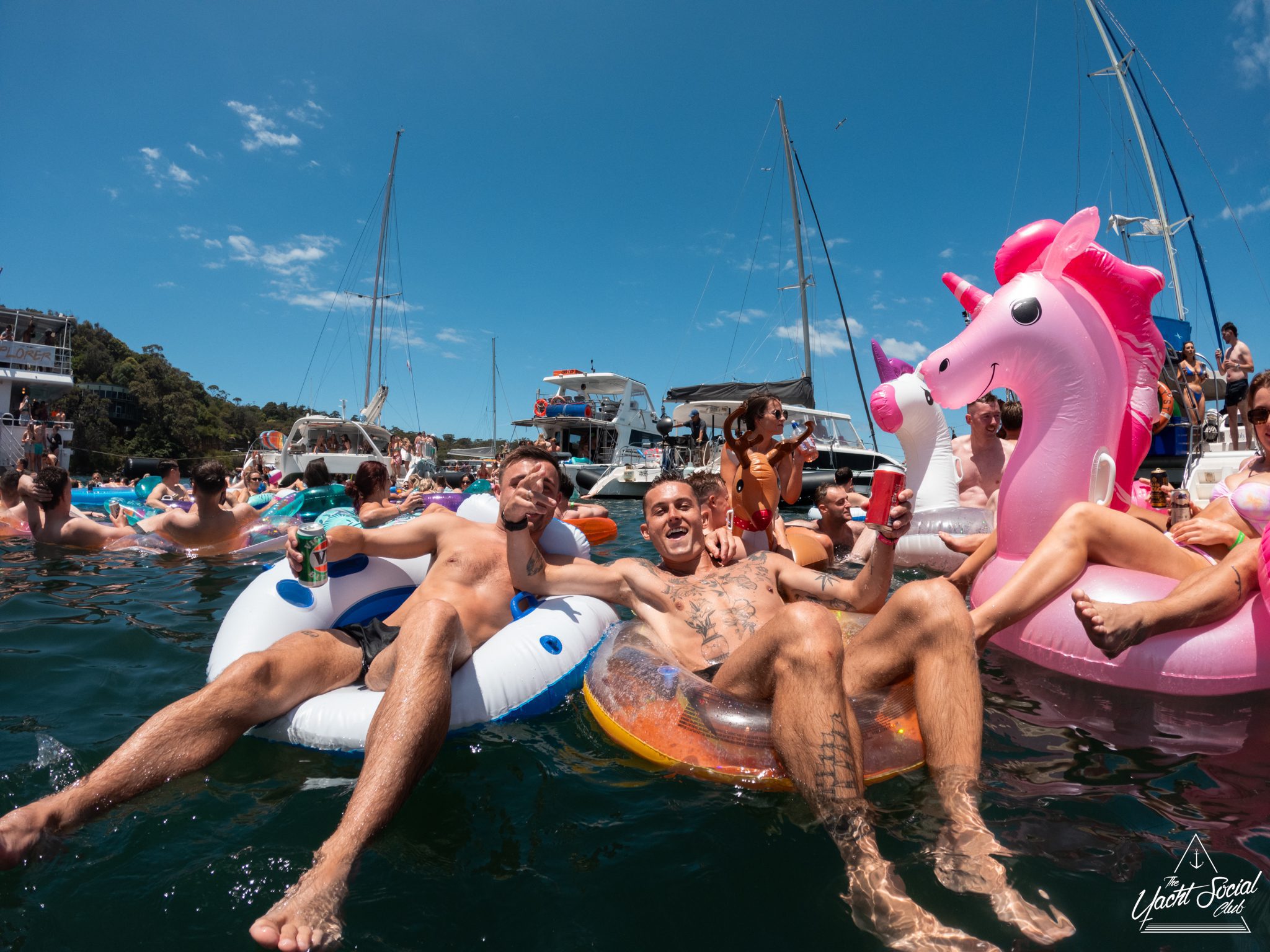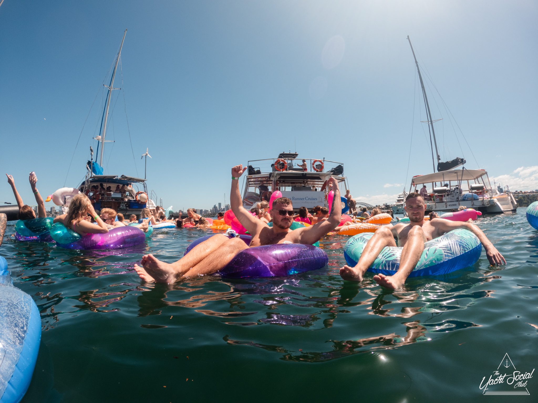 A group of people floats on inflatable rafts and toys on a body of water near several docked boats on a sunny day, creating the perfect backdrop for a Sydney boat party hire.