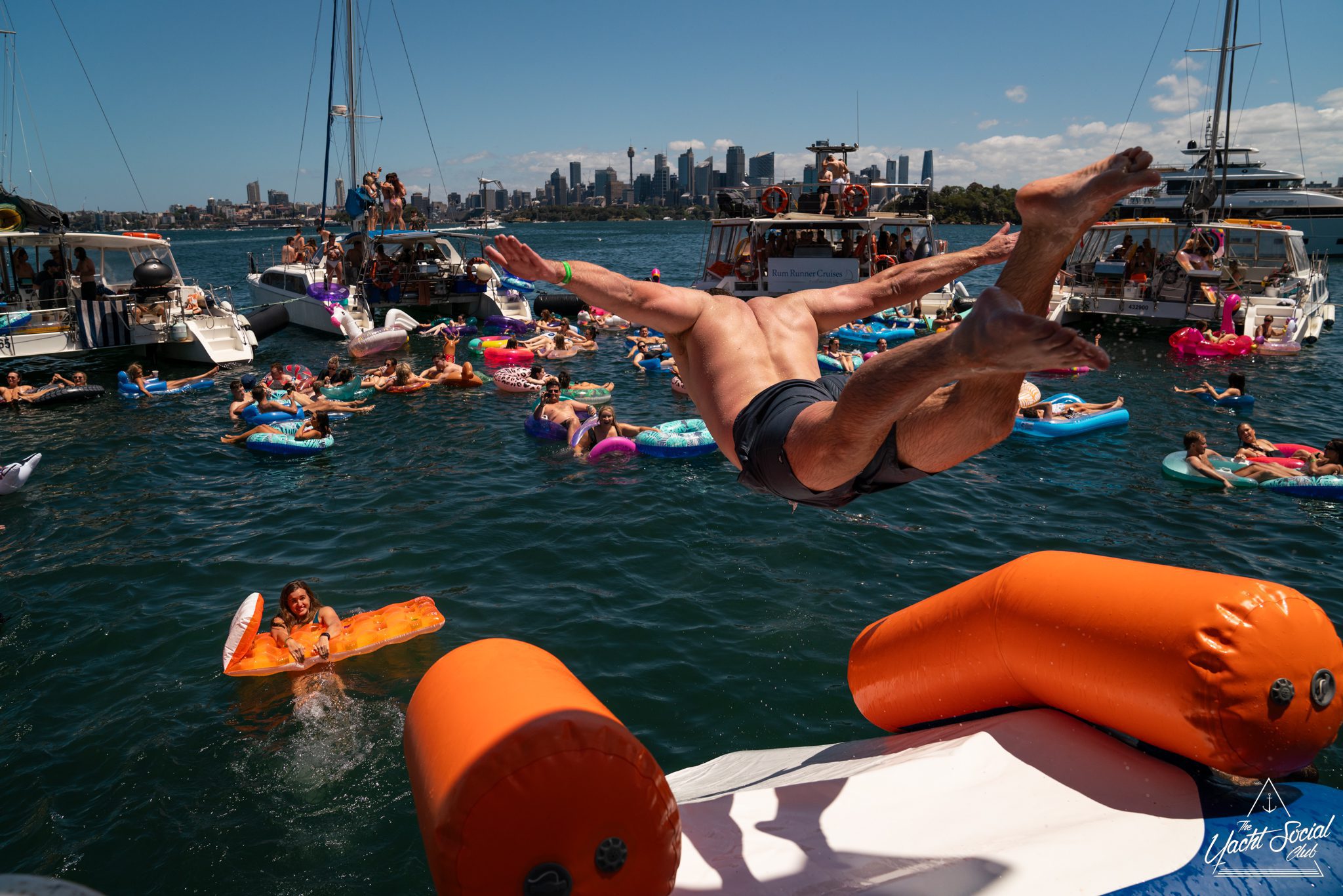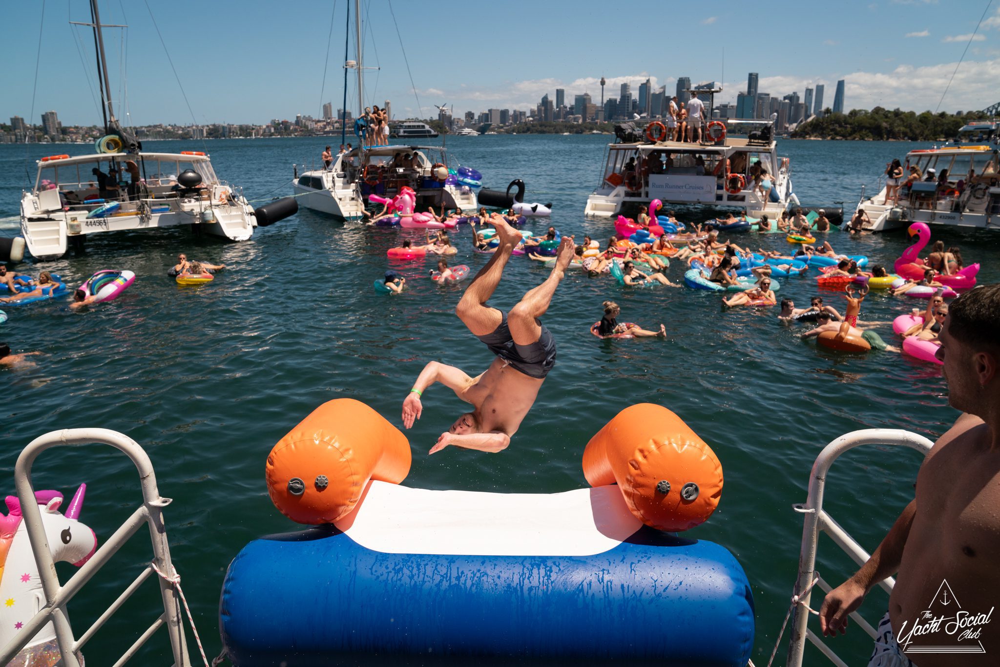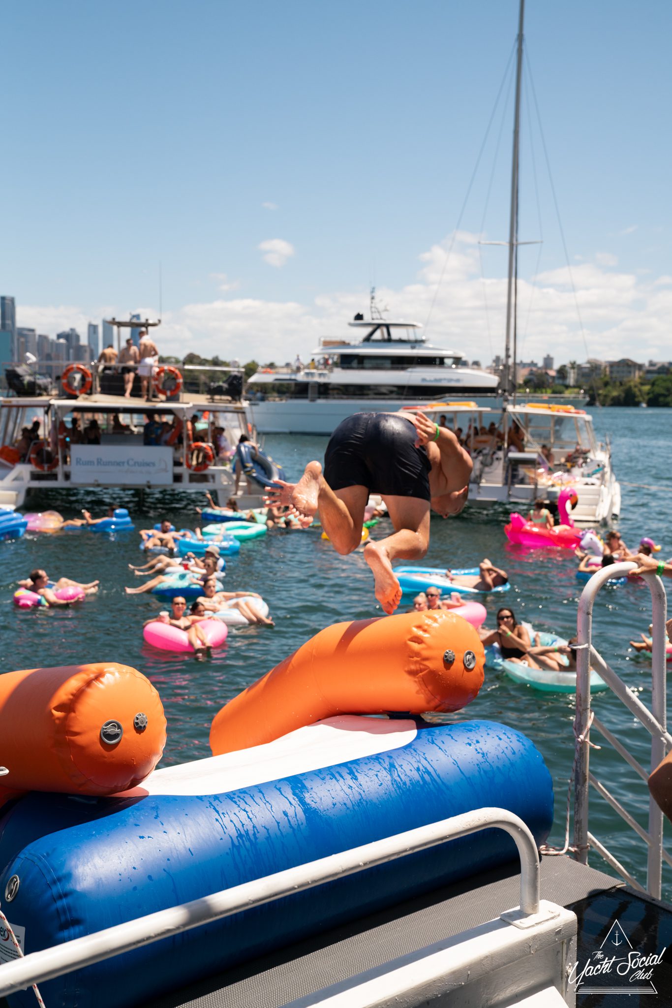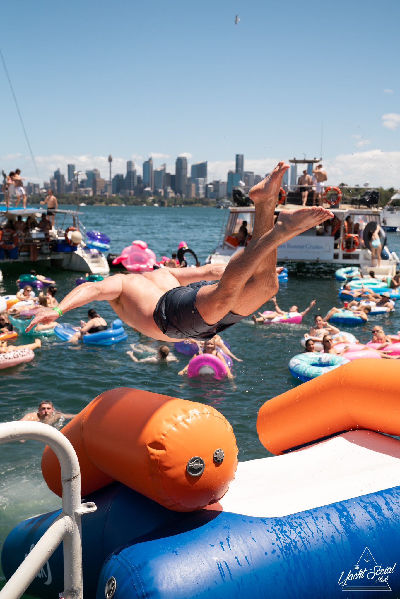 People are enjoying a sunny day on the water, using various inflatables. One person is diving off a large inflatable platform while others float nearby, all under the backdrop of a luxurious yacht hire in Sydney.