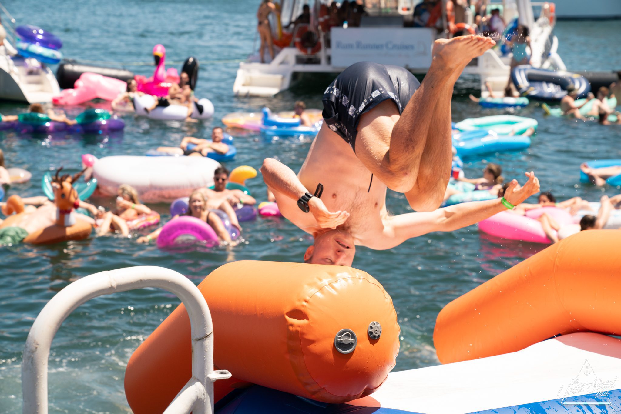 A man in black shorts jumps into a vibrant blue body of water from an orange and white float. Several people, boats, and floaties are visible around him, with a city skyline and clear blue sky in the background. Various inflatables add to the lively atmosphere of this summer getaway.