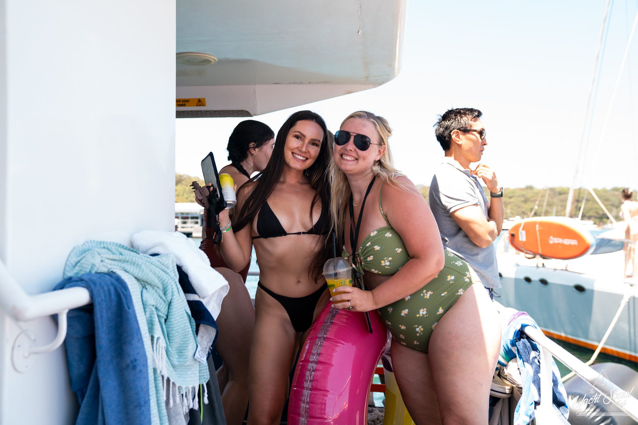 A group of people in swimwear are on a boat. Two women pose for a photo, one wearing a green bikini and a leaf-patterned wrap, and the other in a black bikini with a white wrap. Others stand or take photos at this luxurious catamaran party in Sydney, enjoying the perfect Sydney boat party hire experience.