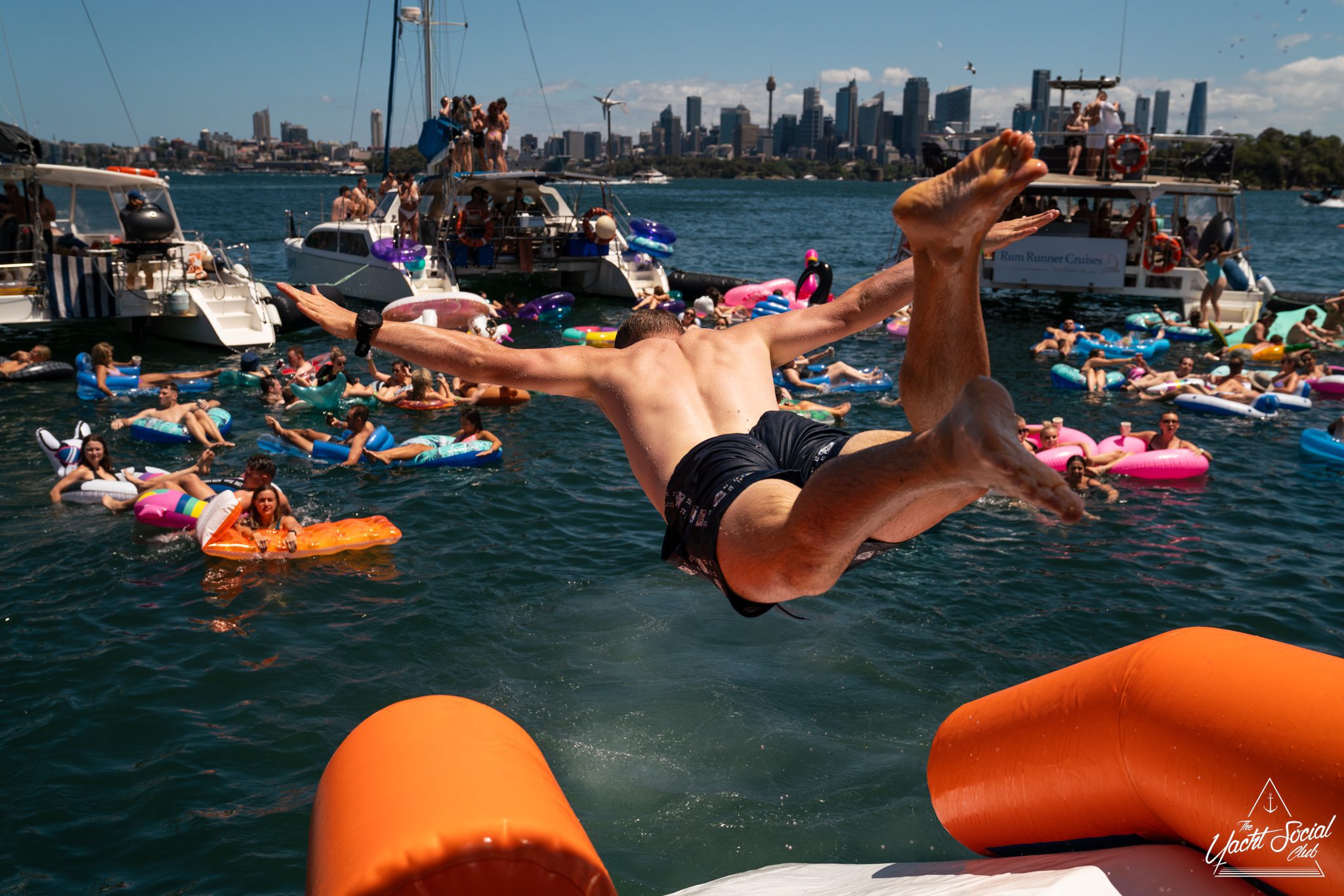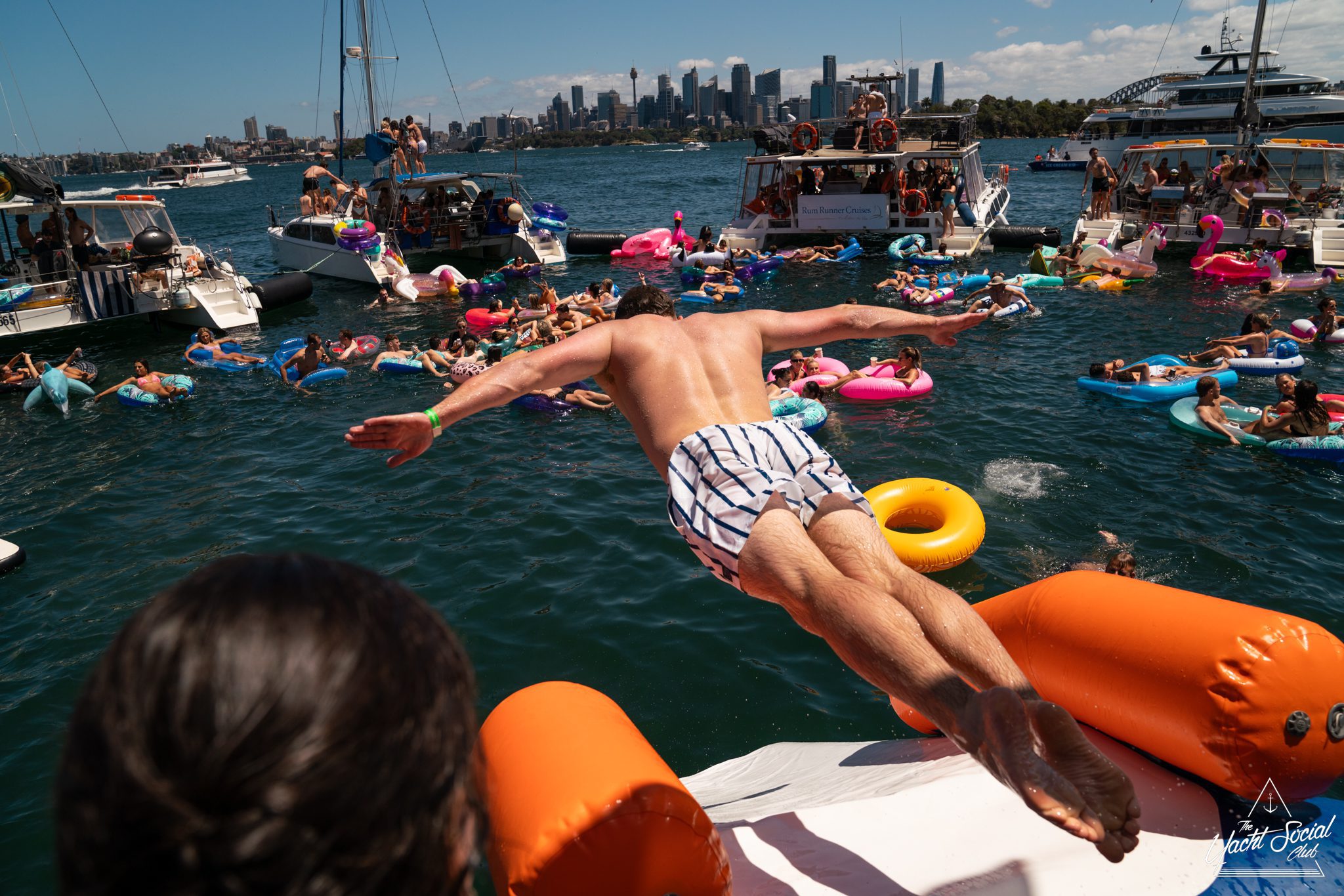 Two people in swimsuits jump off a boat onto a water inflatable in a harbor filled with other boats and swimmers. A city skyline is visible in the background, showcasing the excitement of Sydney boat party hire.