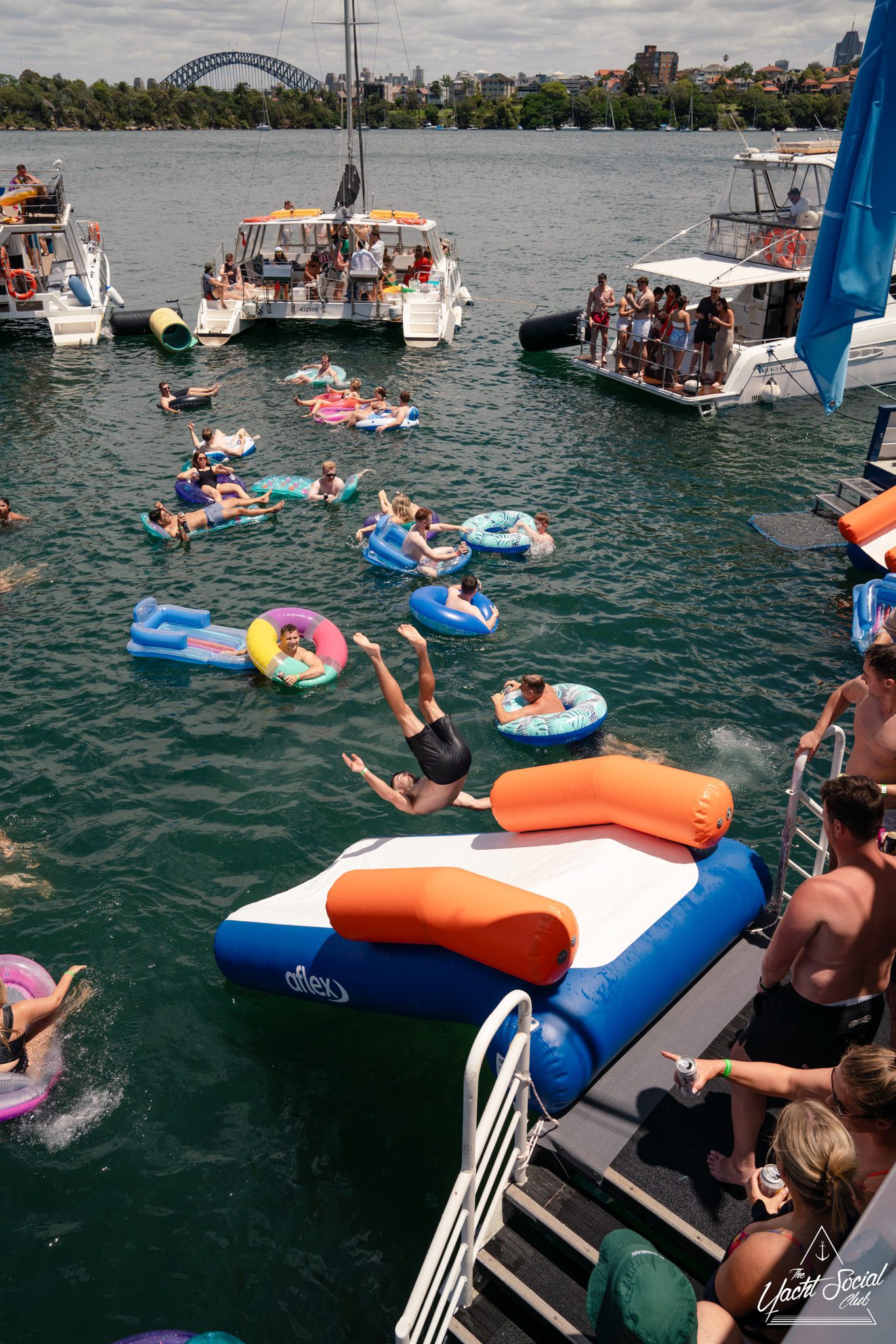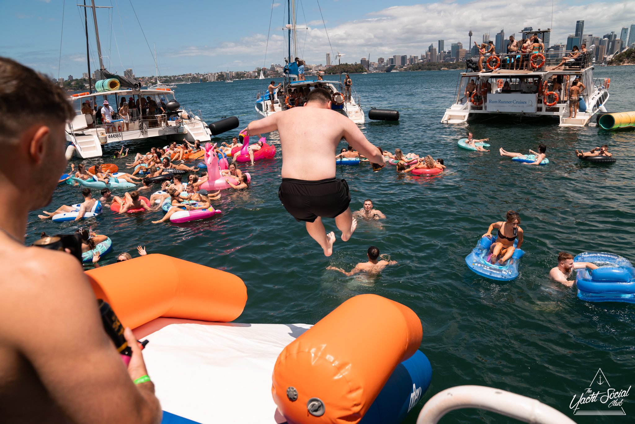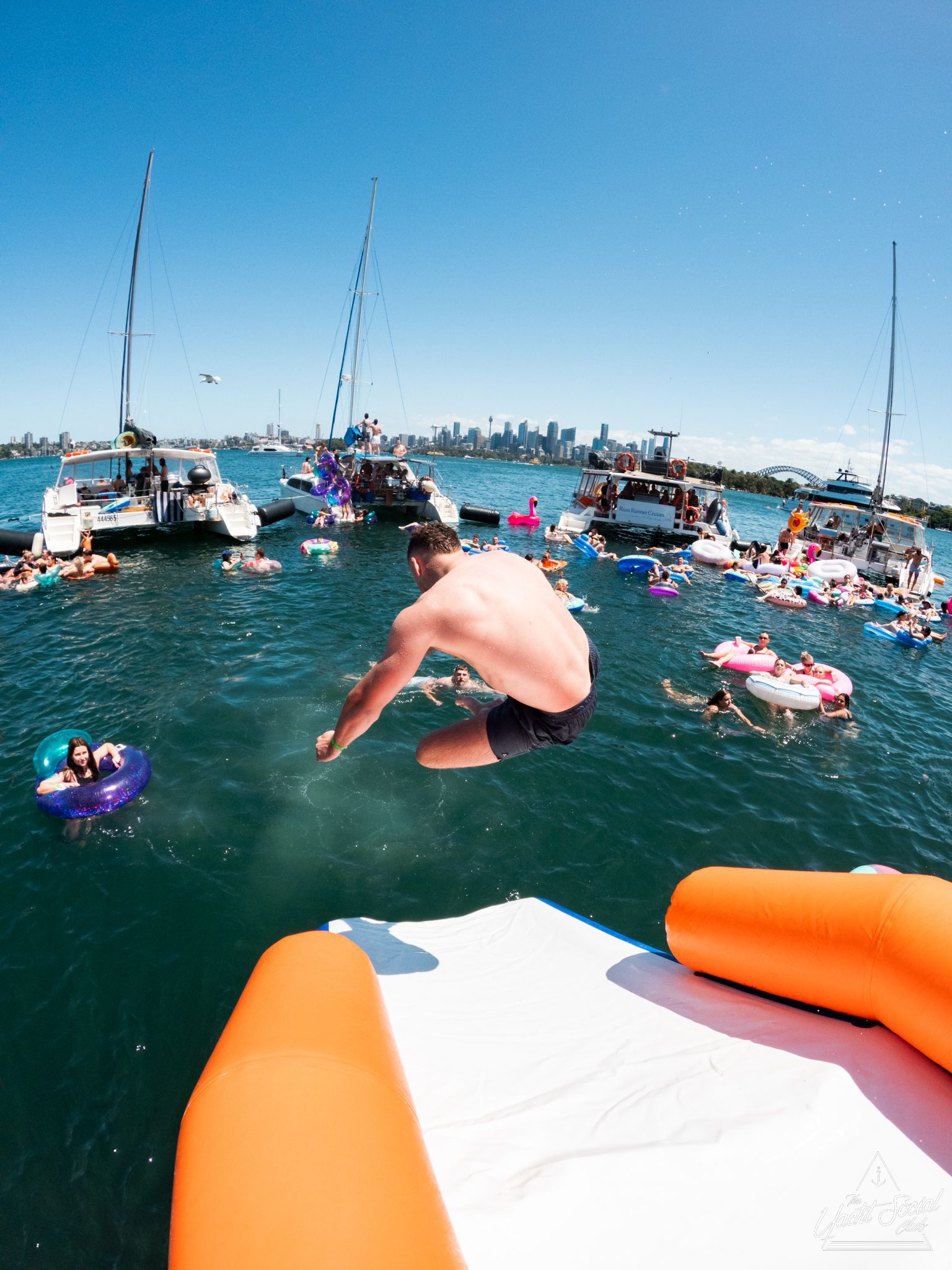 A group of people enjoying a sunny day on various inflatables and an inflatable platform in the water, with boats and onlookers in the background. Perfect for those interested in Sydney boat party hire or luxury yacht hire Sydney.