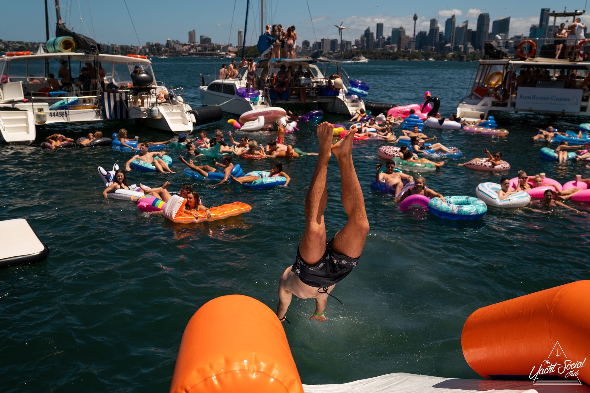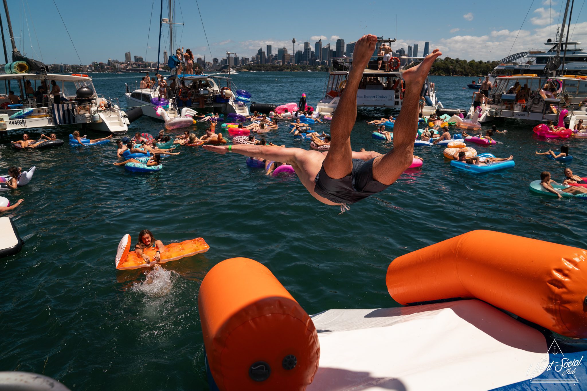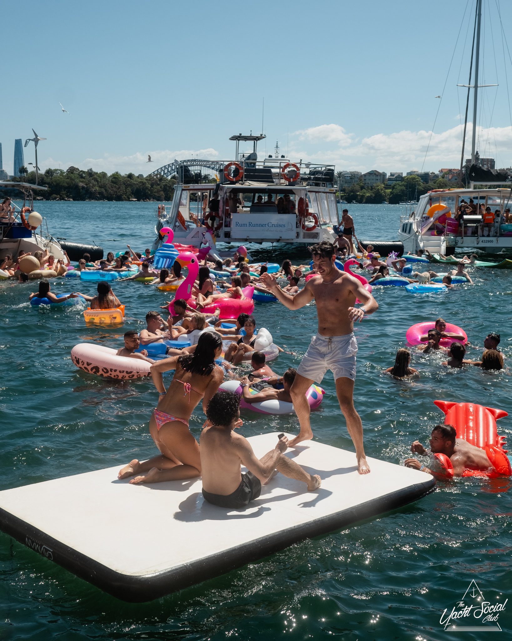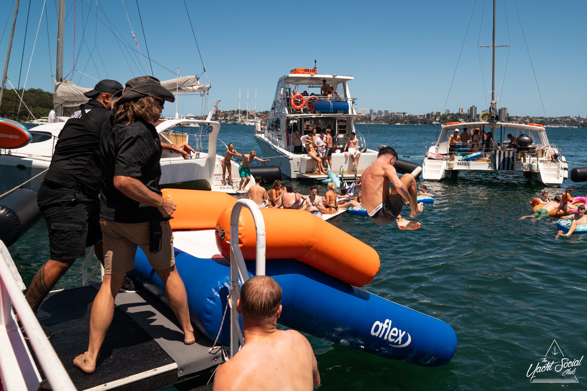 A group of people enjoying a sunny day on various inflatables and an inflatable platform in the water, with boats and onlookers in the background. Perfect for those interested in Sydney boat party hire or luxury yacht hire Sydney.