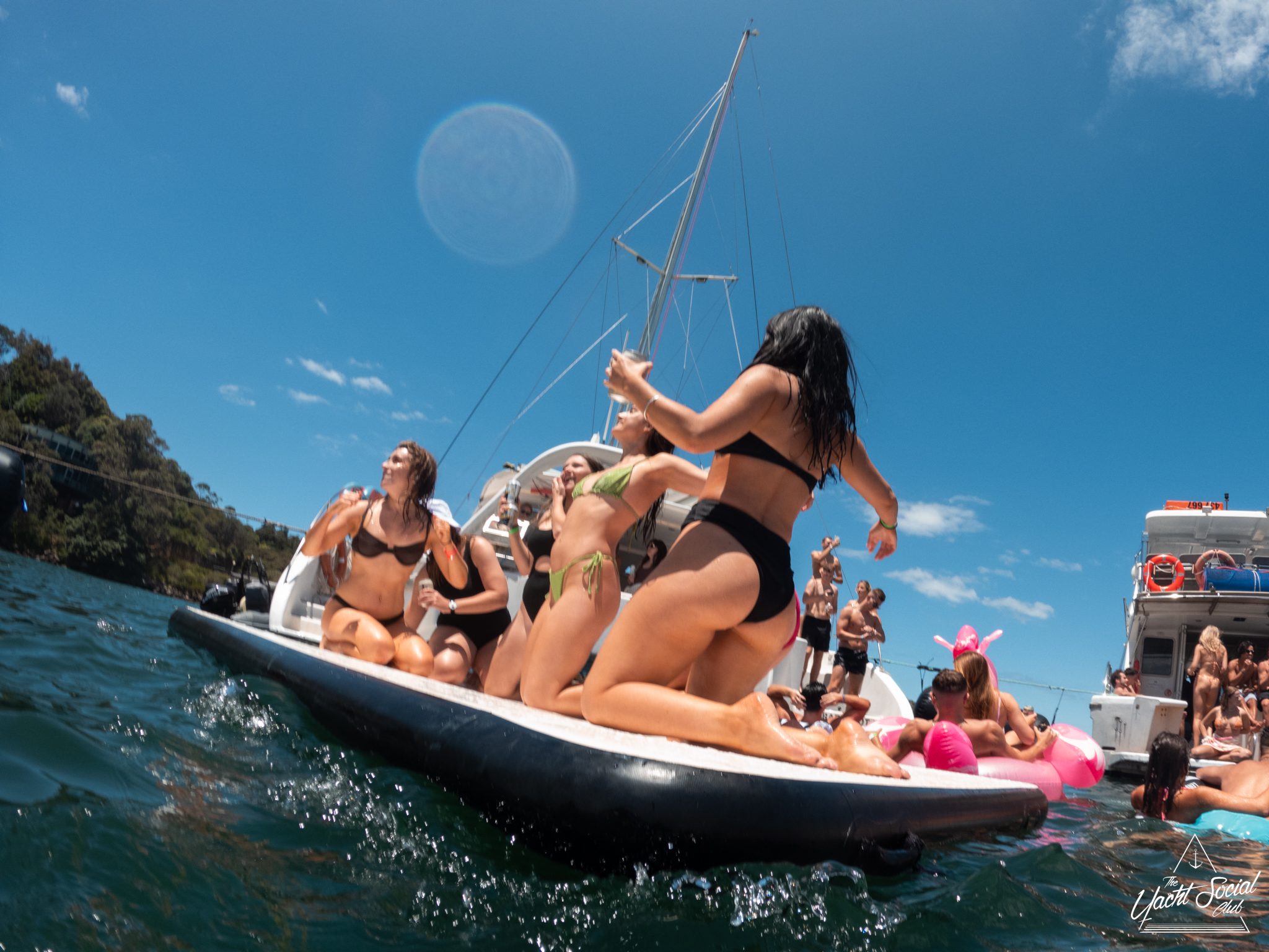 People in swimwear stand and interact on a floating platform attached to a two-story boat during a private yacht charter on Sydney Harbour, with inflatable toys in the water and trees visible in the background.