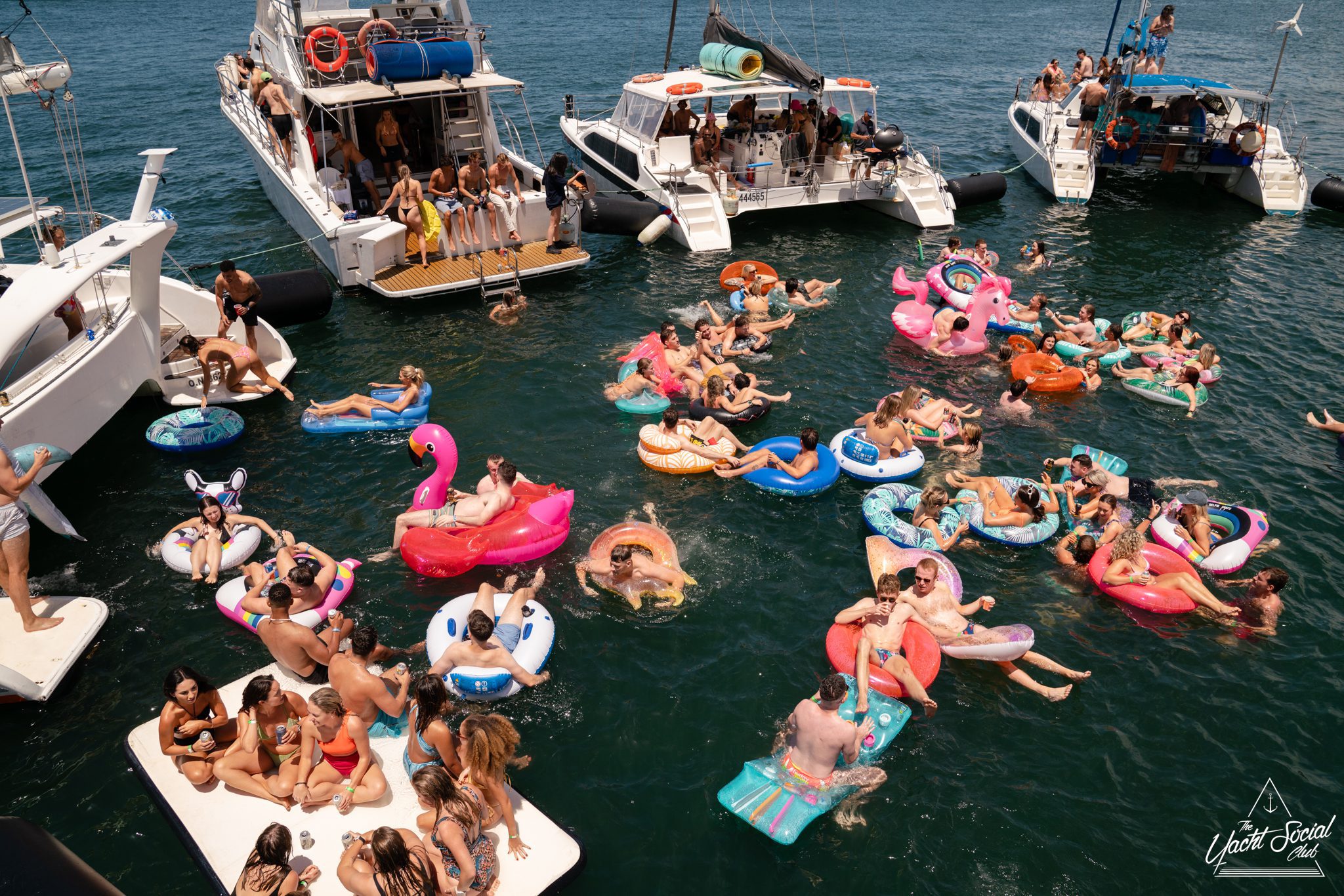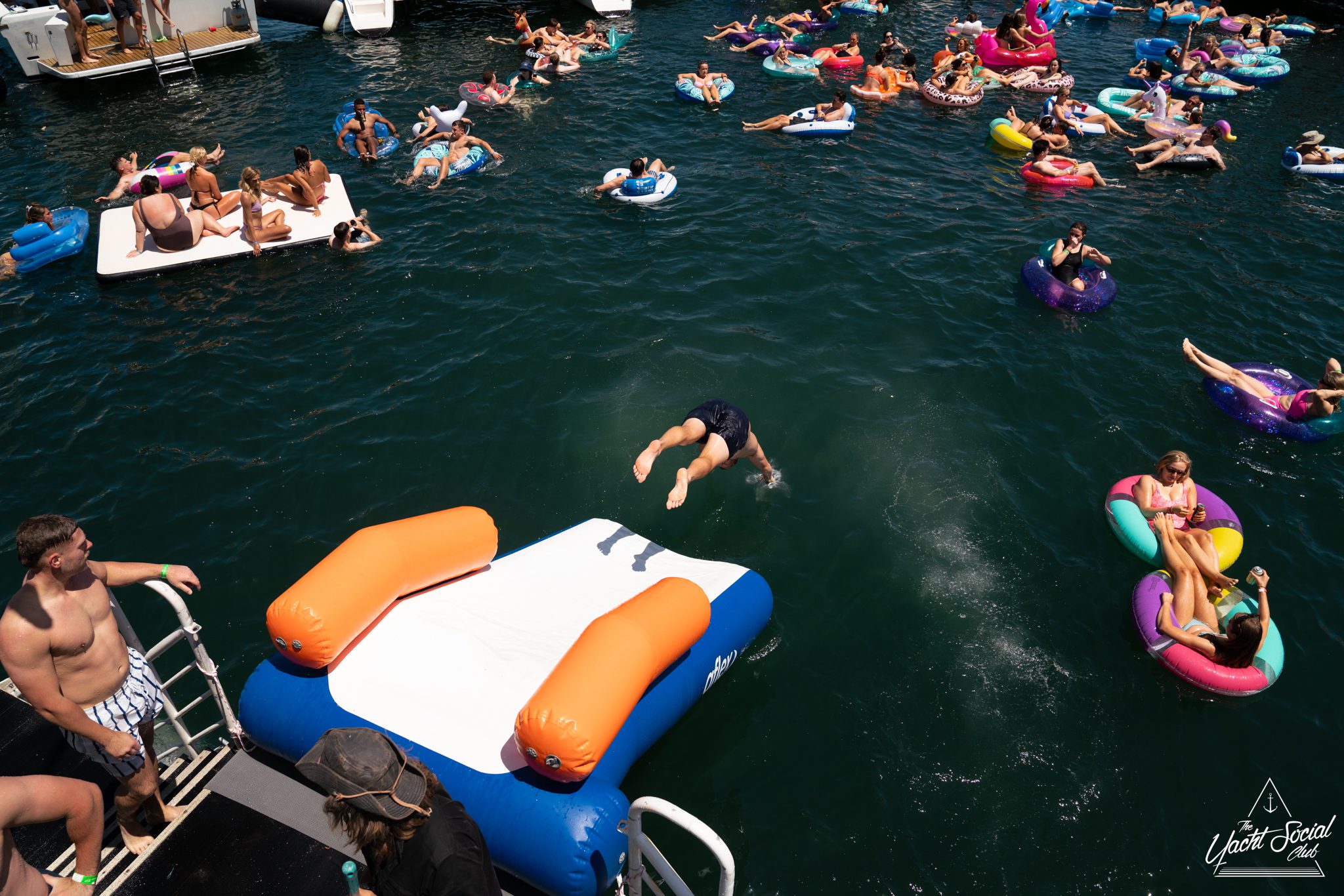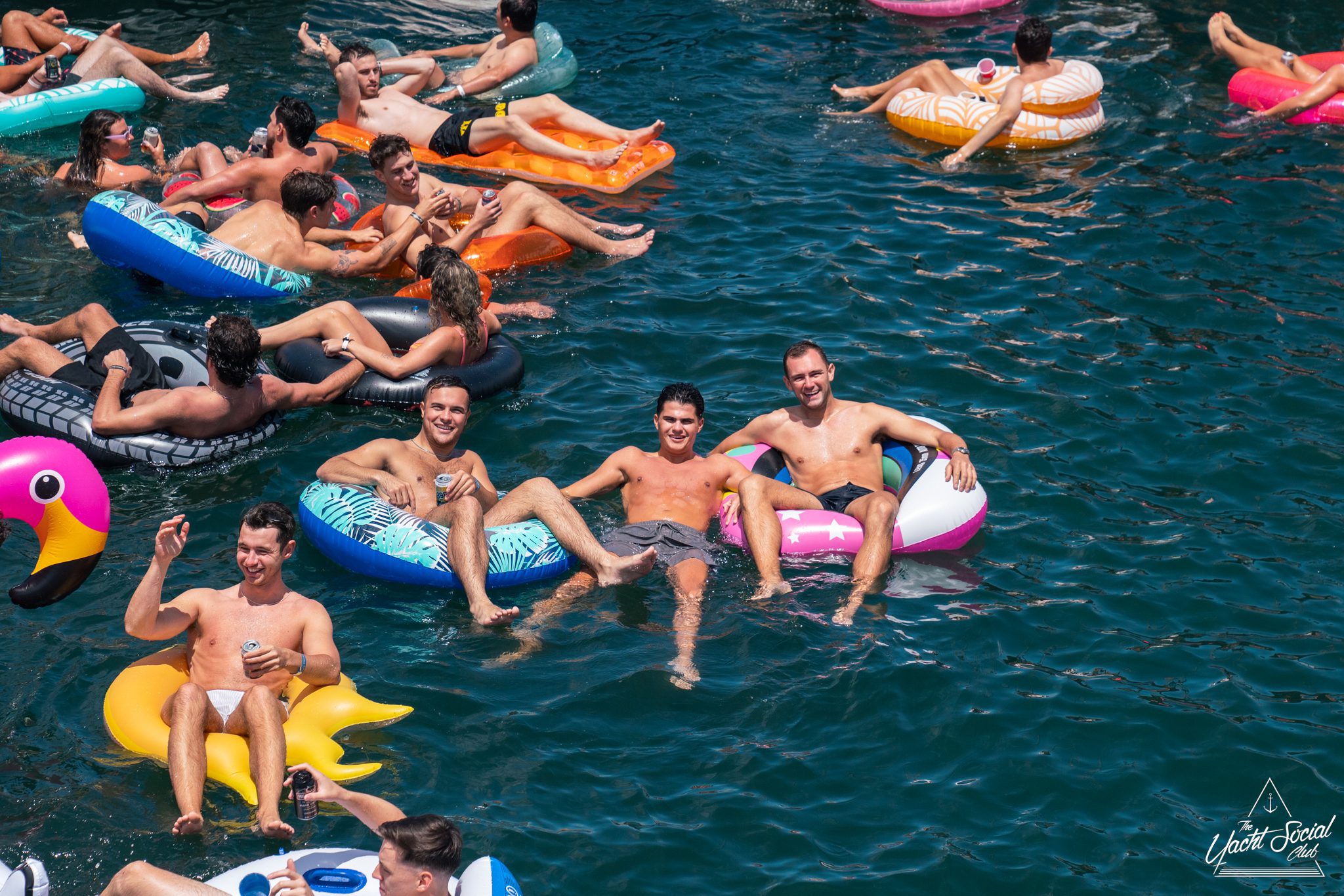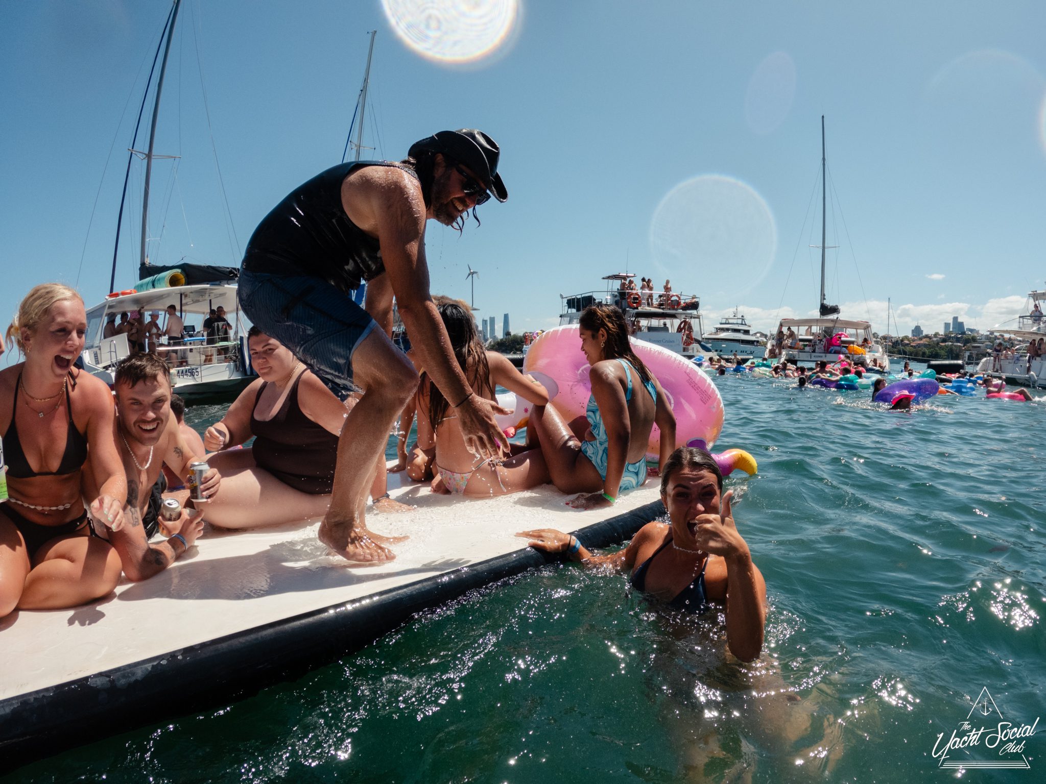 A group of people in swimsuits are standing and dancing on a floating platform on the water, holding drinks and enjoying themselves. Catamaran sailboats and other revelers decorate the background. The sky is clear and blue, adding to the festive atmosphere.