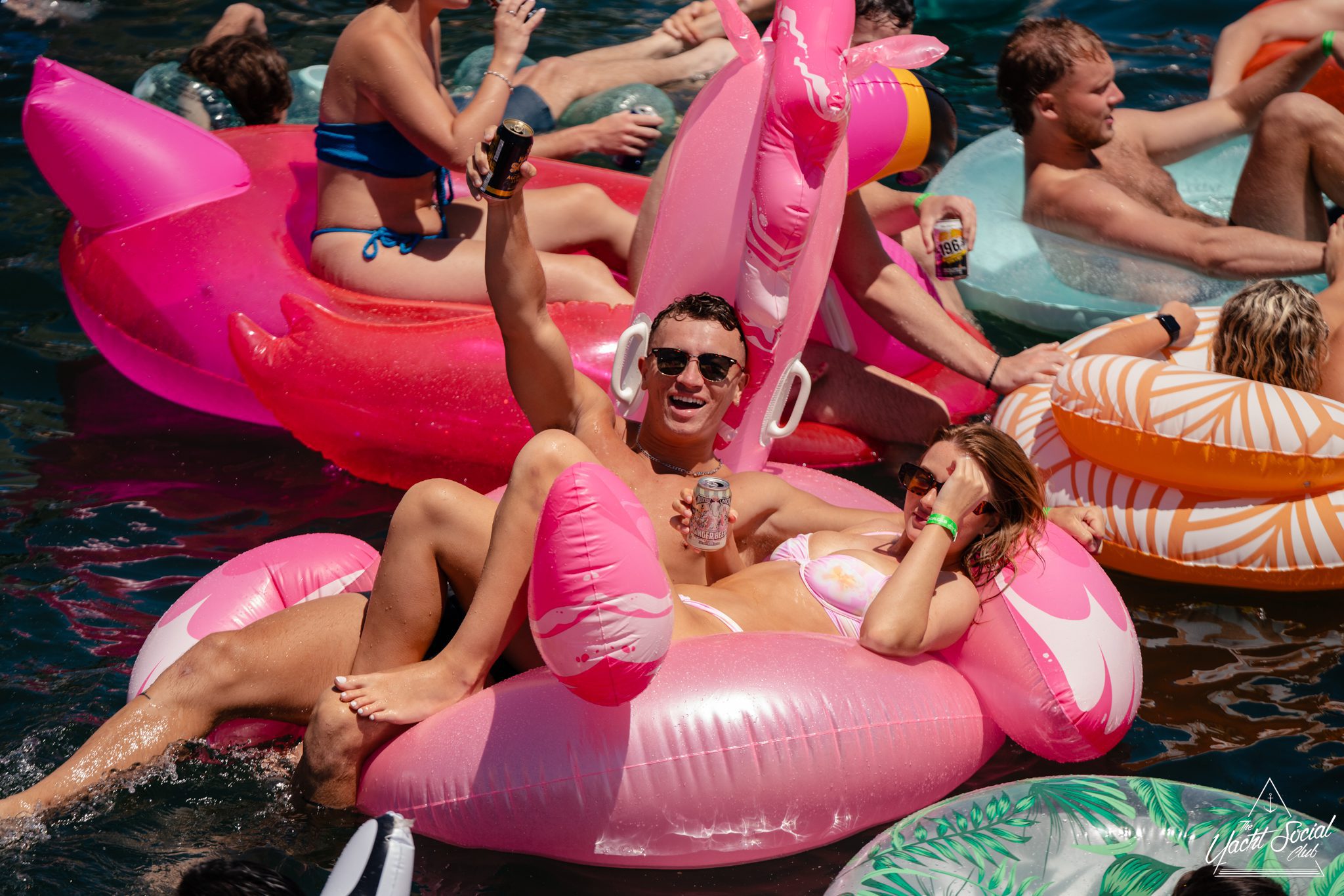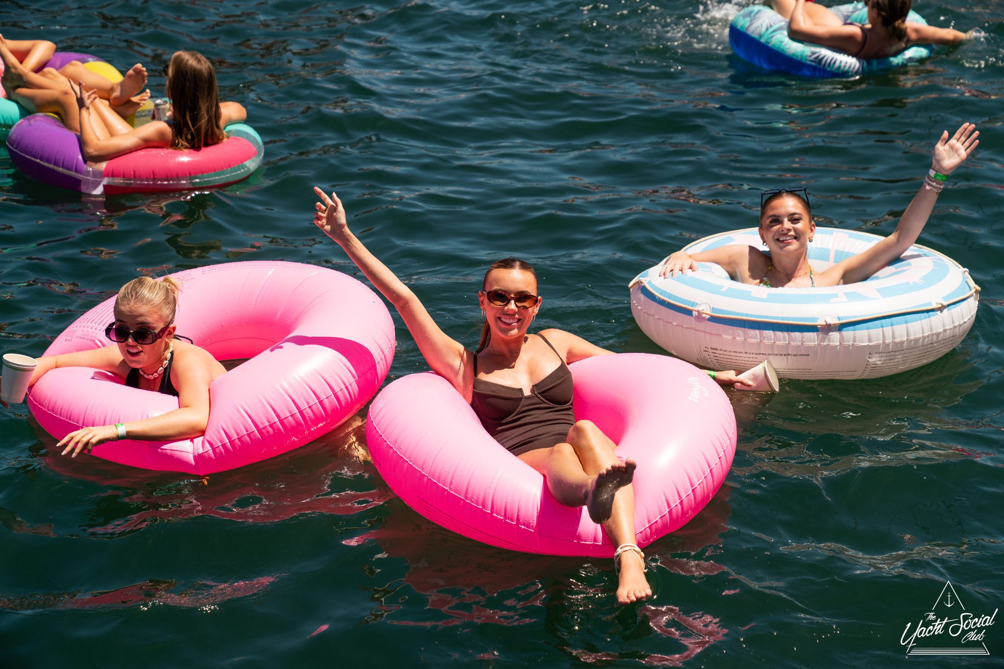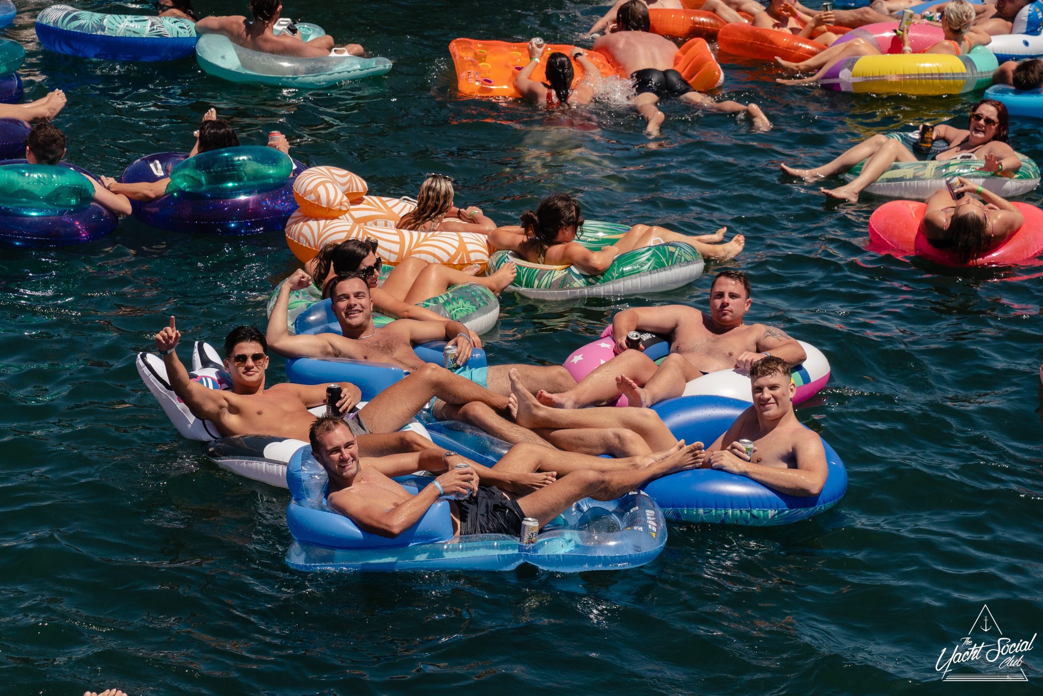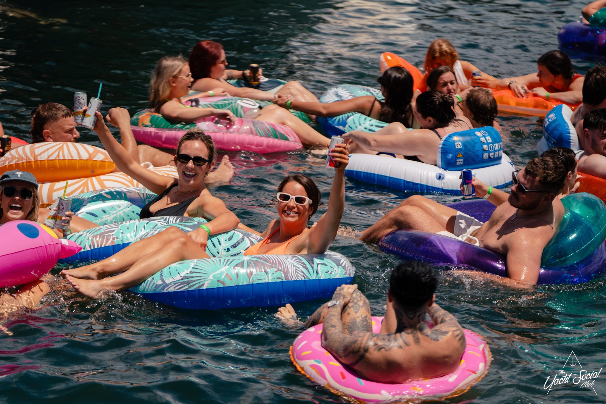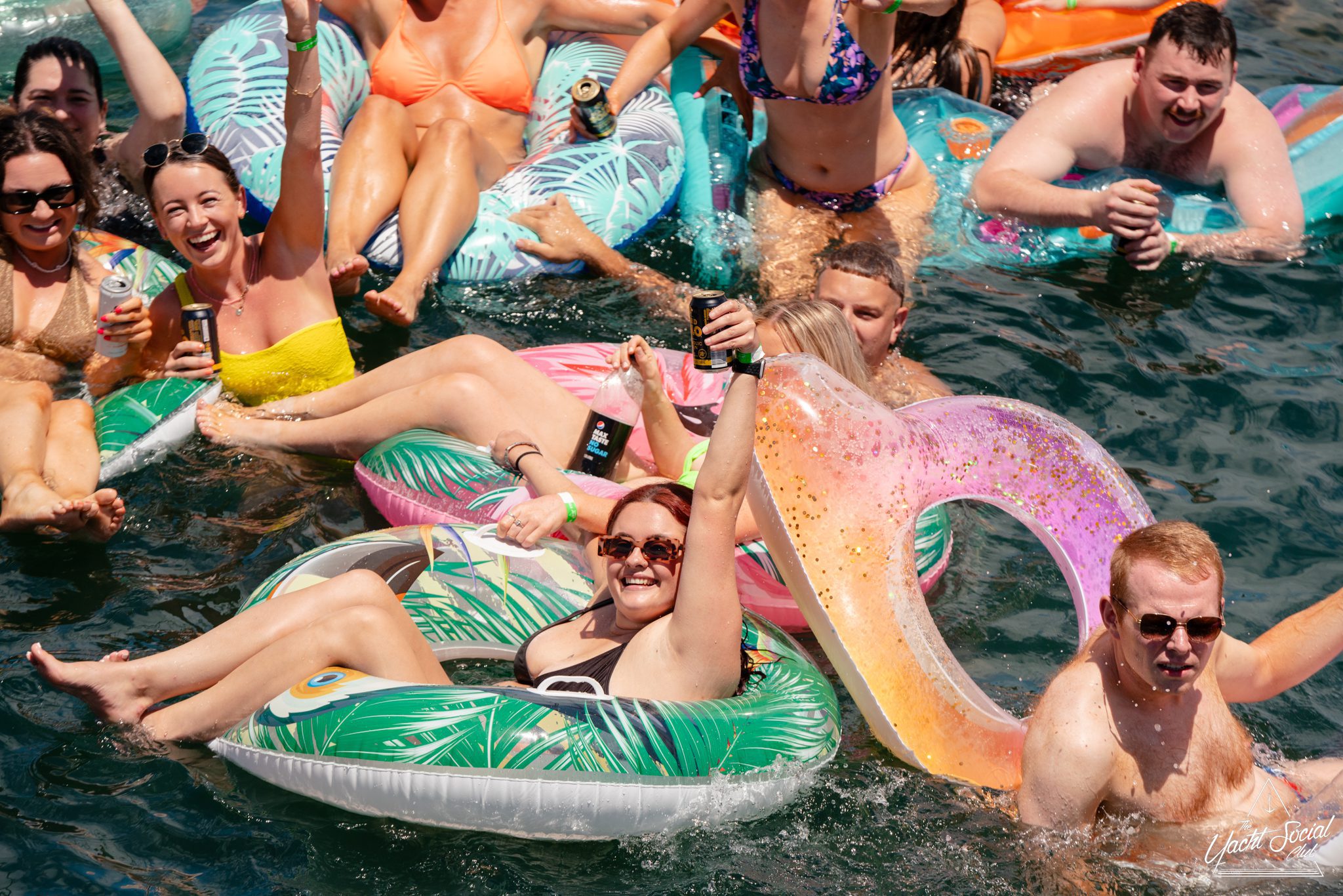 A group of people enjoying a day on the water, lounging on colorful inflatable rings and floats. They are surrounded by boats, with some people waving and smiling at the camera. The sky is clear blue, and everyone appears to be having an amazing time under the warm sunshine.
